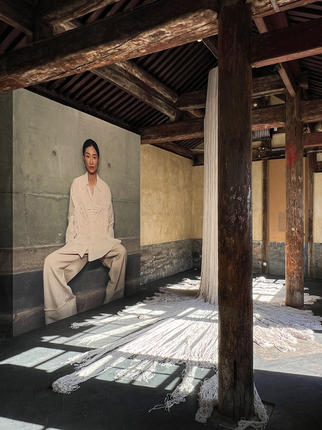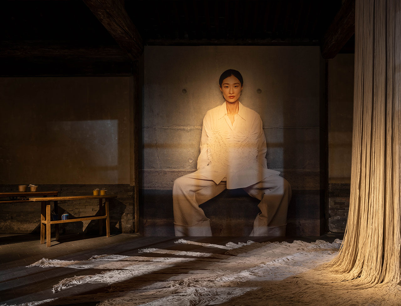 向院落深处行进是一个远离都市喧嚣却兼具社交性的空间,悬挂于横梁之上的是我们以林芳璐的作品为灵感创造的大型织物装置,手工技艺融入建筑语汇。空间被勾勒成了一个可步入的艺术装置,不仅是联名系列的美学延伸,更是视觉上的焦点,带领观者深入纺织艺术本质的同时还为顾客提供了一个绝佳的打卡空间。