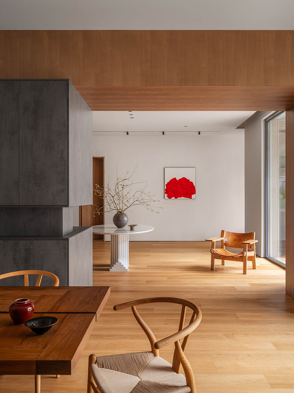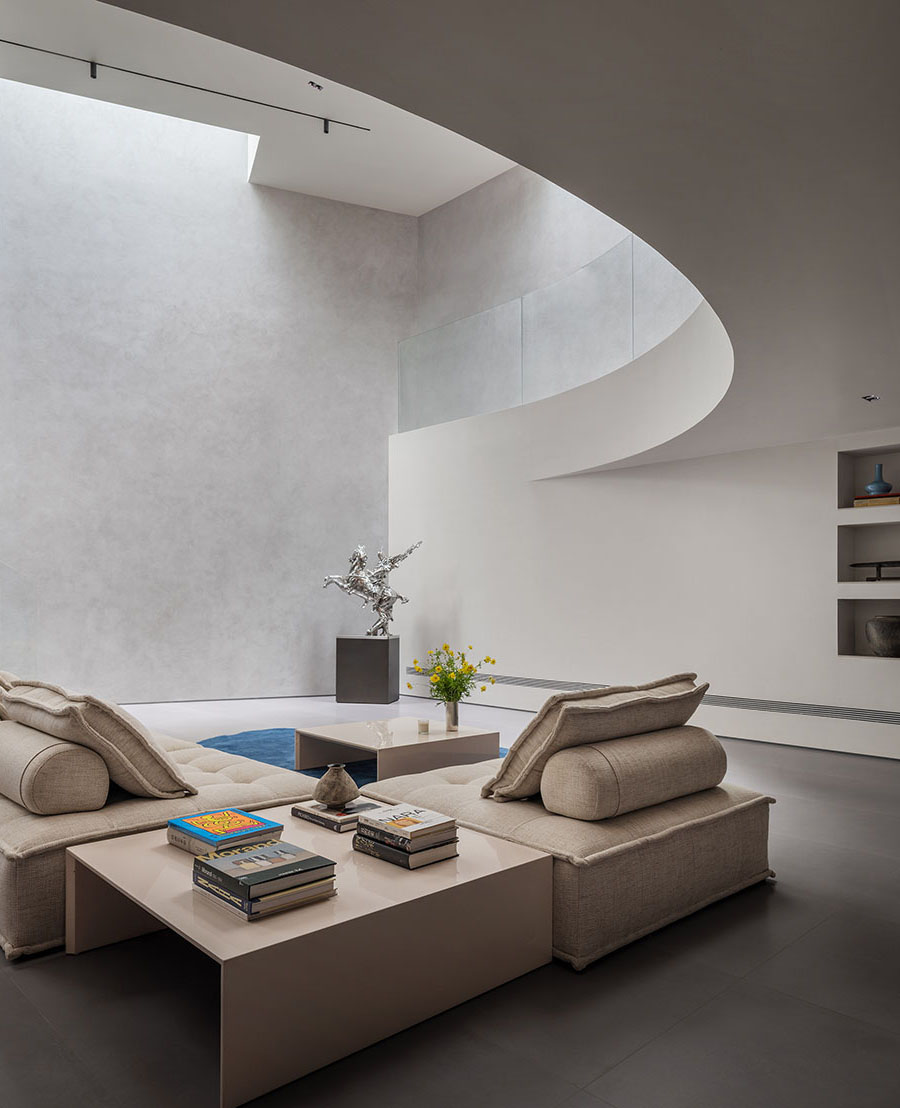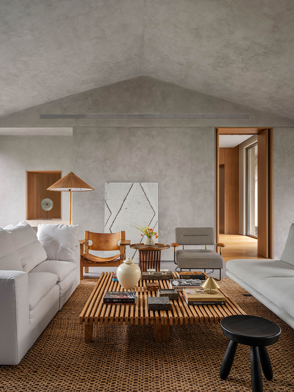 与之相对,上层容纳了住宅中更传统的房间:卧室、浴室、厨房与起居空间。这些是休憩与私密之所,结构、比例与材料带来舒适与庇护。高大的门洞与门槛分隔并连接着房间内的房间——衣帽间、书房与其他角落——呼应日常生活的丰富层次。