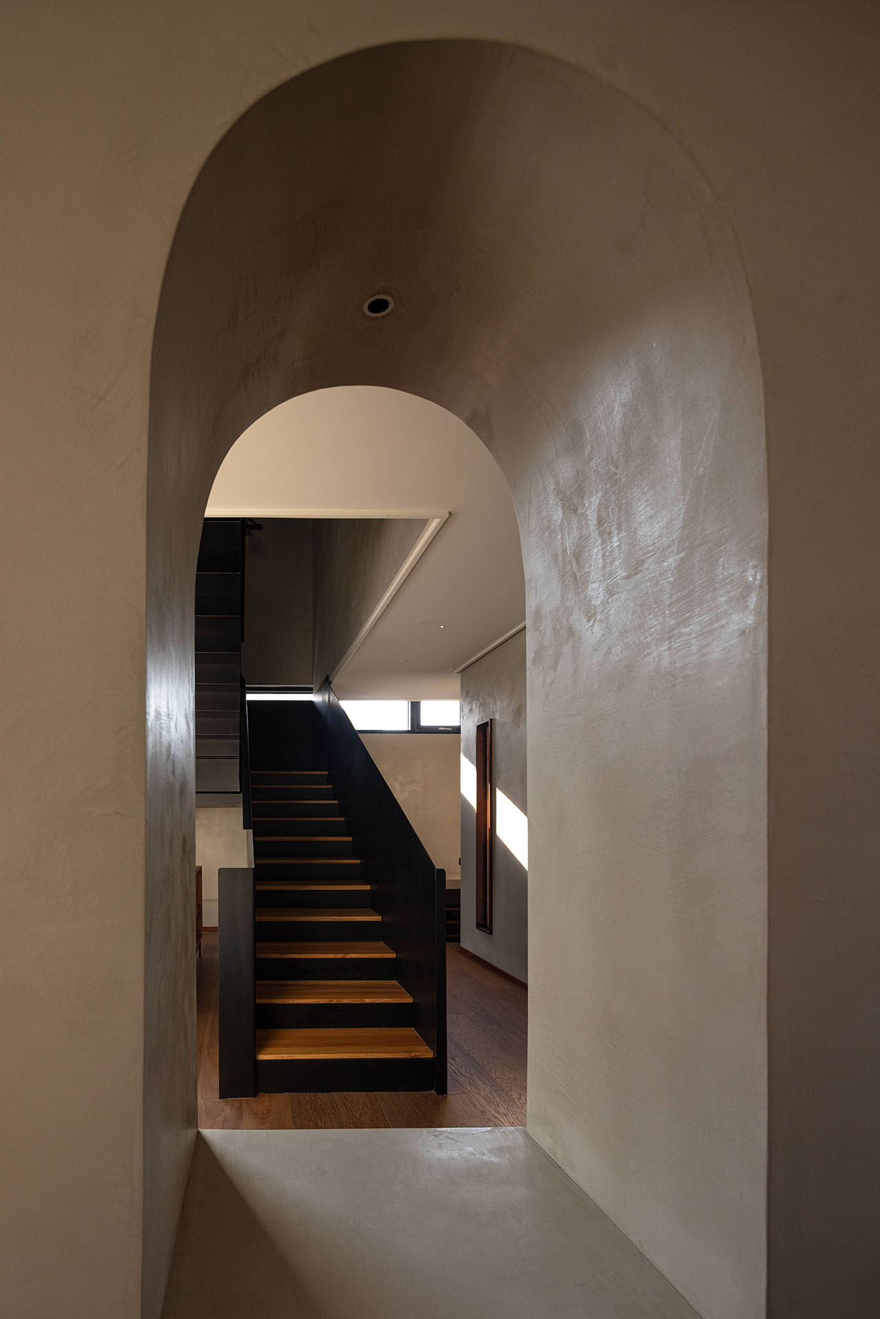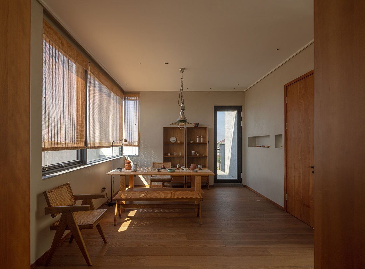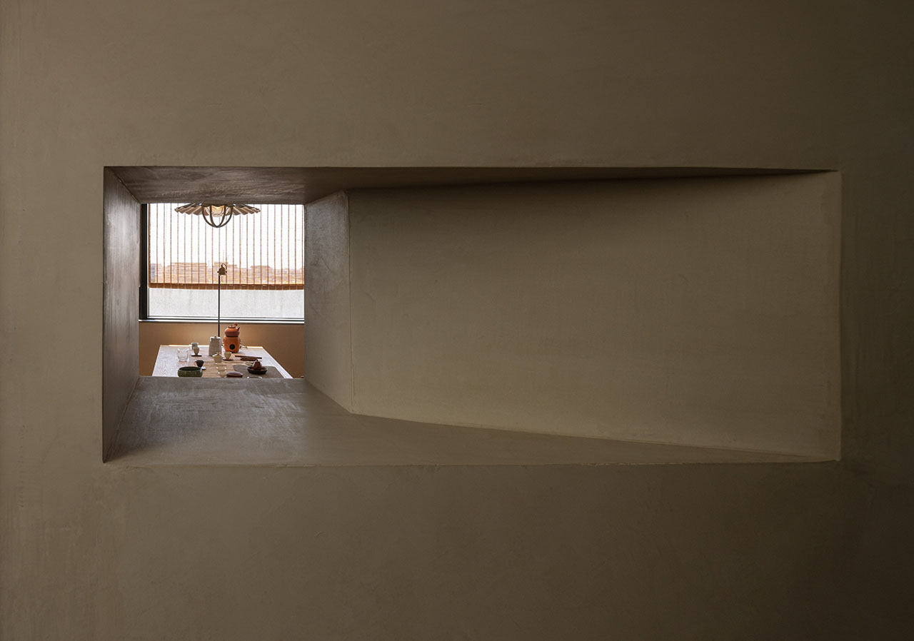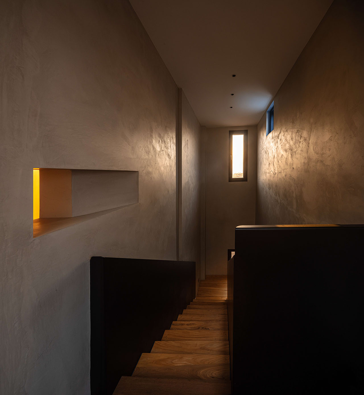 建筑内部开不同尺度的窗,首层落地窗消除室内外边界,横向长窗望向树干,也让晨光铺展于餐桌之上;三层天窗洒下菱形光斑,于夏日降临至茶室墙面;而楼梯间竖缝窗,则将阳光压缩成一道“光刃”,与墙面肌理相融,在楼梯间营造“神性场所”。在日常与精神之间,留出余地。