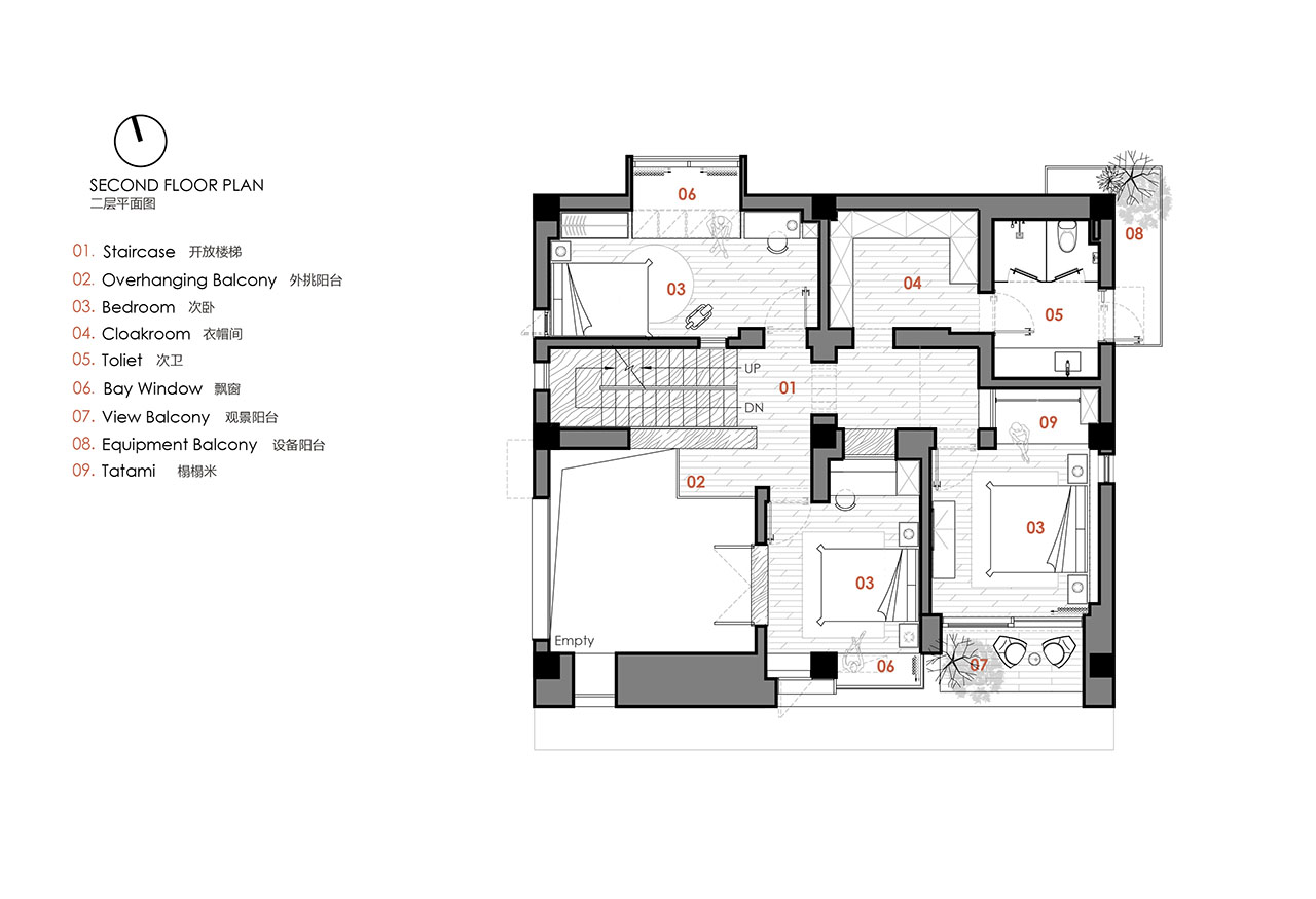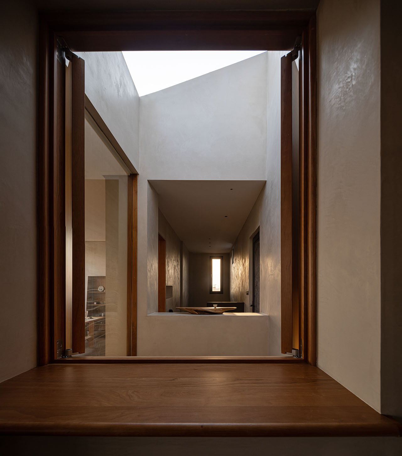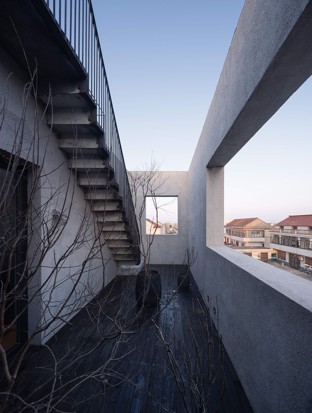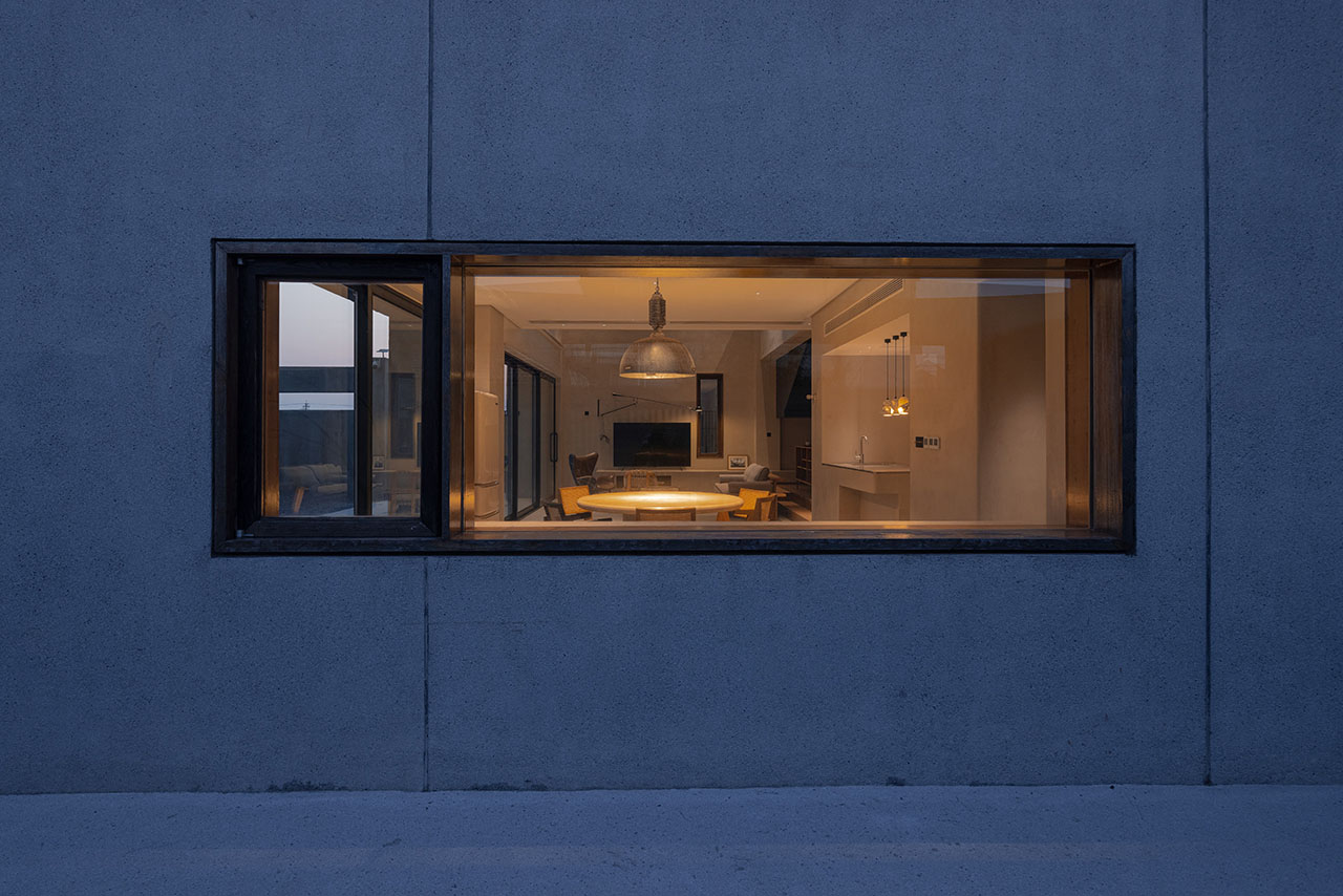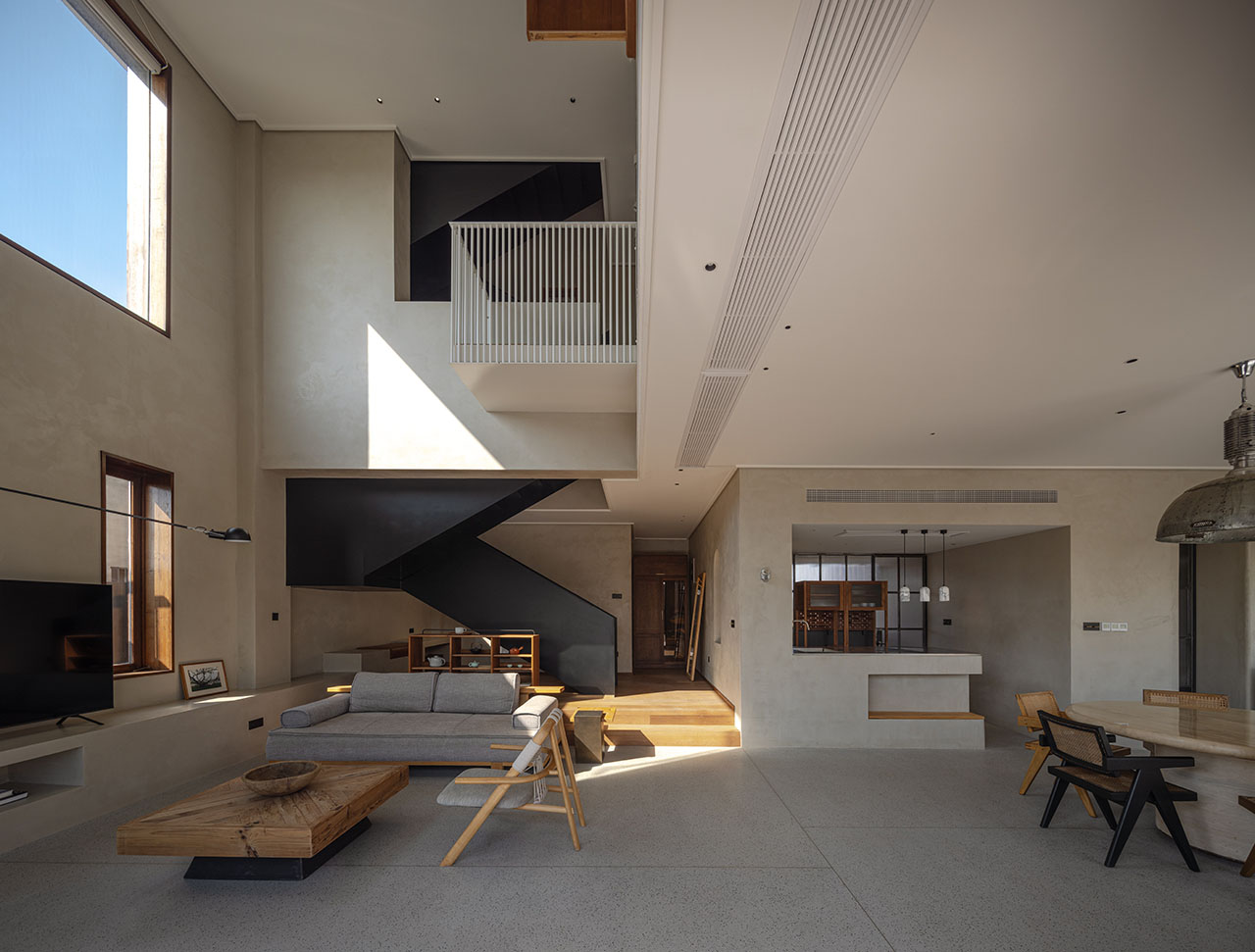 谦逊的外在形态下,有丰富的内在空间组合。功能克制,三层空间仅设6个房间,余下面积均留给公共区域。以天窗为轴,三层楼间散落起居室、睡眠区、休闲区,以楼梯与窗串联,呼吸流动。