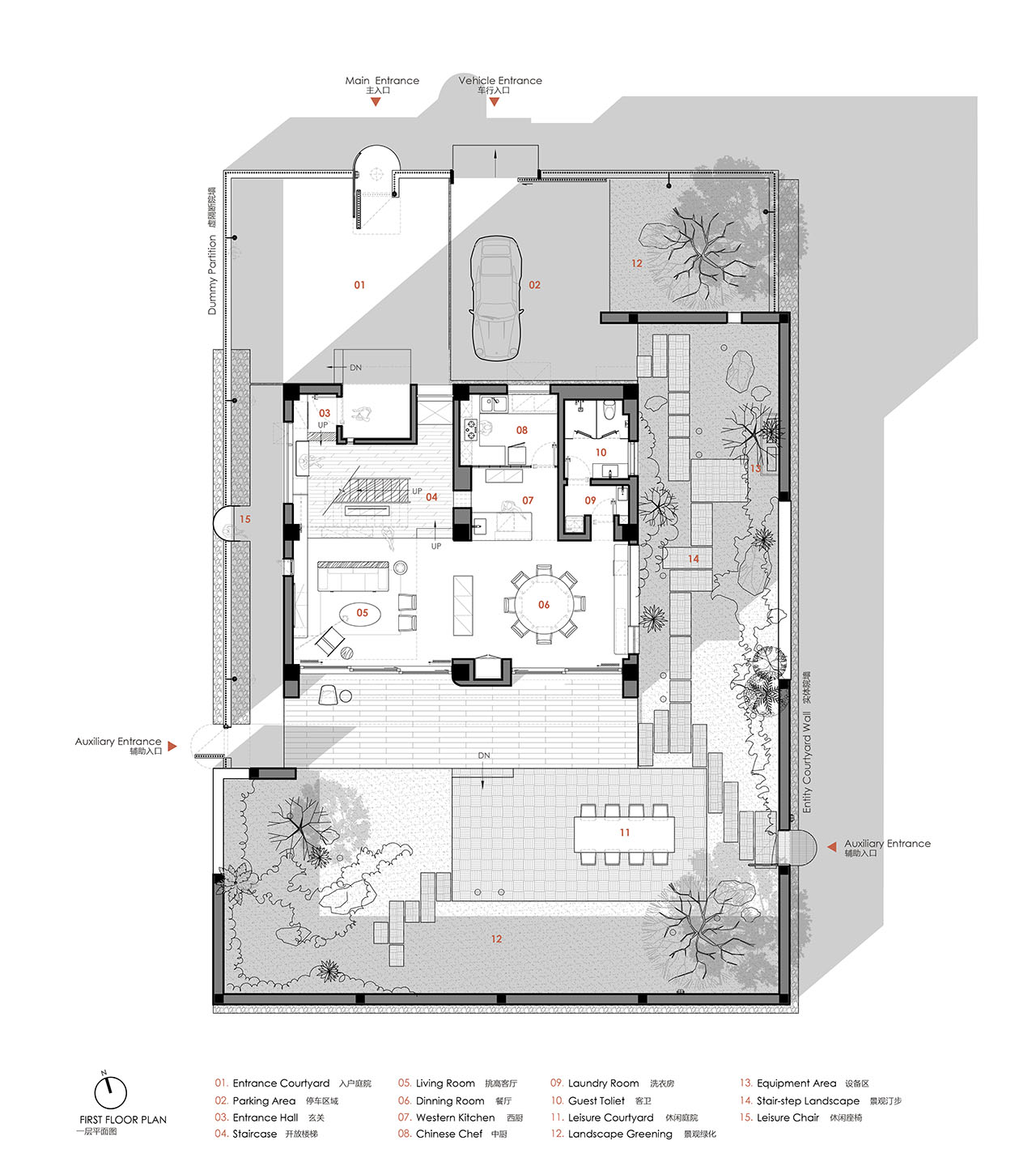 底部“泥土层”:室内水洗石地面延伸至院外,模糊公私边界,呈半开放式院落。