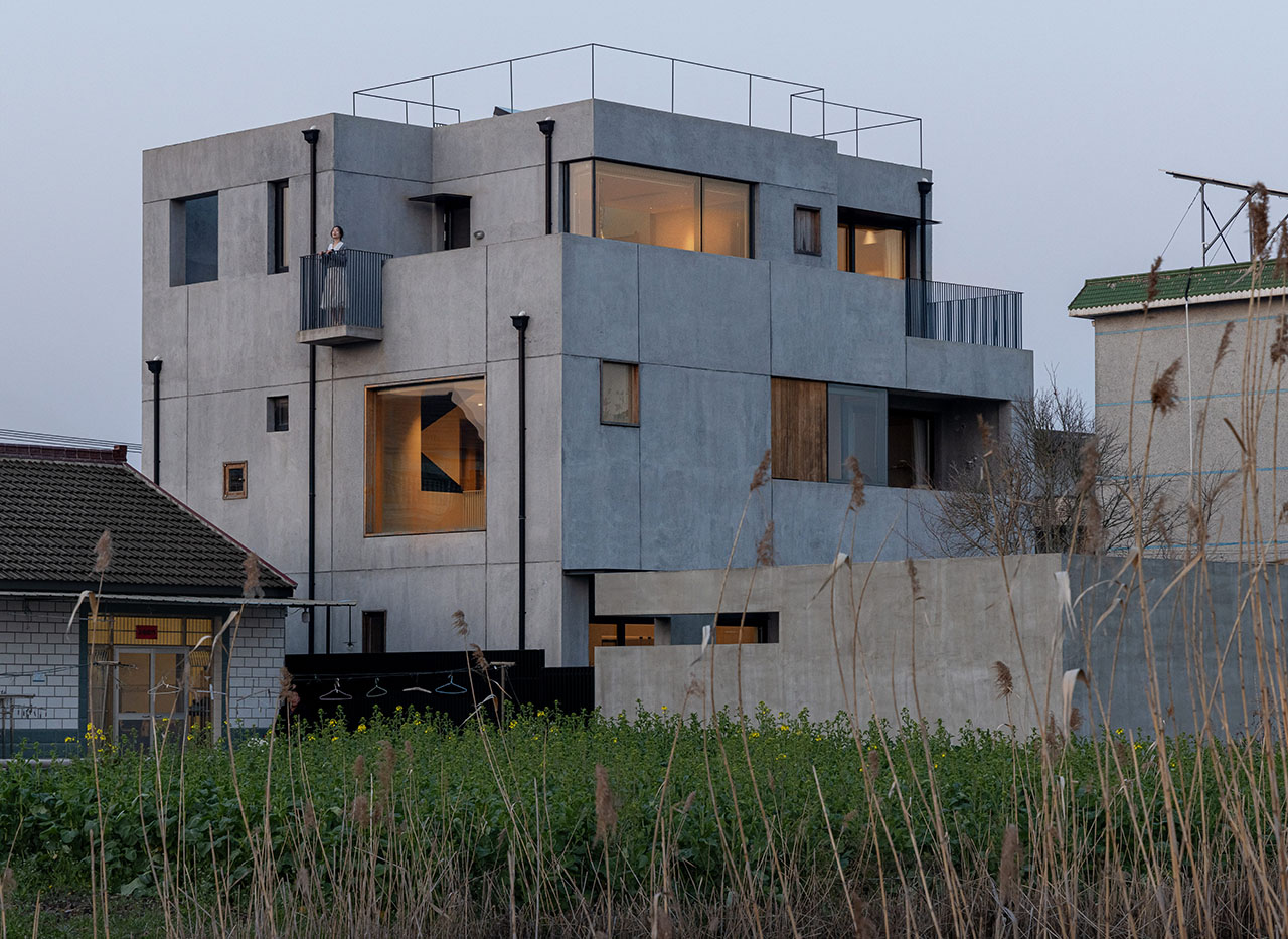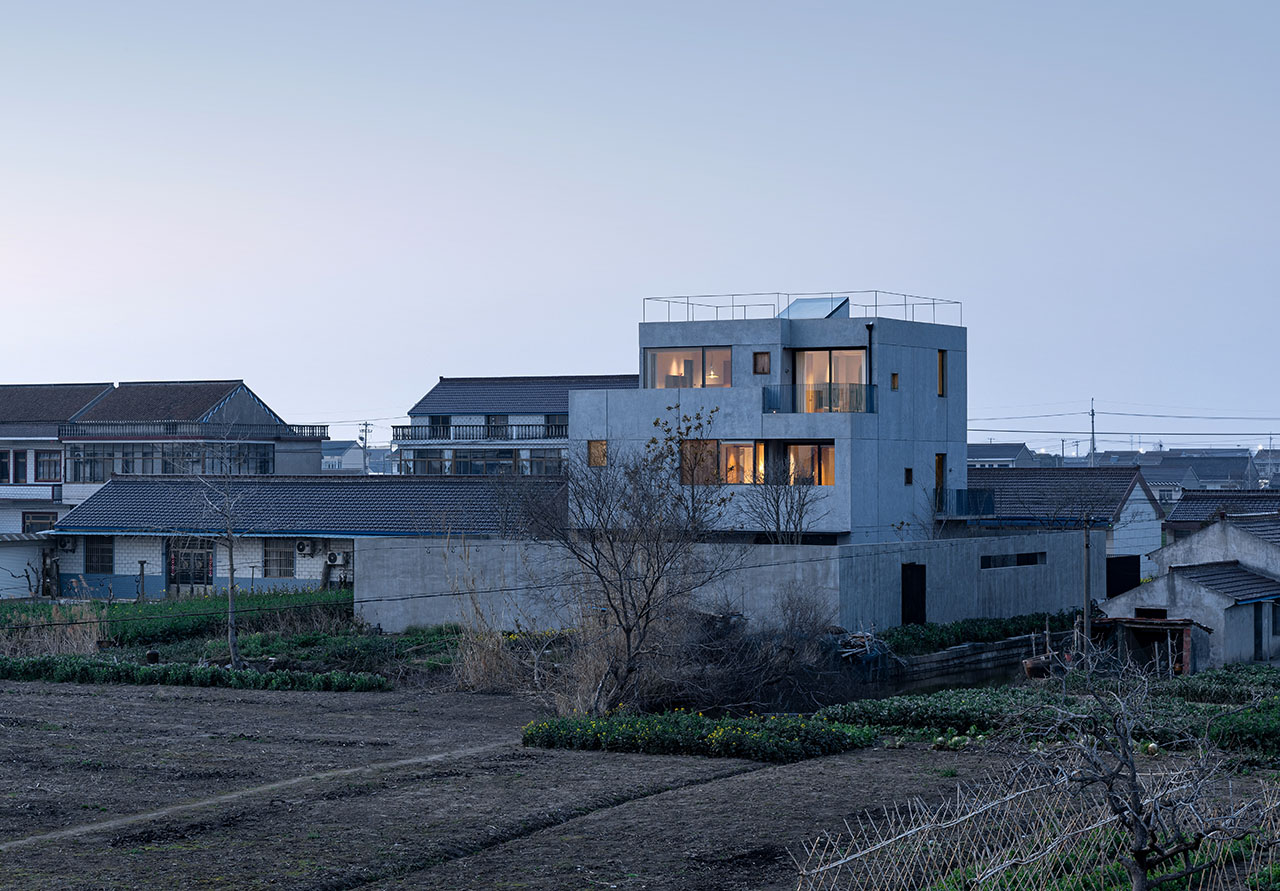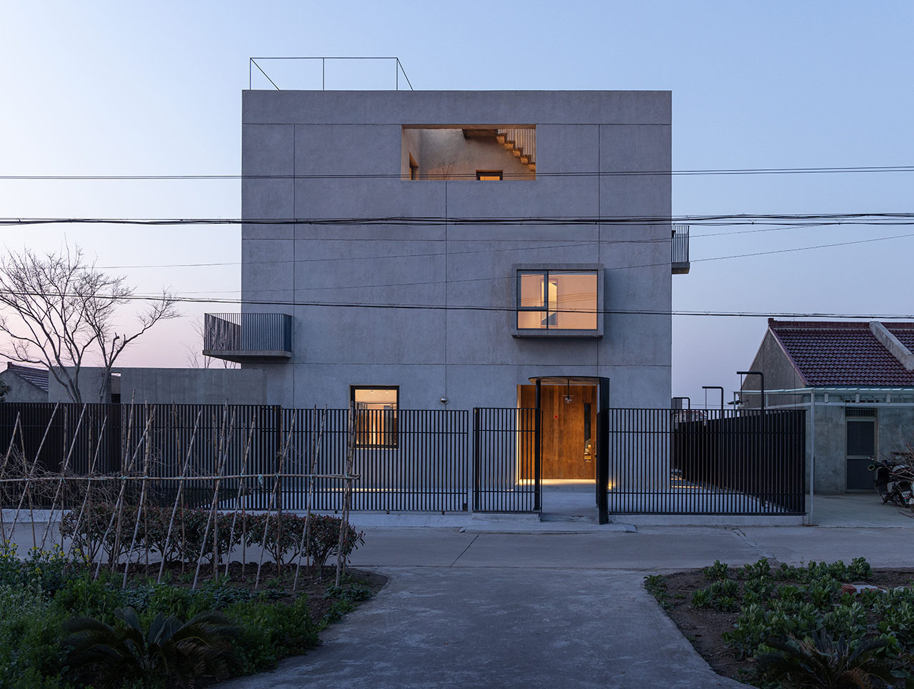 建筑采用三层框架结构,遵循周边农宅的体量比例,通过多视廊渗透消解体量感。屋顶线与邻居房屋齐平,谦逊介入村落。