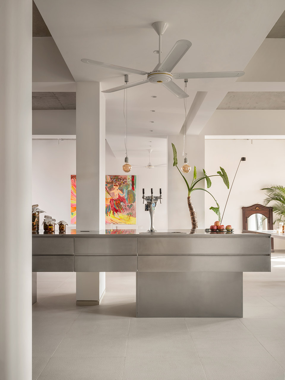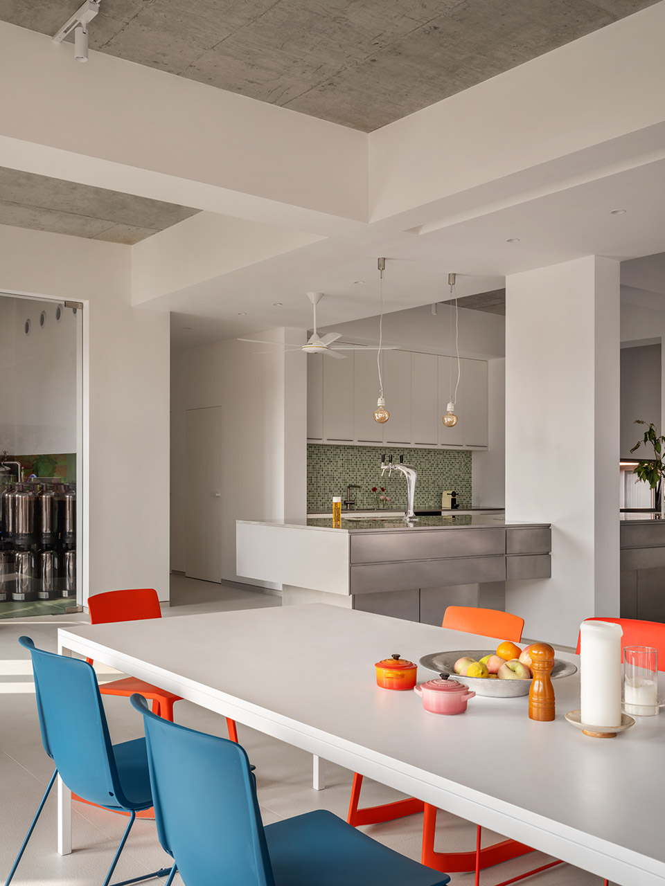 原有地块上有一栋180平方米的主房和一栋120平方米的小房子,还留下了270平方米的户外花园空间。主房经过拆除和加固后,保留了简单的柱体和板状结构,主要作为灵活的开放式生活空间。通过大玻璃隔断与生活区分开,一个设备齐全的酿酒室正对着客厅,成为展示酿酒工艺的区域。三台100升的酿酒罐可以酿造各种啤酒,从皮尔森、拉格到IPA,甚至无酒精啤酒都不在话下。