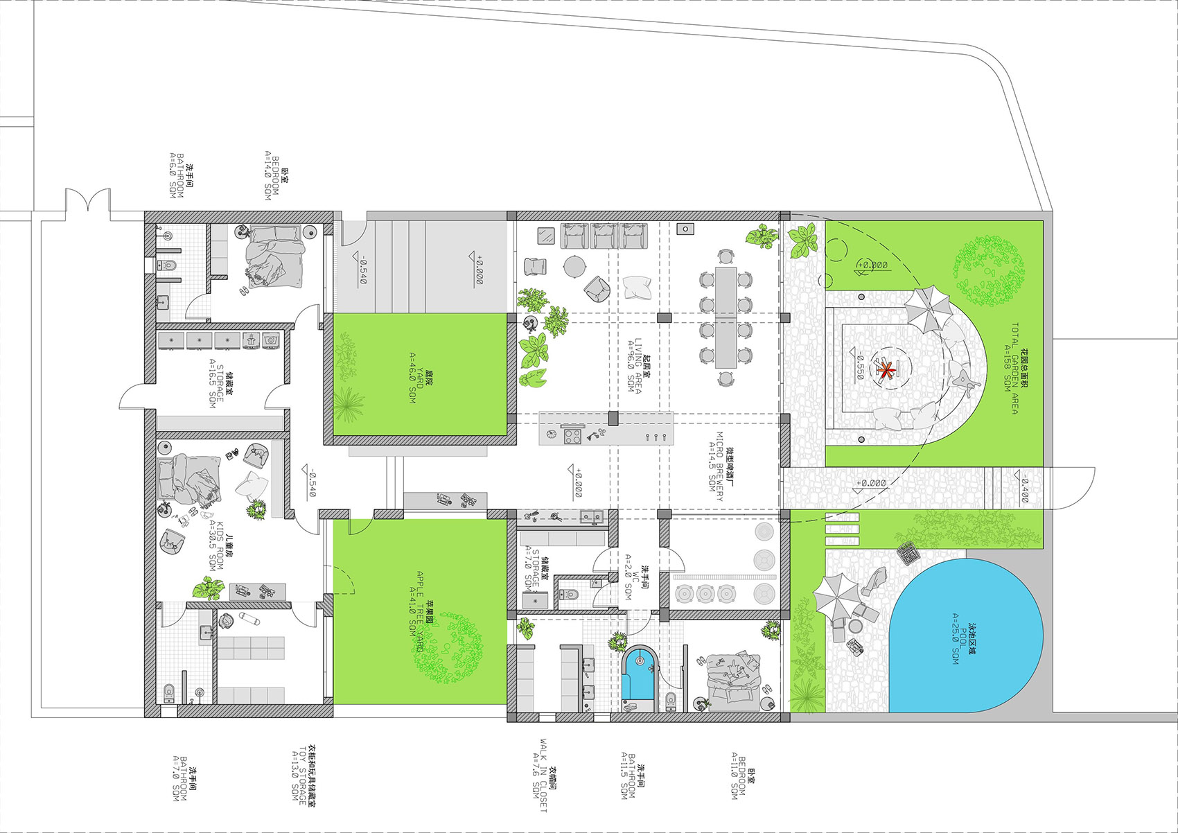 面积:320平方米居住面积、270平米户外空间