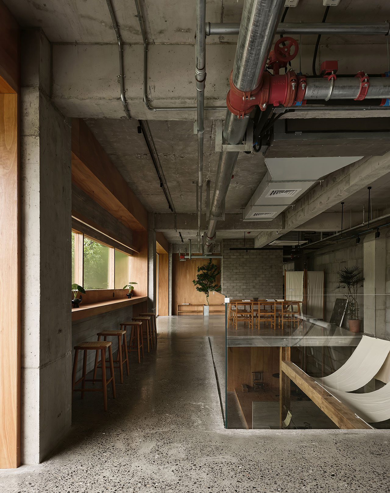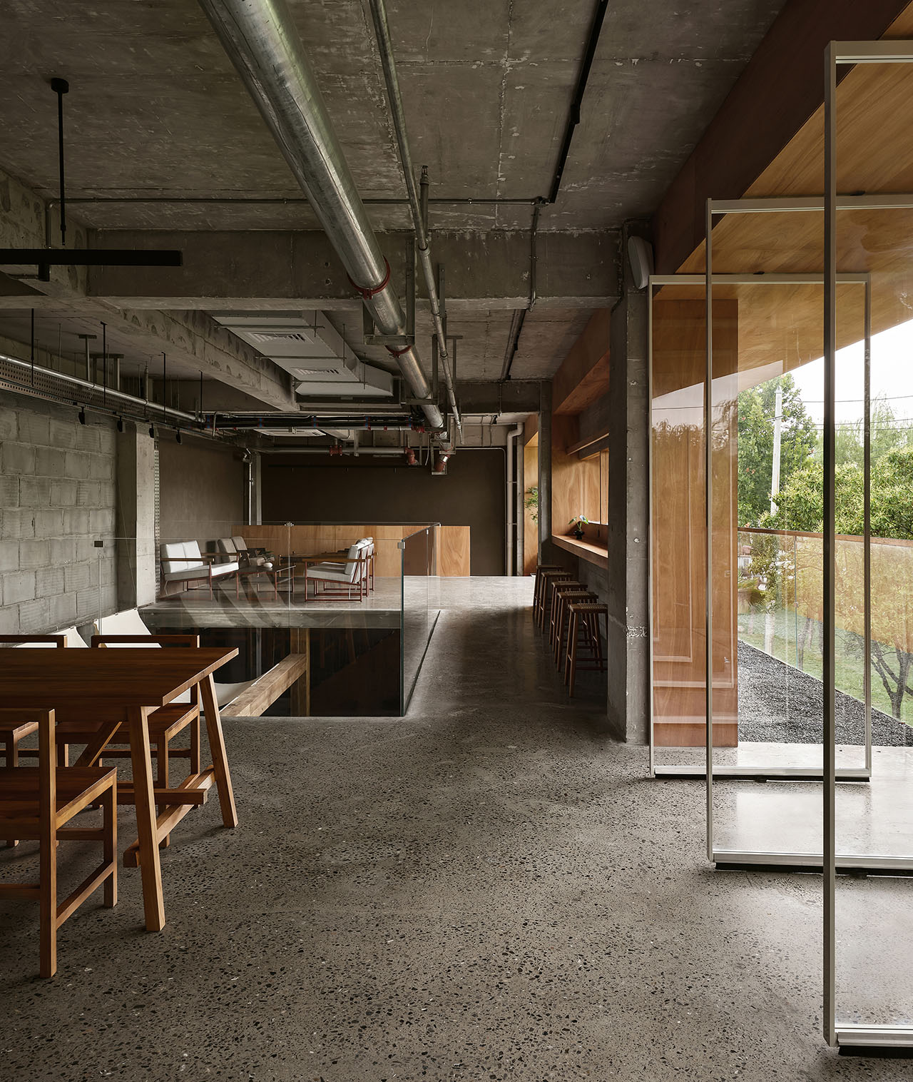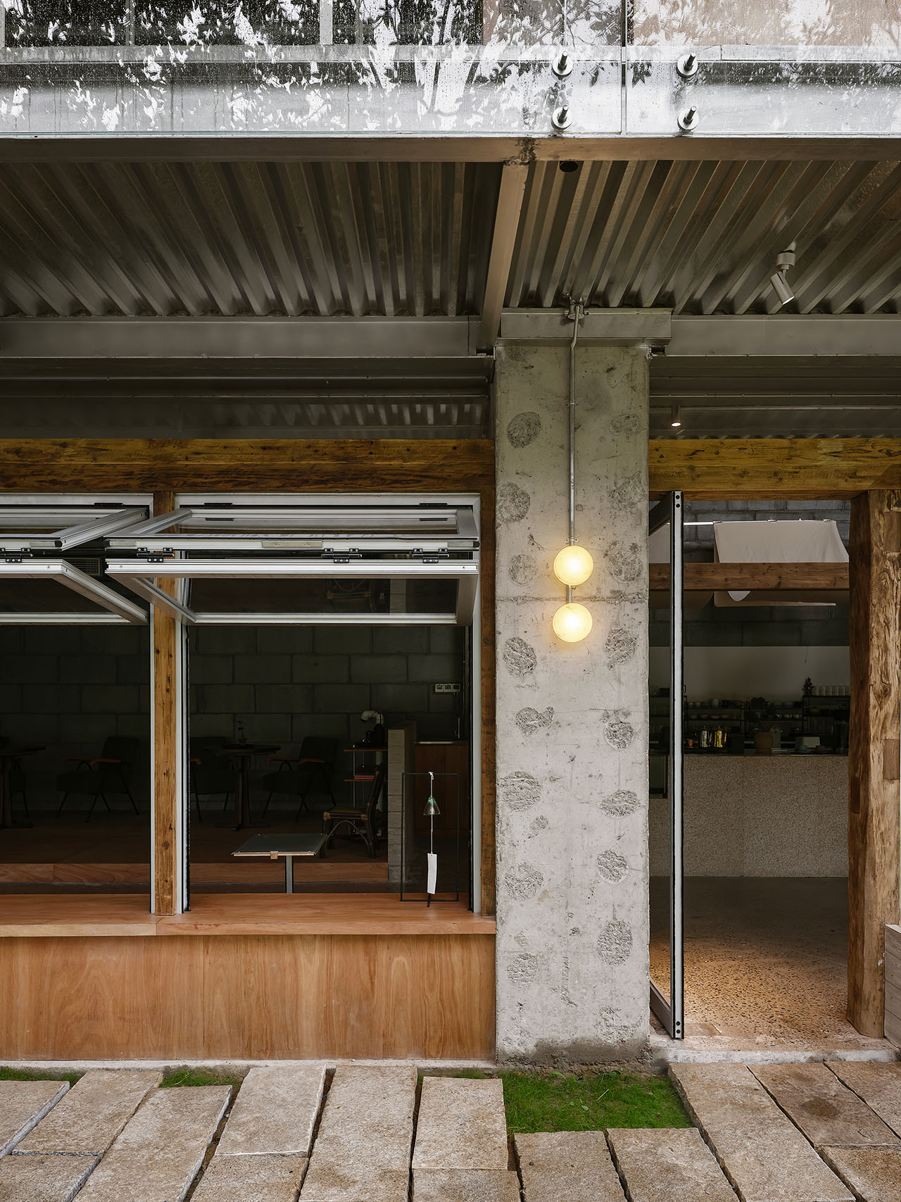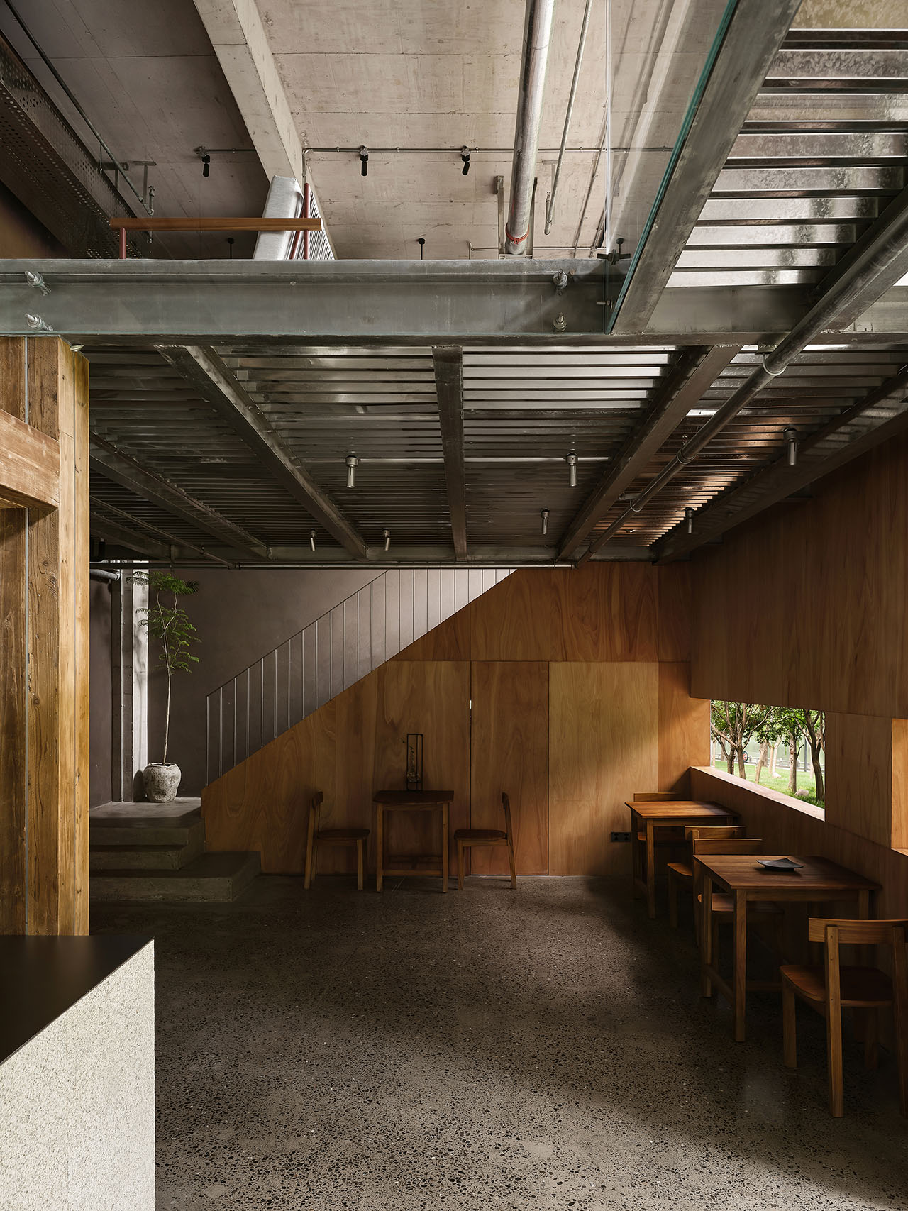 对此咖啡厅的初印象,是因多重材料糅合形成的矛盾反差感。当环顾周遭,继而产生新的印象,融合了木质、混凝土与金属等材料的空间,实现工业气息与人文温度的有序平衡,像是大胆混搭的着装,却出乎意料的协调。