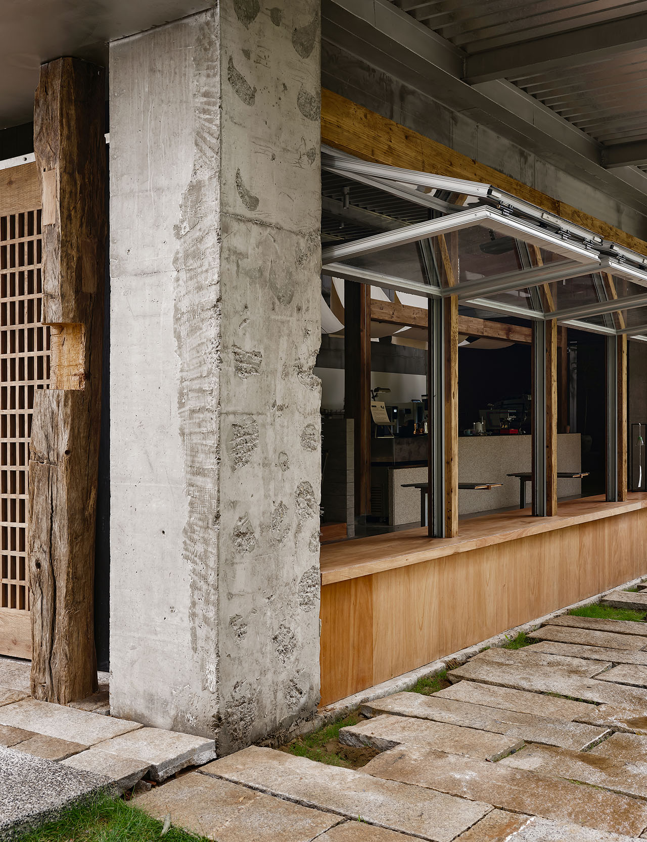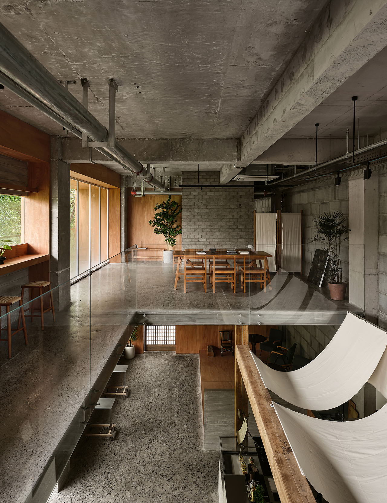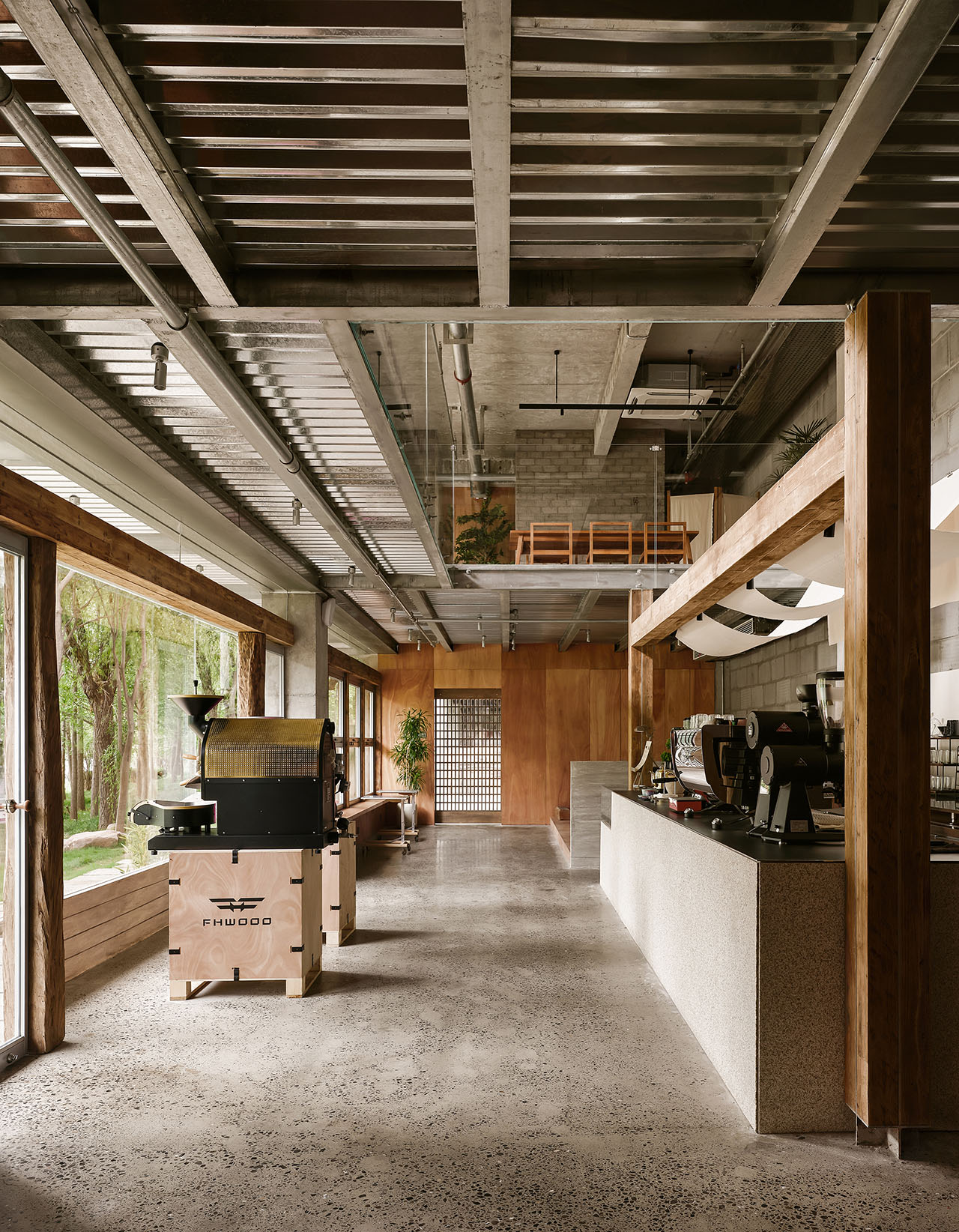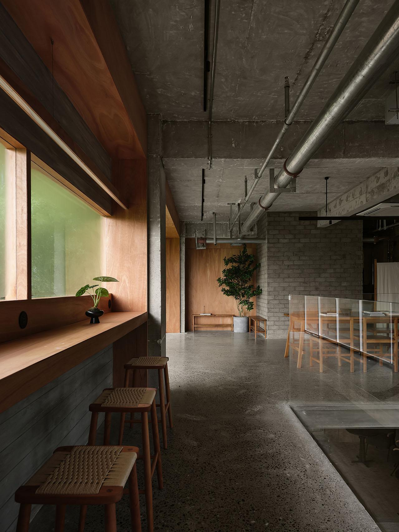 对此咖啡厅的初印象,是因多重材料糅合形成的矛盾反差感。当环顾周遭,继而产生新的印象,融合了木质、混凝土与金属等材料的空间,实现工业气息与人文温度的有序平衡,像是大胆混搭的着装,却出乎意料的协调。
