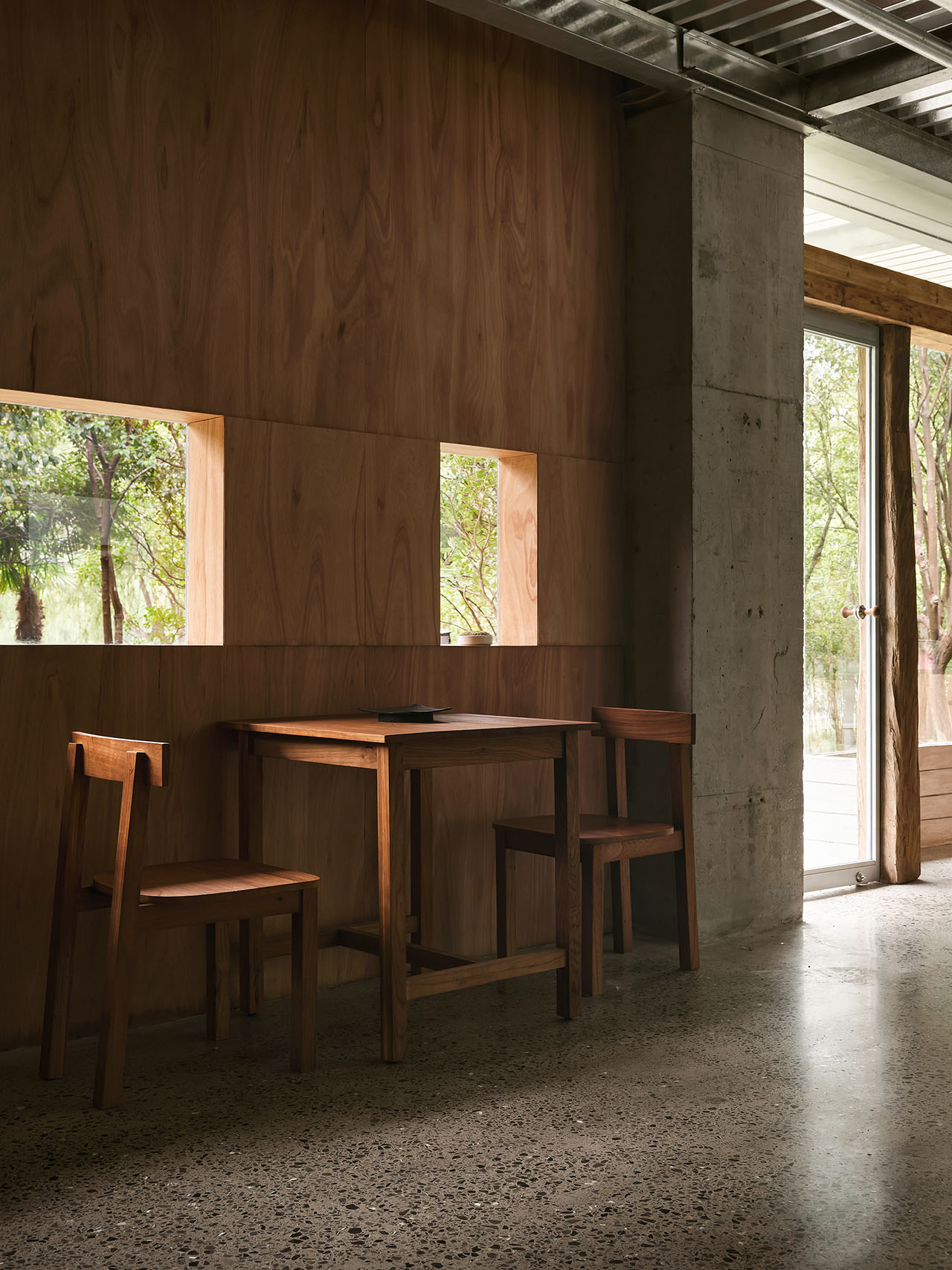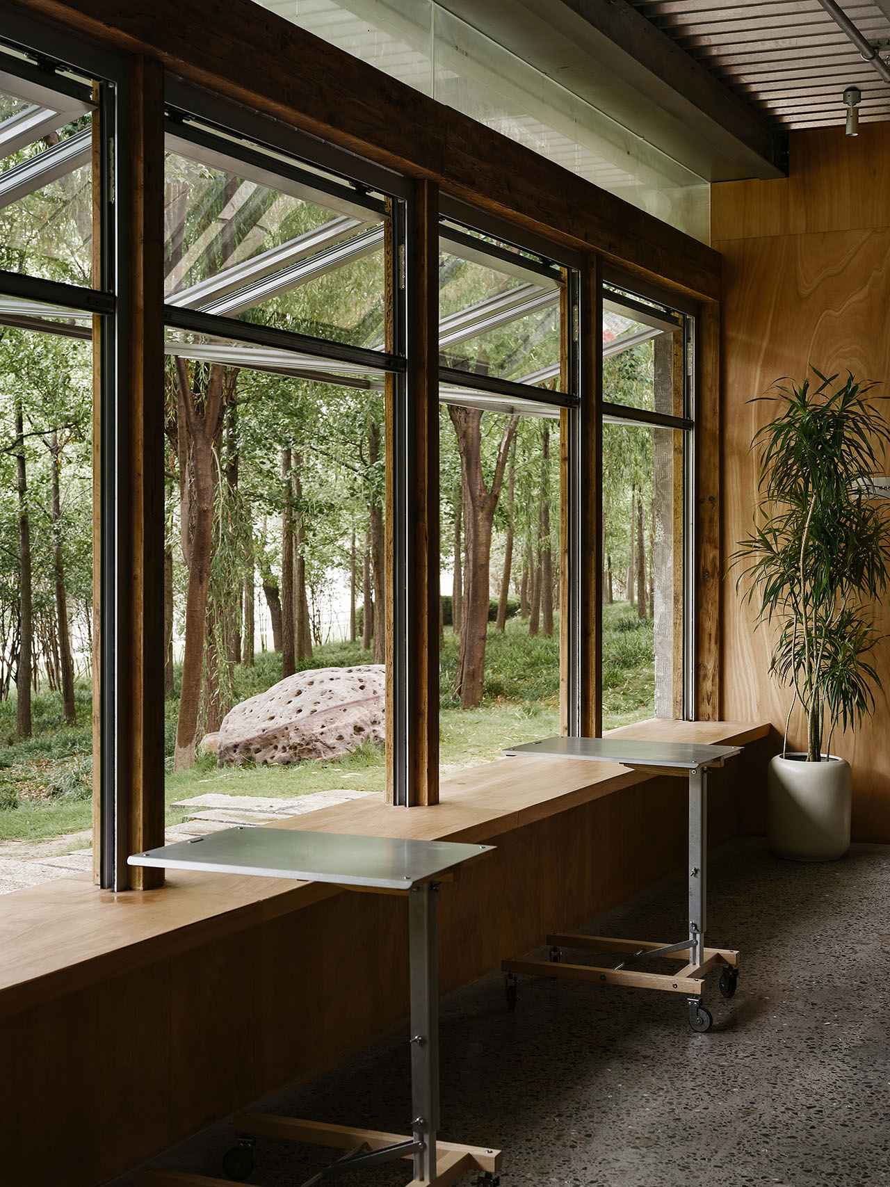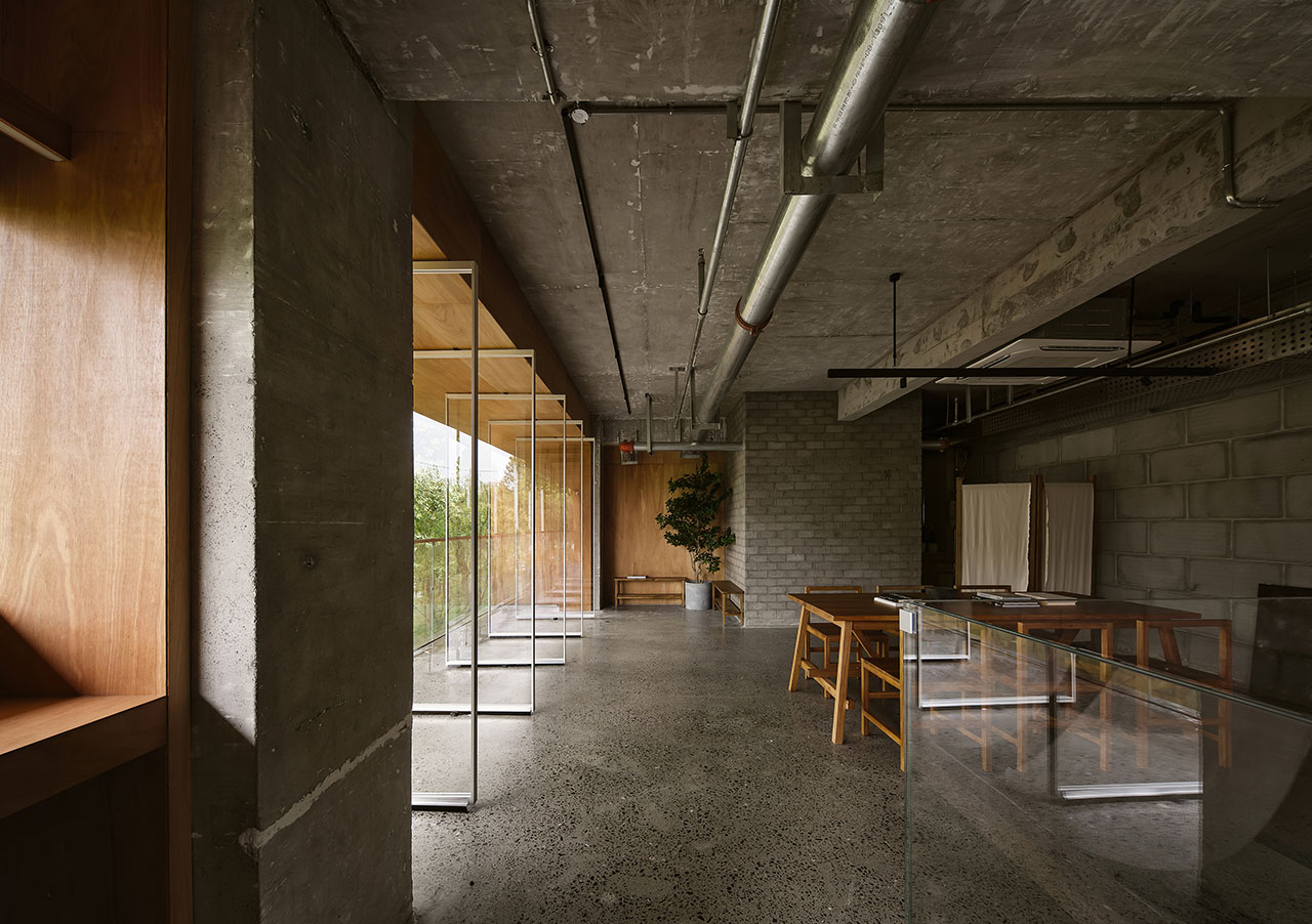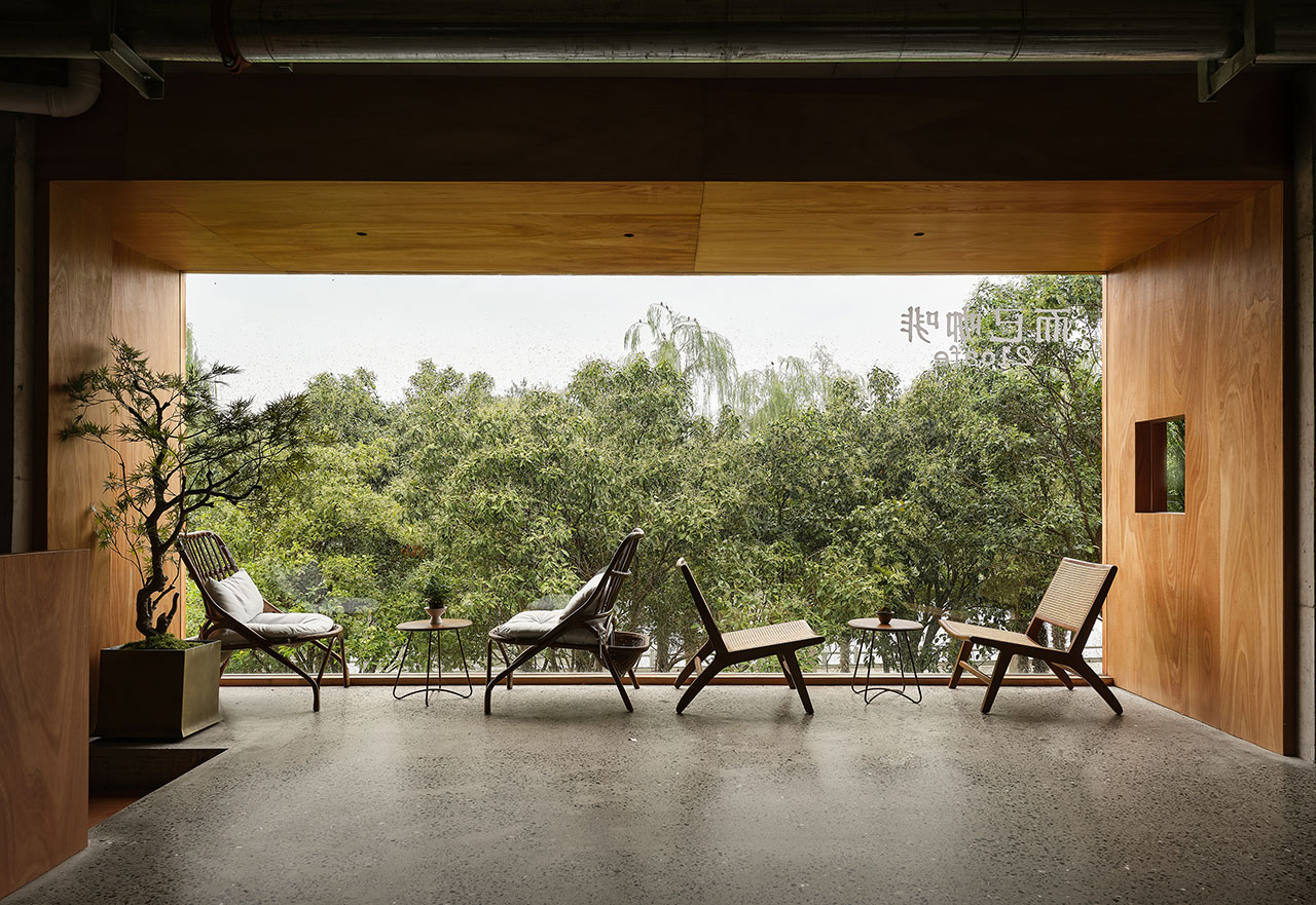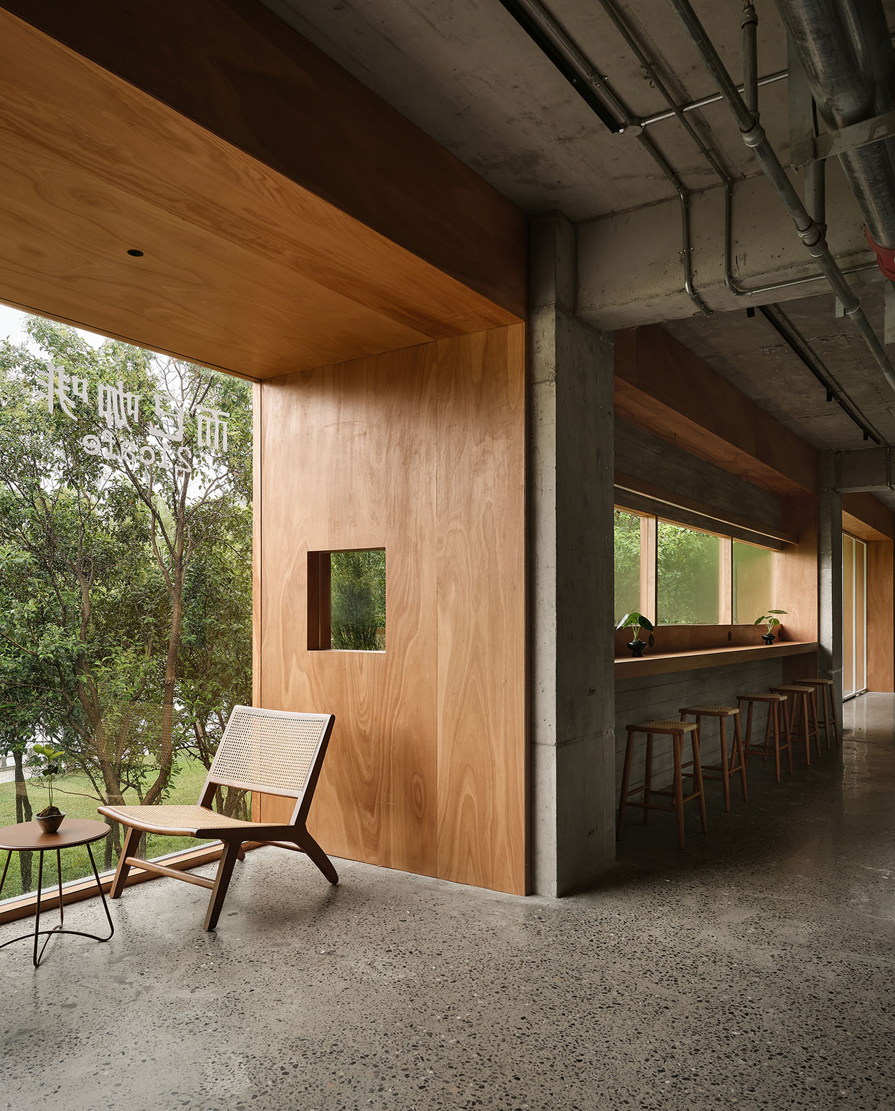 在整体空间,设计师通过构建窗景、弱化环境背景等方式,来捕捉人们对自然的关注。空间裸露混凝土的硬朗背景 ,更加凸显出木质的温度感,提示着人们去看见窗外流动的风景,枝桠摇曳,光影斑驳。