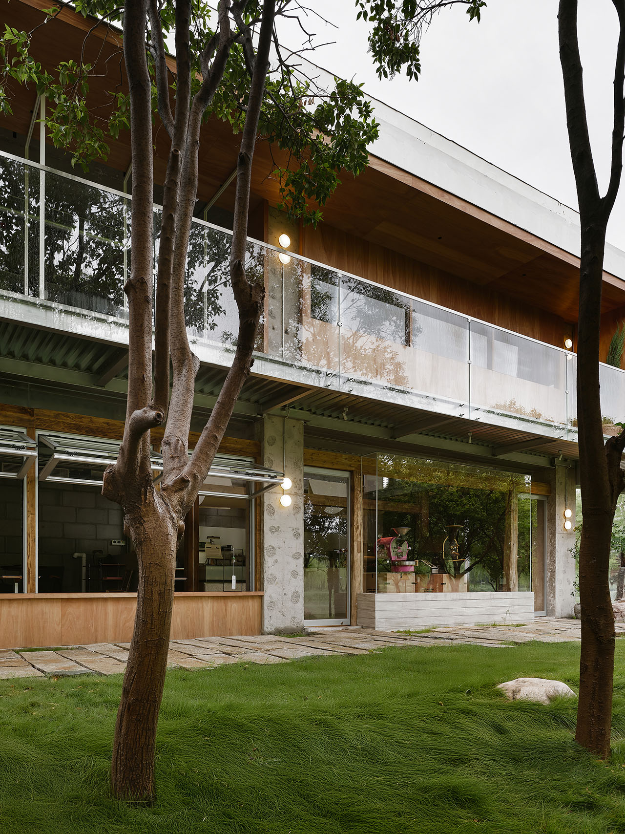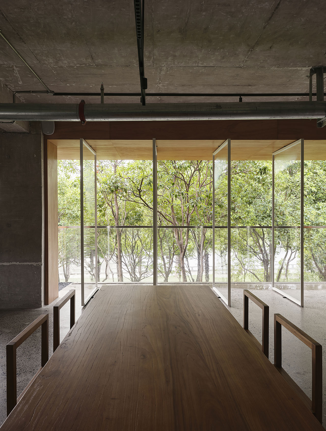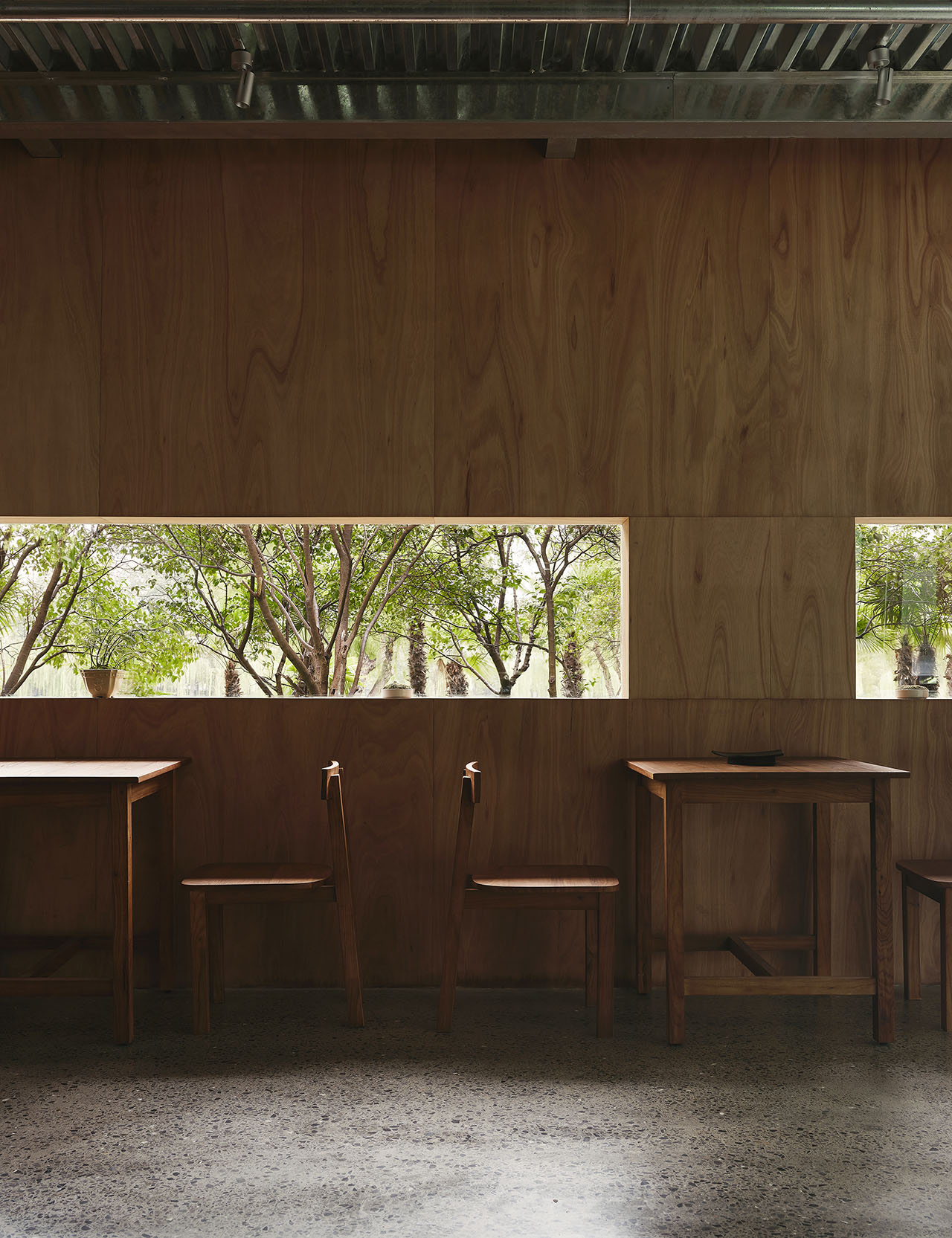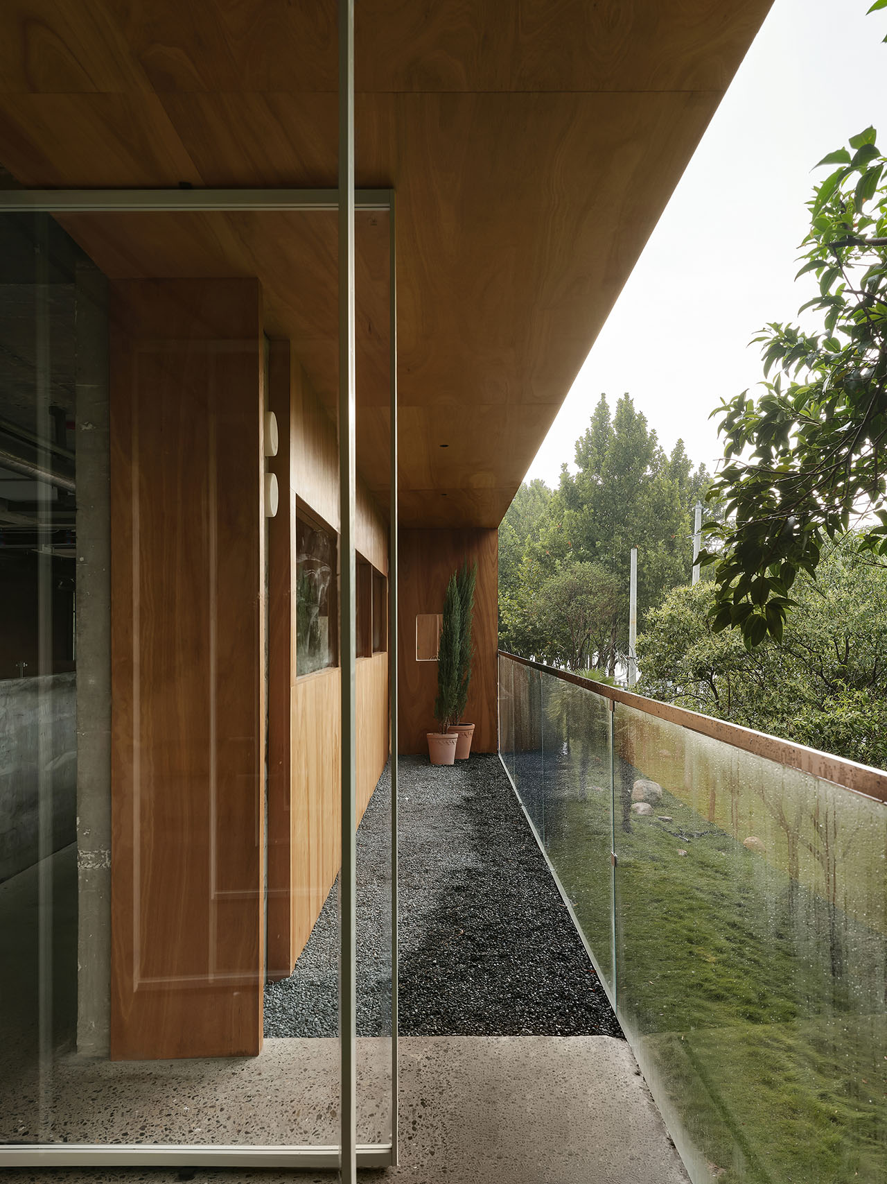 在整体空间,设计师通过构建窗景、弱化环境背景等方式,来捕捉人们对自然的关注。空间裸露混凝土的硬朗背景 ,更加凸显出木质的温度感,提示着人们去看见窗外流动的风景,枝桠摇曳,光影斑驳。