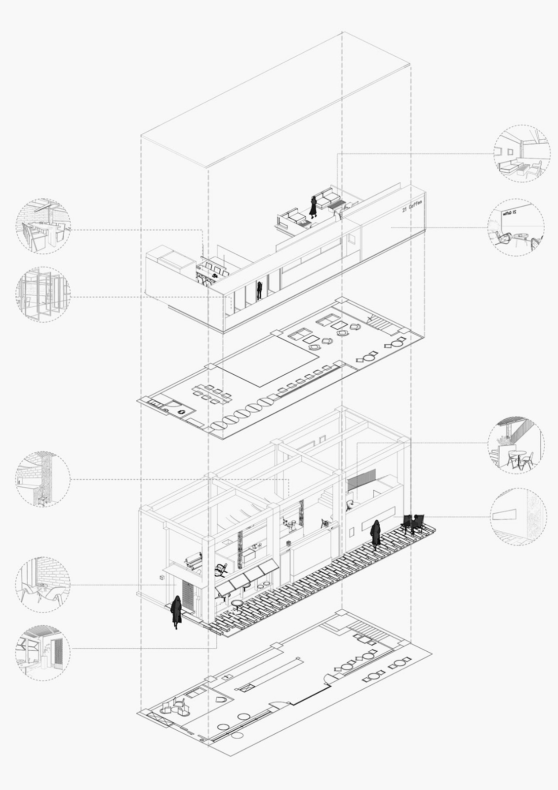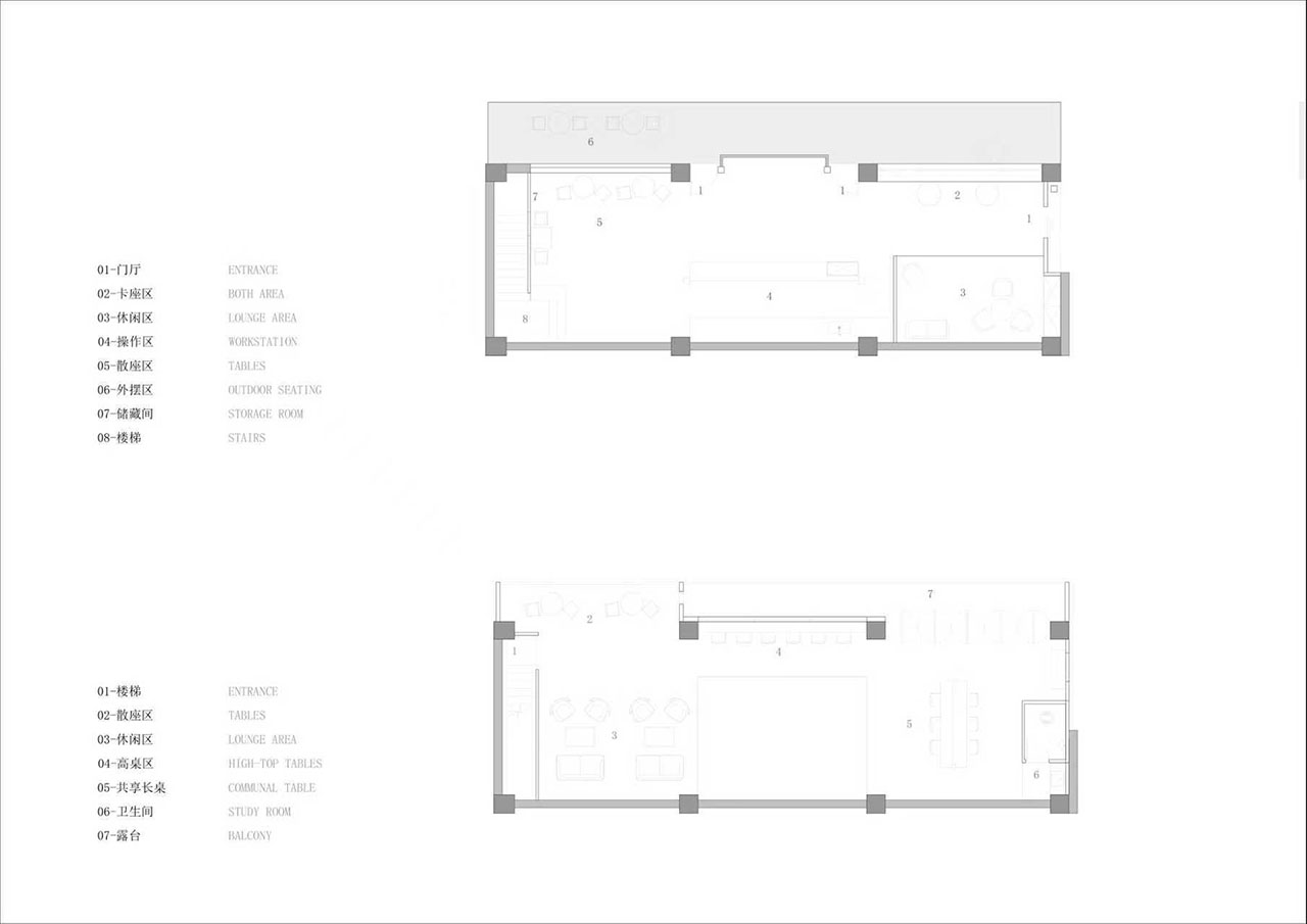在咖啡店主理人看来,咖啡馆不止有咖啡,还有咖啡背后的多元文化。为便于在店中陈列咖啡烘焙机,以及开展丰富的展陈活动,设计师将空间向外拓展,为吧台停留、顾客走动和产品展示留下充足余地,外部檐下空间、店铺外摆区也可开放,作为文化艺术跨界内容的场景“留白”。