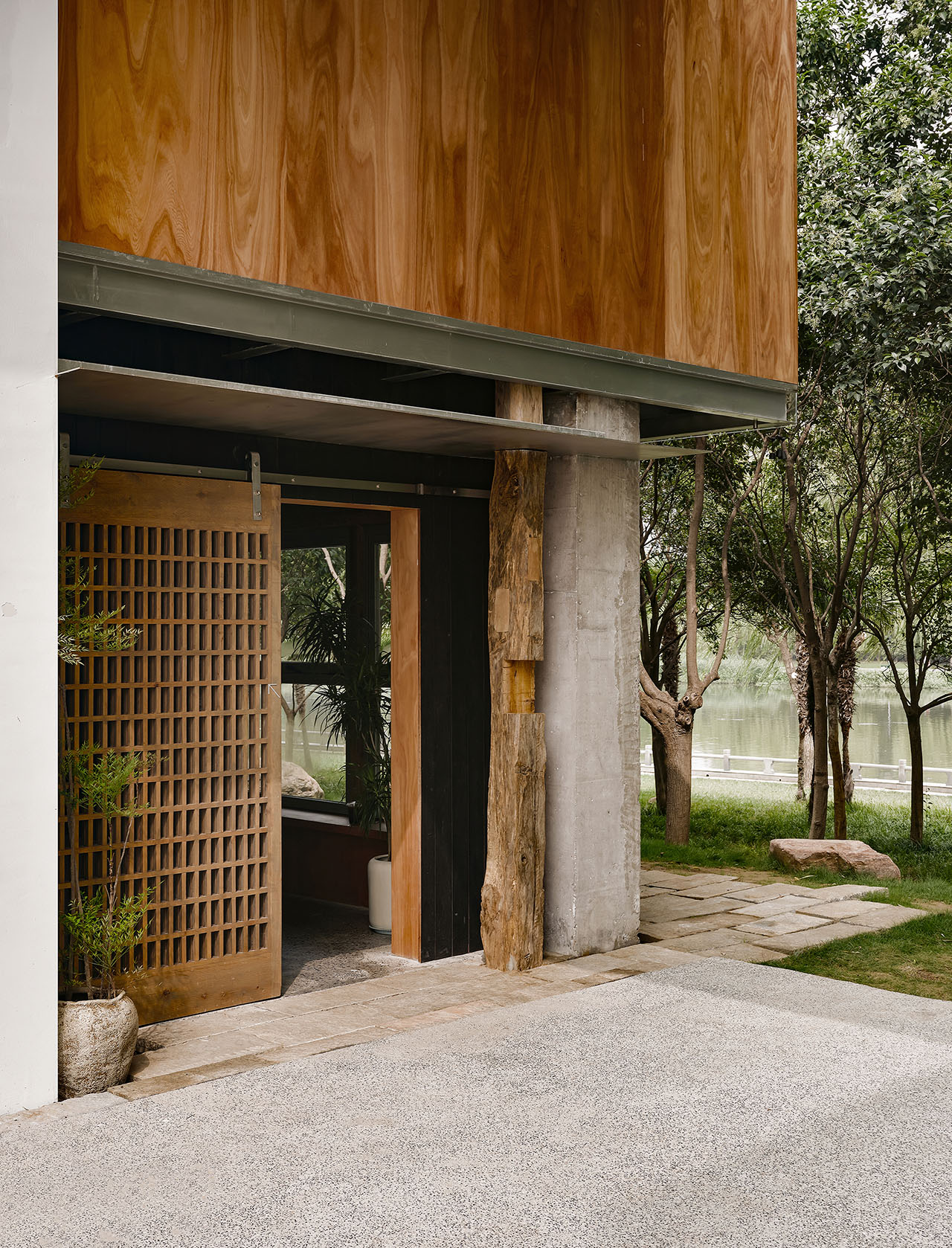 坐在被木质包裹的临窗位置,让人再松弛不过。人们可以不同方式观看自然诗意的流转,也可从中轴门走到户外露台,远眺熊儿河面,舒展身心。