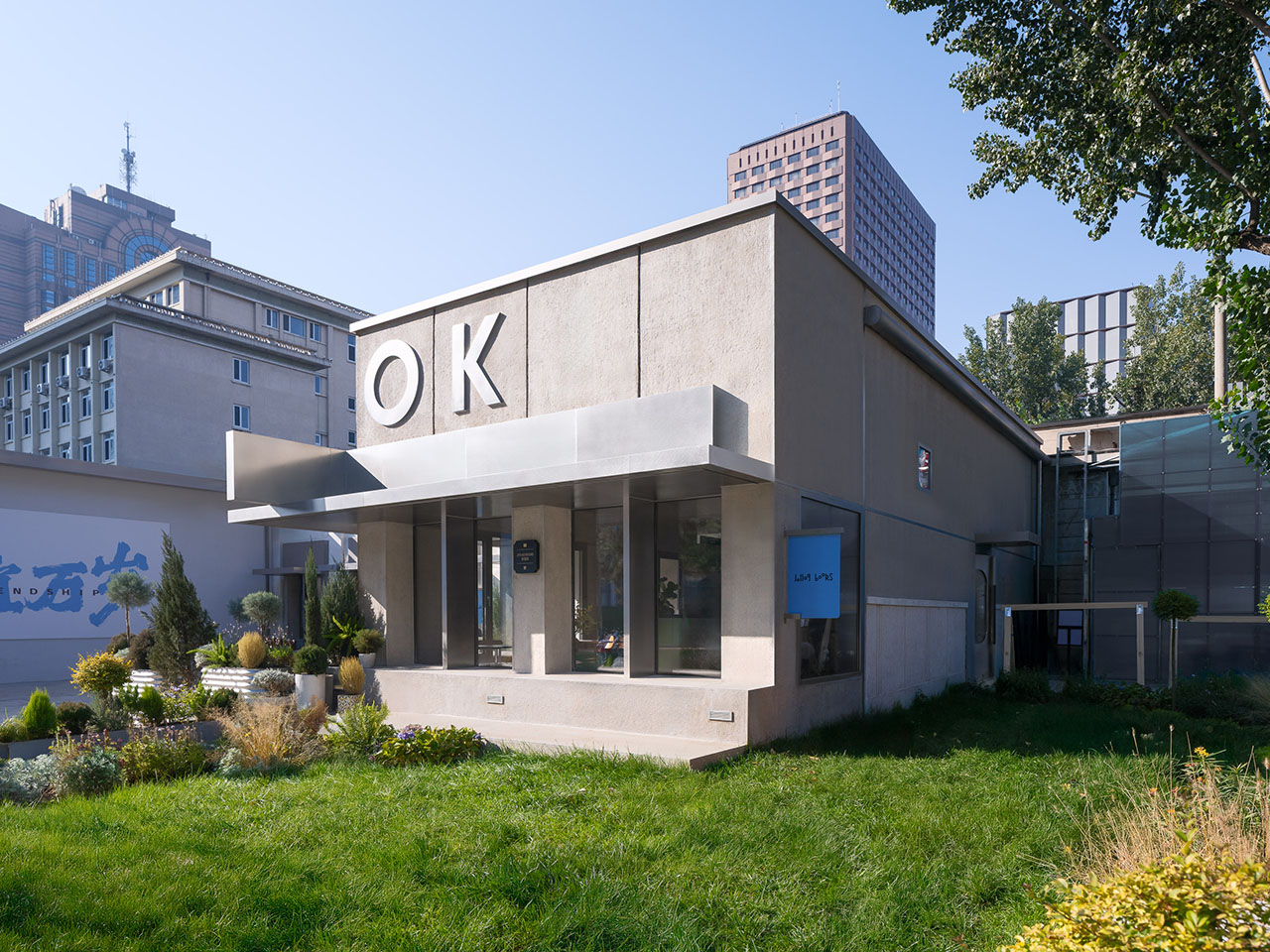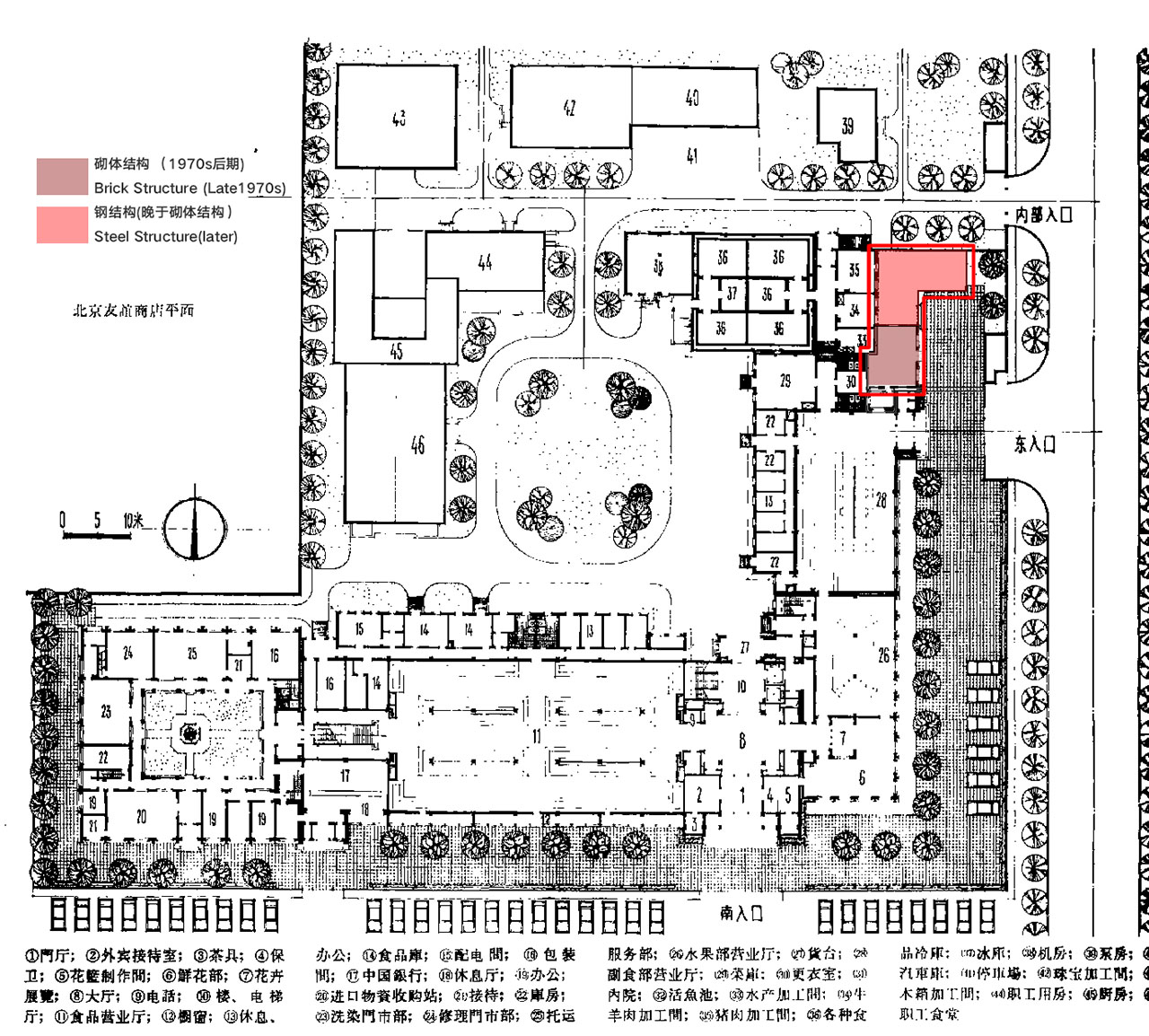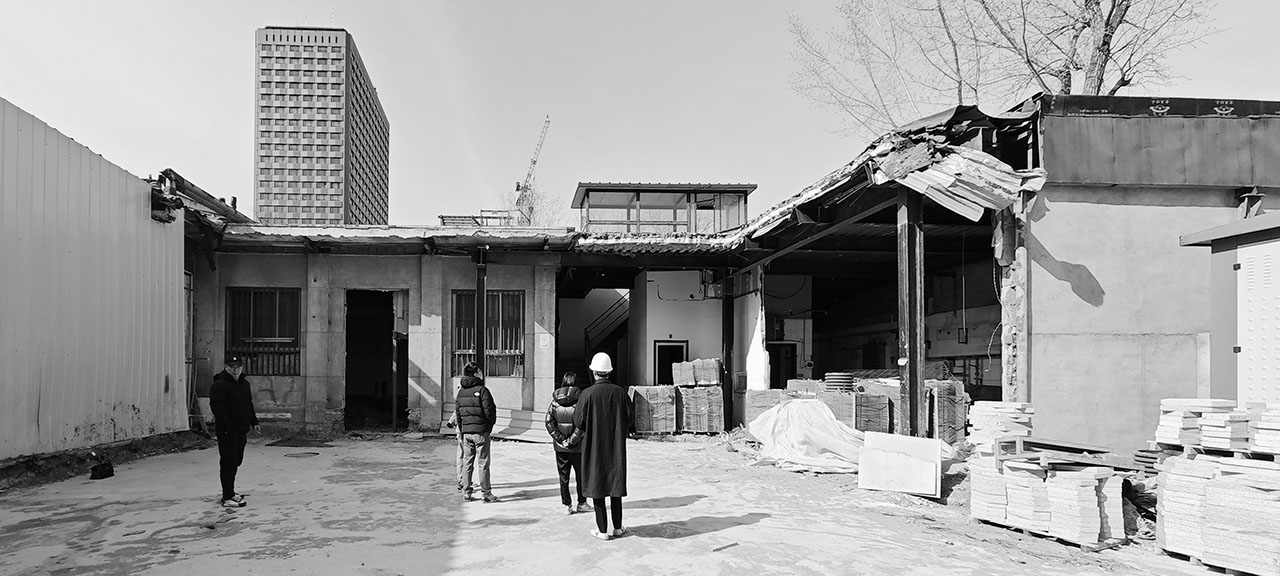 友谊商店建筑群以其包豪斯式的不对称体量,结合极具时代特色的所谓“苏联式”立面,自1972年竣工后便成为长安街轴线上的重要地标。Jetlag Books的基地由一栋1970年代末建成的后勤用房与一栋更晚期盖的钢结构建筑连缀而成。前者毗邻主楼东北角,对外仅露出一面保留较好的“苏联式”东立面,后者则仅余结构骨架、屋顶及北侧砖砌外墙。两者坐西朝东呈“「”型布局,北邻园区主入口通道,南侧与主楼裙房合围出一片临街小广场,令夹在两块空地间的钢结构基地成为探向东侧道路的“门面”与“展示窗口”。