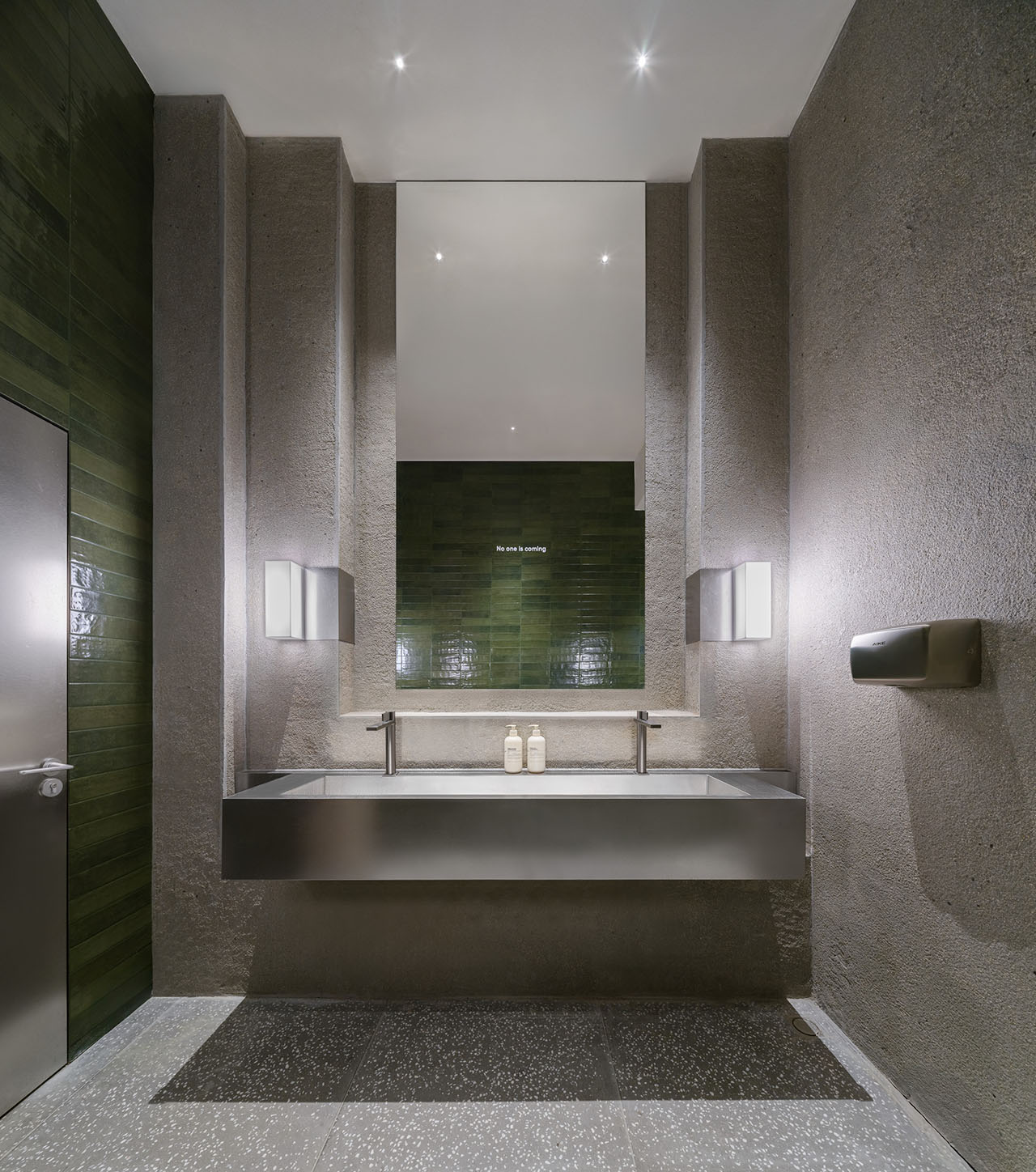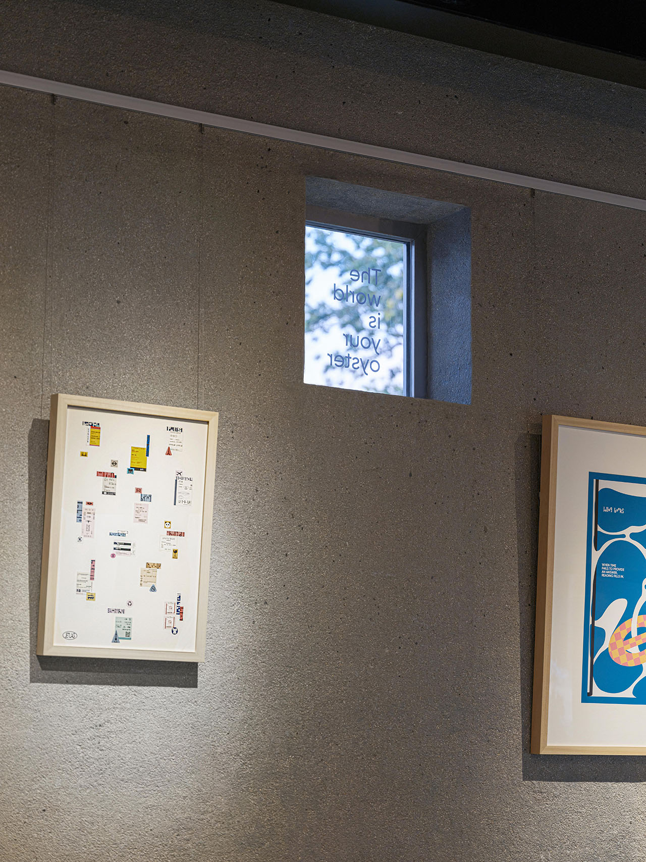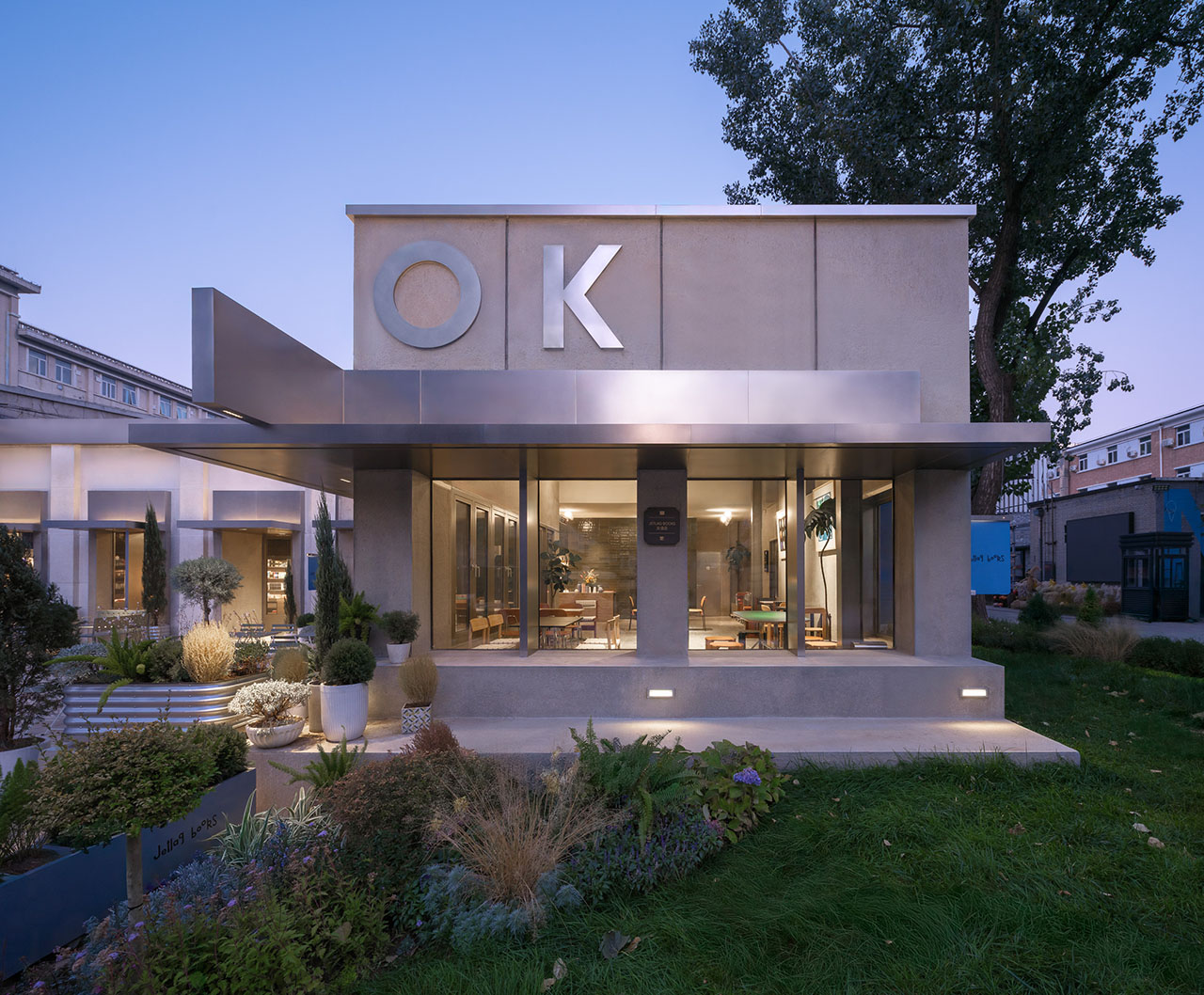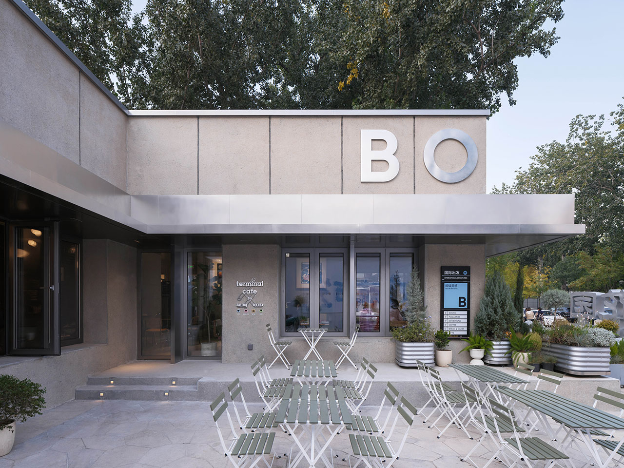 北立面紧邻园区主入口通道,设计保留基地砖墙,在其两侧浇筑混凝土加固并做表面凿毛,更考古般清理呈现出两段原本砌入墙体的园区原水刷石围墙,作为外立面的墙裙。此立面仅在东端新开一面大窗以吸引入园访客,而利用原排风扇洞口设置了一面小高窗、利用原后勤门洞设置了新的外门,门上设计了飞机舷窗形式的视窗,暗示Jetlag Books的旅行主题。因北立面前的景观条件不适合访客停留,所以此处门窗相应未做内凹处理,而是与墙面上的落水管、不锈钢装饰线及墙裙一起构成一幅平面图案。