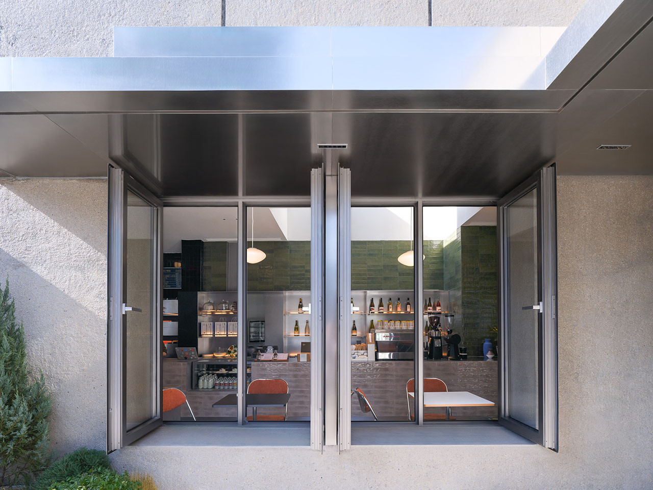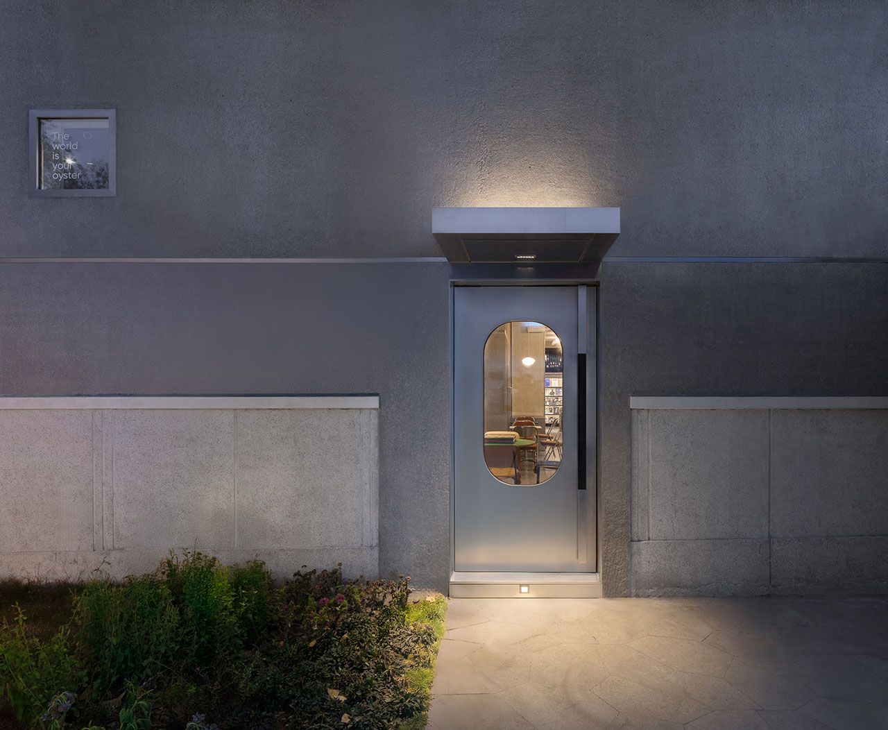 在新建挑檐下,我们结合深窗设计了可供憩坐的台基,满足业主提出的通过檐下灰空间塑造社区友好立面的需求。新老两部分外立面上的挑檐、檐下竖梃及门窗框均采用更为当代的乱纹不锈钢材质,轻盈而细腻,既与水刷石及凿毛混凝土形成反差,也将新老两部分外立面连为整体。新建外立面的窗洞及檐口高度也与改造后的老建筑保持一致,进一步加强两者的连接。