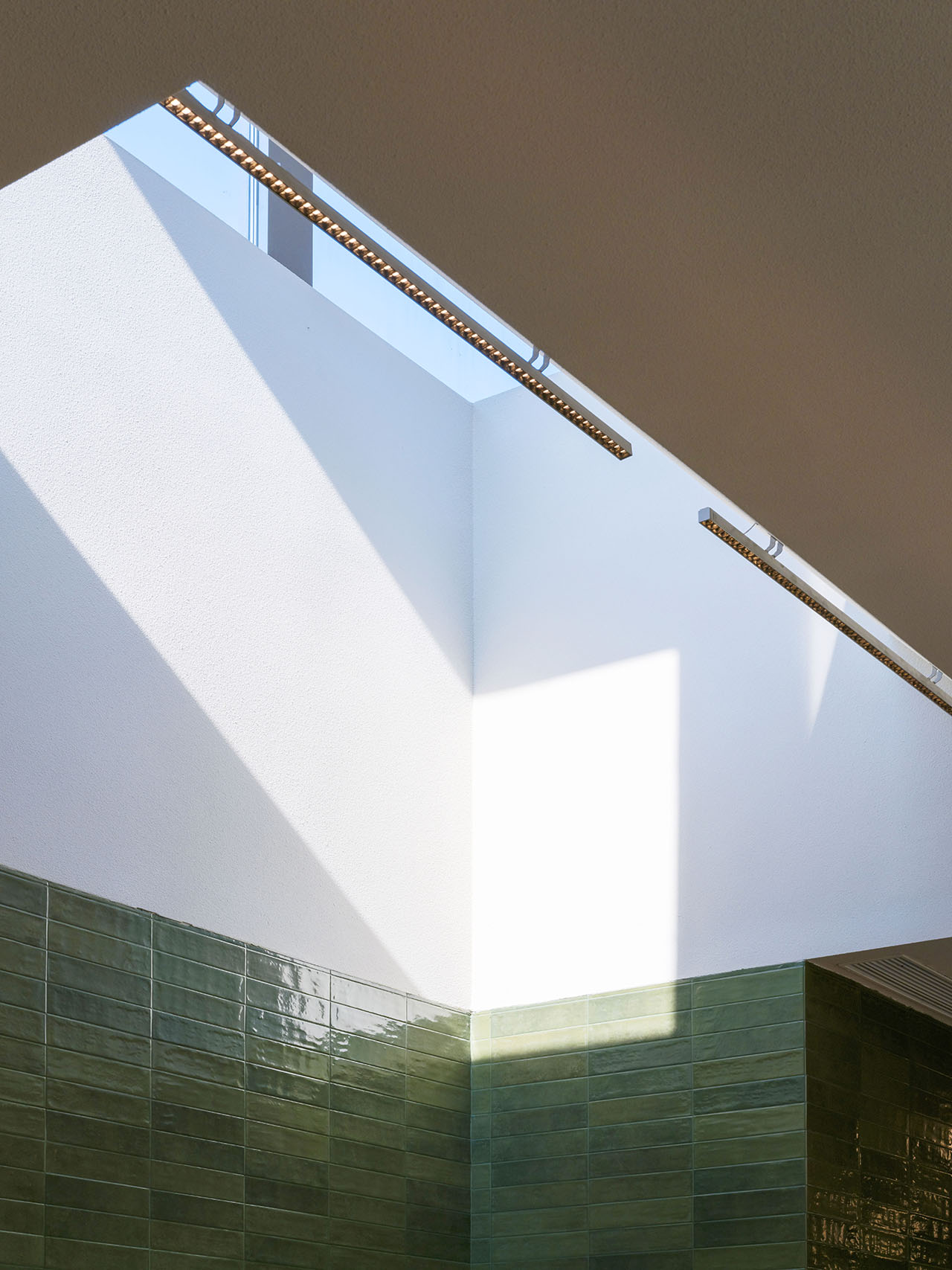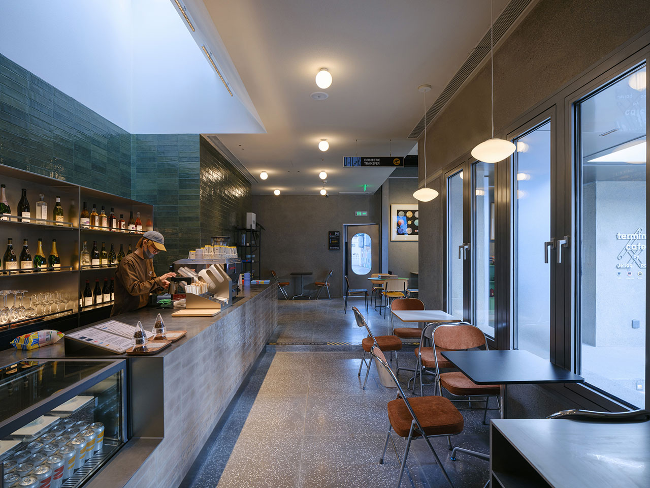吧台区作为缝合新旧的枢纽,分别采用与展书区同规格的墨绿色及米褐色瓷砖作为墙面及吧台饰面,营造空间的渐进过渡。我们保留了此处基地原有的一道楼梯在结构顶板的开洞,并将原屋面玻璃楼梯间改造成天窗,为其下的吧台带来戏剧性的天光。玻璃房内悬挂的发光标识则成为外立面上极具辨识度的特征。根据基地原有高差,吧台南北两端各设置了一级台阶,进一步限定出吧台区域边界,也令这里成为书店中形式变化最丰富的空间。