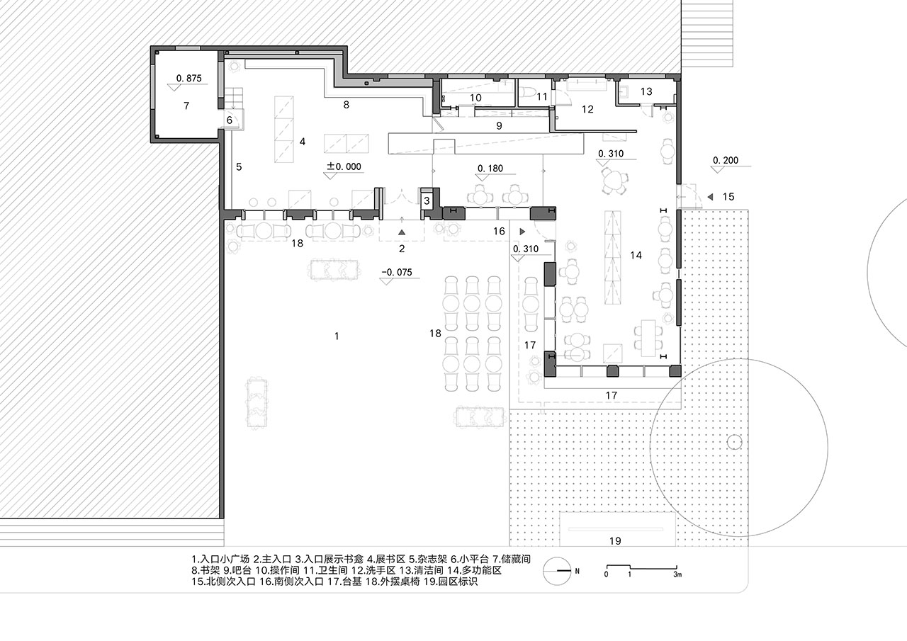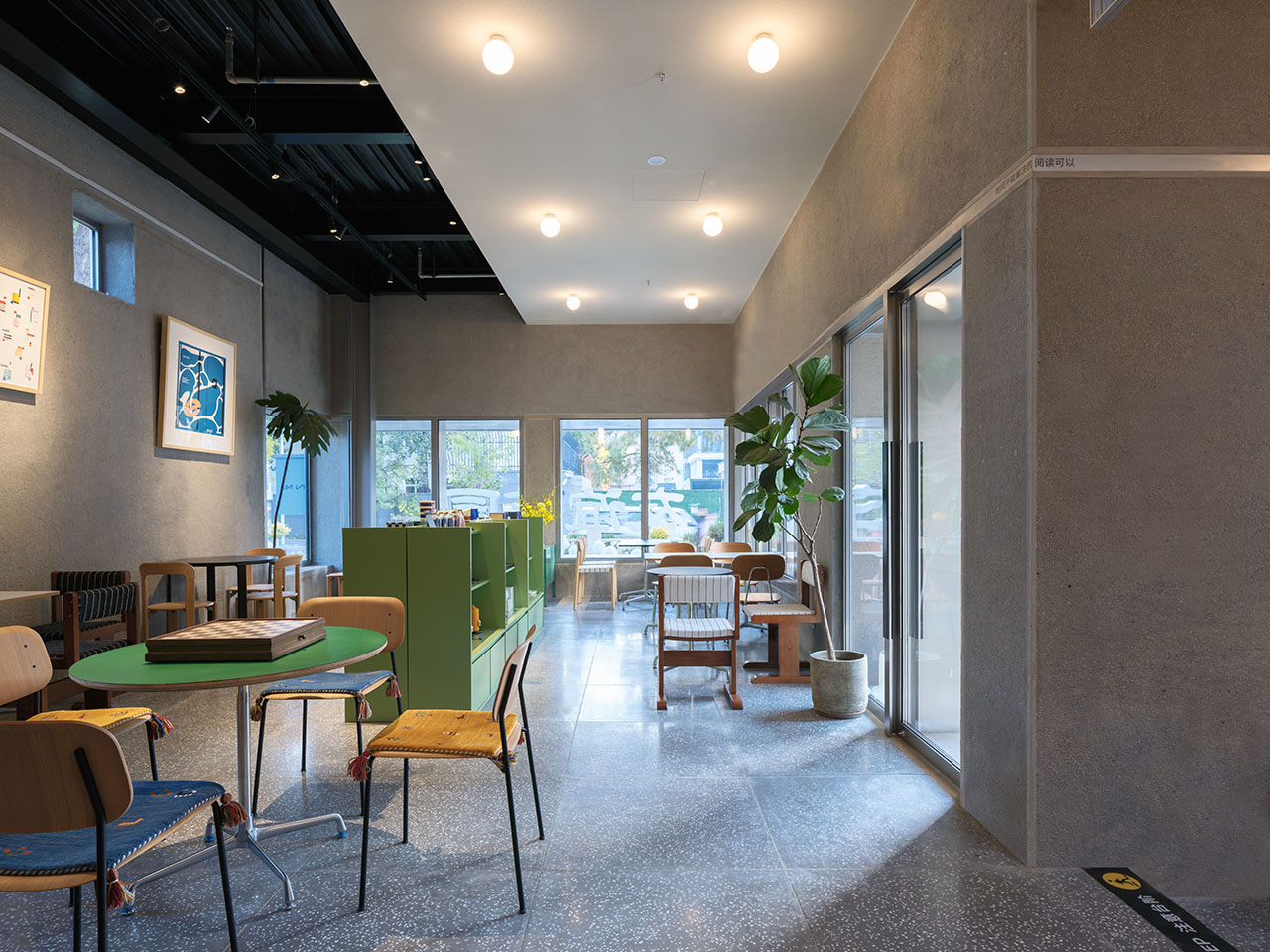 书店最北侧体量为多功能区,除日常作为咖啡座位区外,还需满足展览、活动、快闪等多元功能需求。南北两侧设置的两扇外门分别联通小广场及园区主入口,令此空间可以独立对外运营。这里室内仅设置移动家具,墙地面则采用灰色调的凿毛混凝土及水磨石材质,为使用留出最大灵活度之余,也呼应了友谊商店原始外立面及室内铺地的材料。