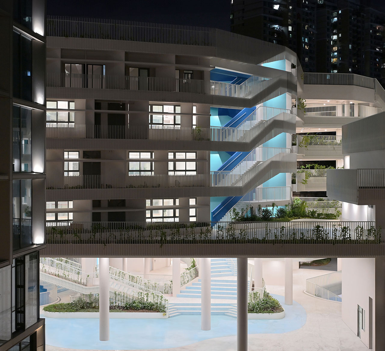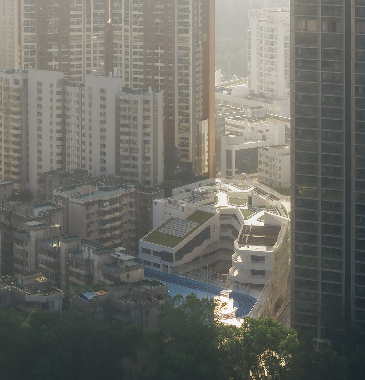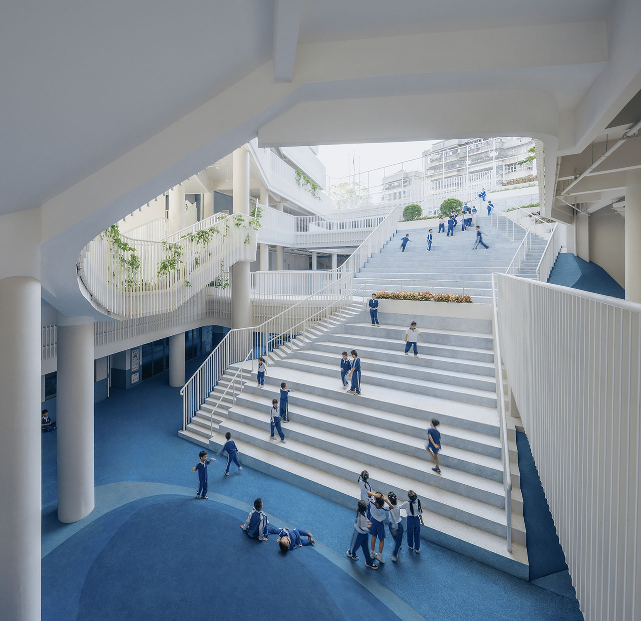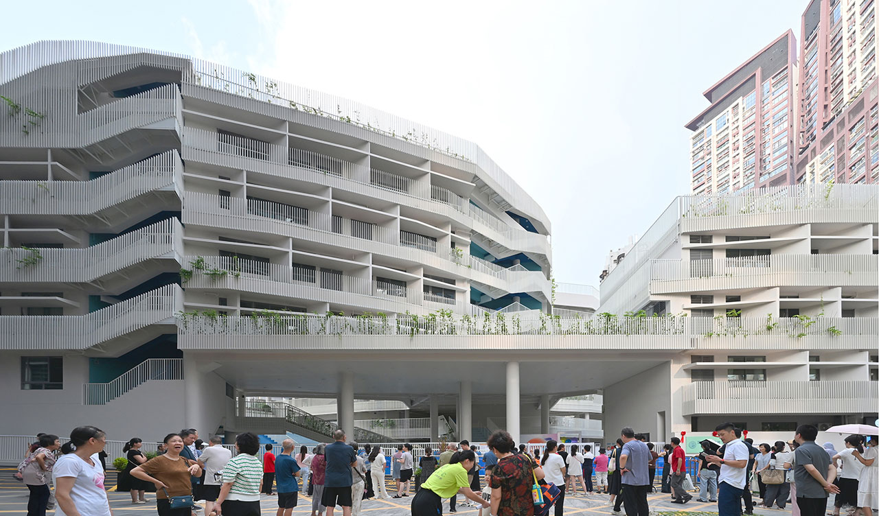校园内大量宽敞的过渡空间促进跨学科学习与团队协作,退台设计连接各楼层,增强视觉与空间连续性。丰富的植被不仅为深圳热带气候降温降噪、净化空气,也成为学生观察与养护的学习资源。在城市层面,学校作为北侧公园的南向延伸,其自然绿化有助于缓解周边商业开发带来的热岛效应。