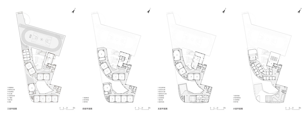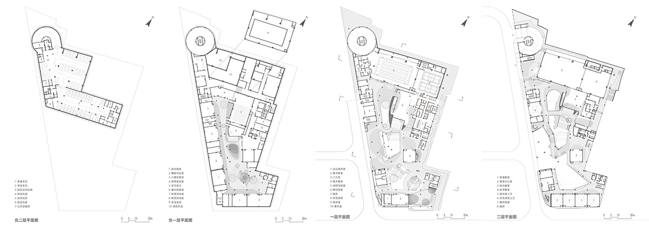 校园打破教室与走廊的刻板界限,将学习延伸至整个环境。架空户外区、可互动的建筑构件及开放教室模糊了室内外边界,为学生提供解放课桌、亲近自然和动手实验的多元机会。校园核心由“山”“谷”“滩”三大景观元素构成:北庭院的“山”容纳剧场与食堂,其阶梯形态成为聚集与活动的垂直场所;南庭院的“谷”专为低年级设计,形成适合非正式聚会的下沉空间;相邻的“滩”则以起伏地形激发游戏与体能发展。