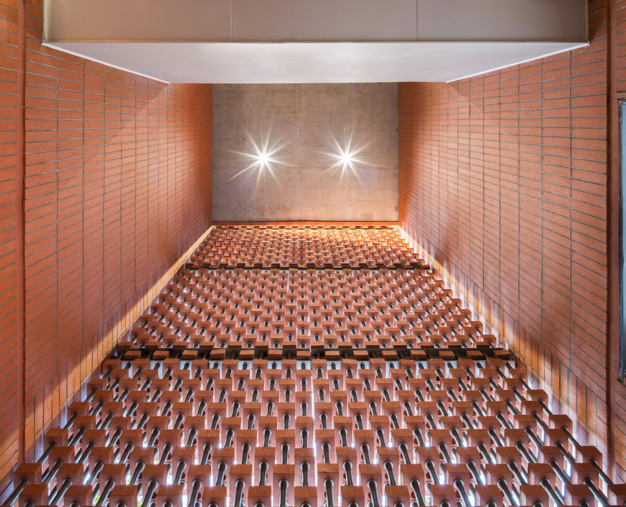 位于大厦一楼的“饮水思源”中庭,以红陶砖铺装与水景共同构成中心场景,与原址保留的光东堂遗迹形成跨越时间的视觉关系。上部引光、水声与地面遗迹共同营造宁静的氛围,使空间具备了沉浸式的行走体验与感知深度。