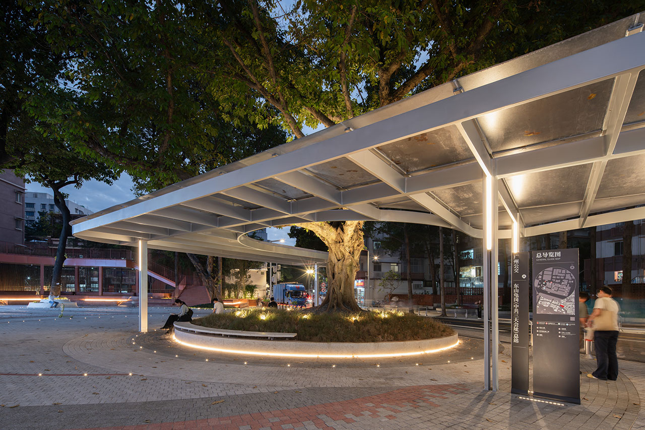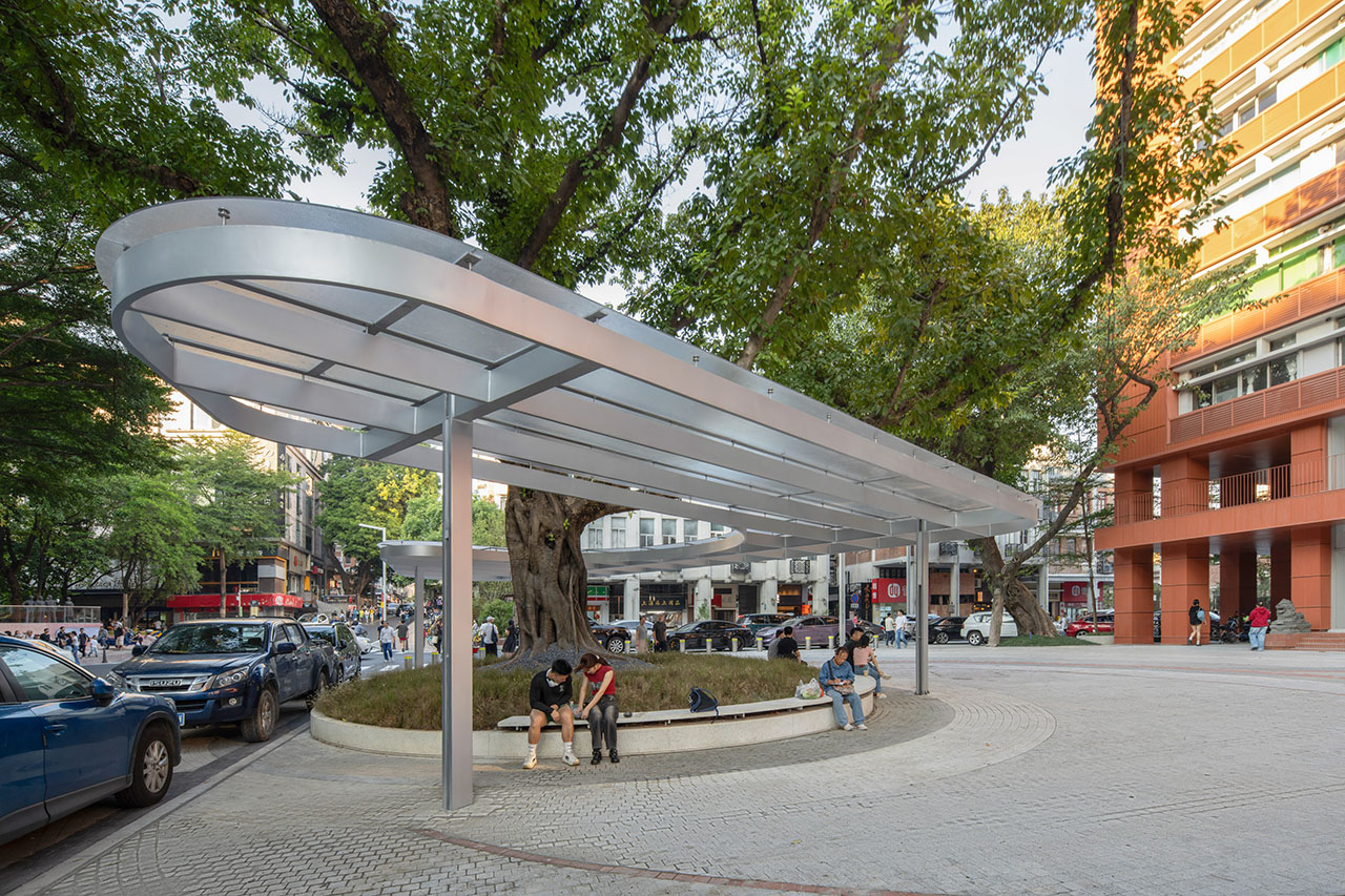 建东大厦门户广场重点解决公交车站与古树的关系,将树池与座椅融合设计,形成遮阳避雨的舒适等候区;顶棚采用透亮耐力板,新材料与古榕树的光影交织,强化了古树作为场所记忆与精神象征的意境。