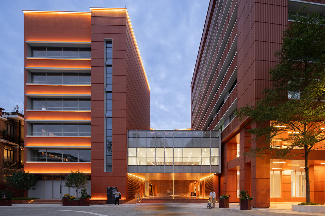 建东组团建筑是本次项目中新旧结合的代表。其中,建东大厦在外立面改造中采用了陶板—铝板复合幕墙系统与红色内墙涂料构成现代立面,丰富了街区的材质层次。