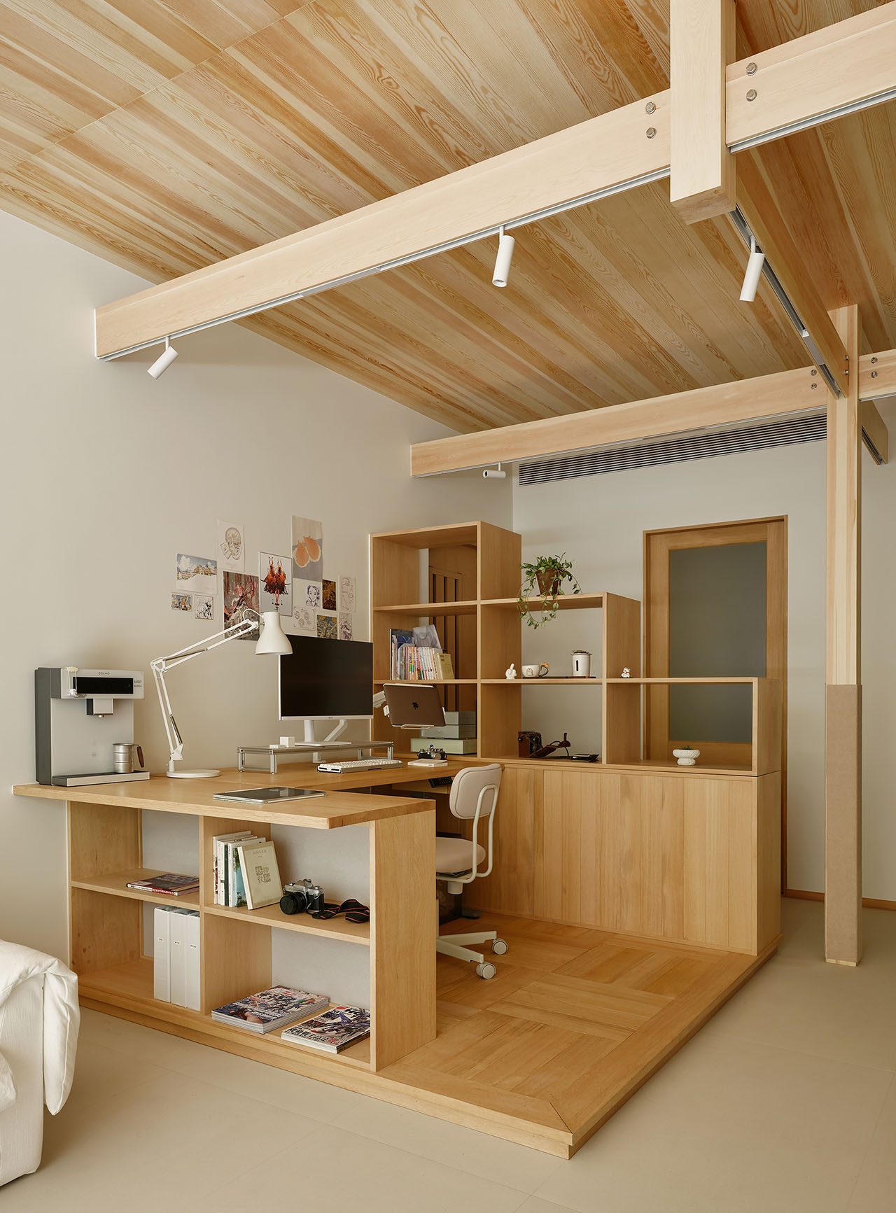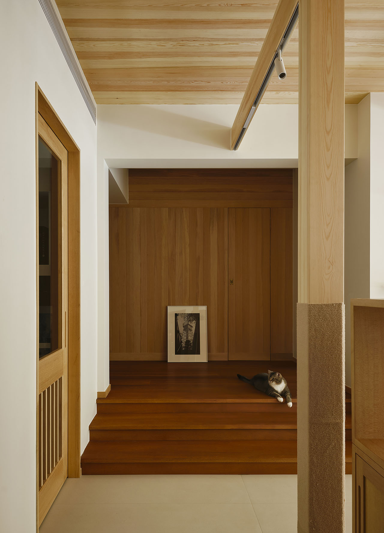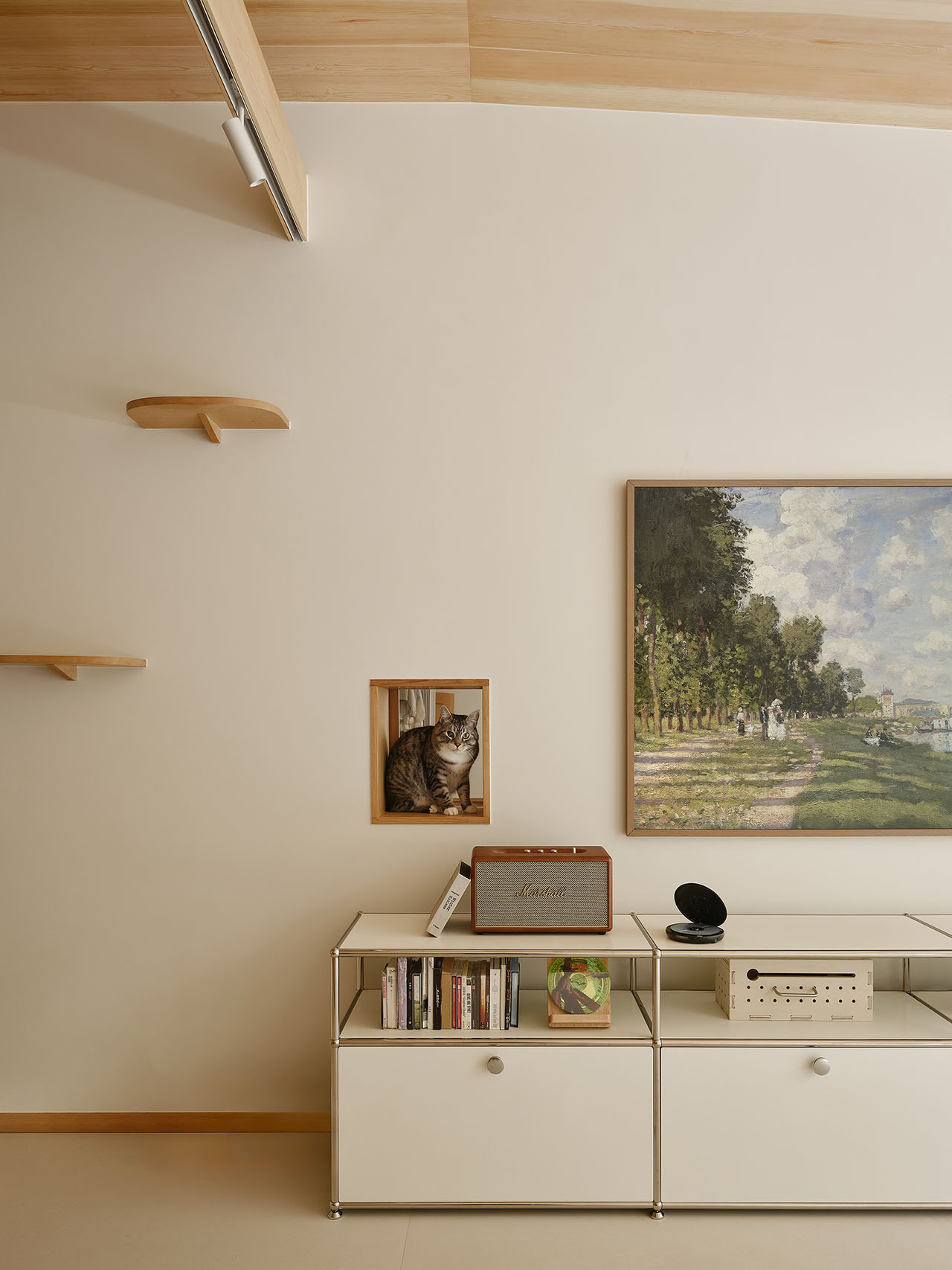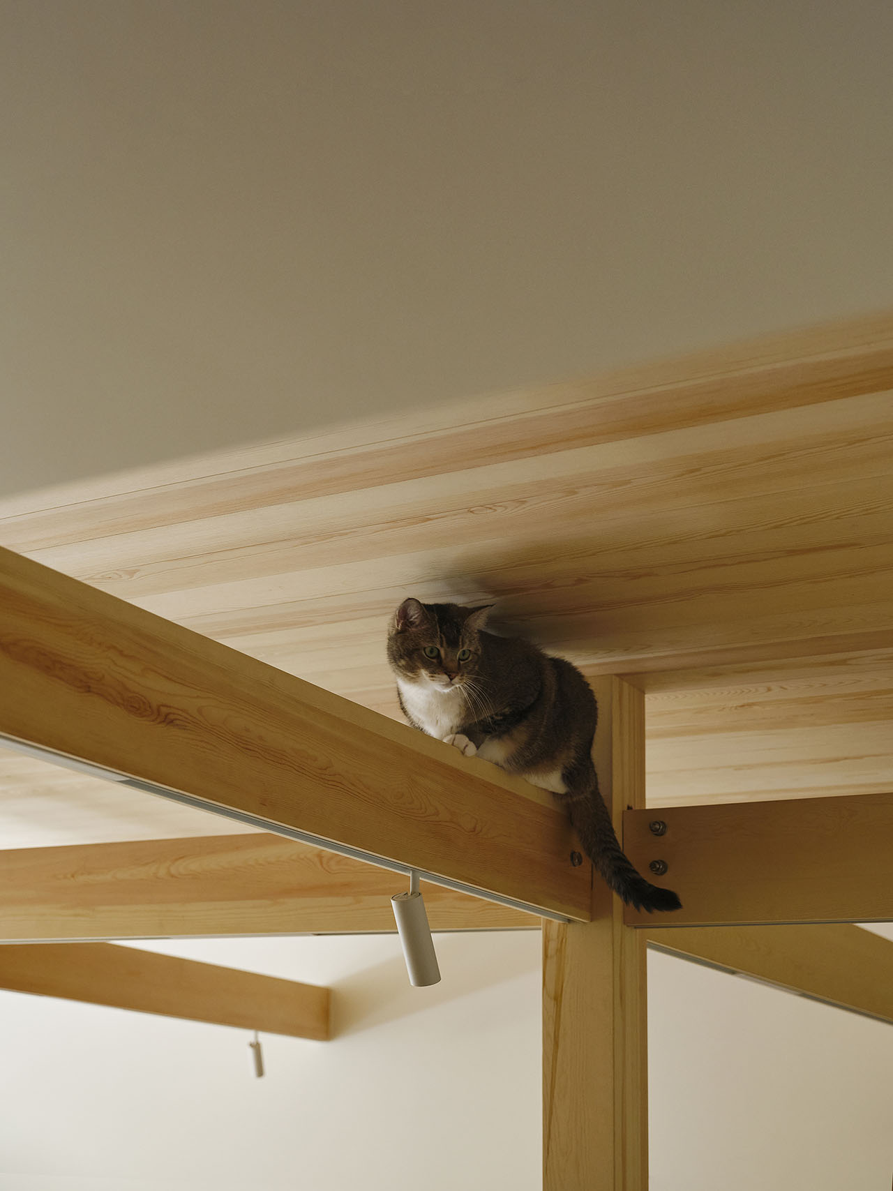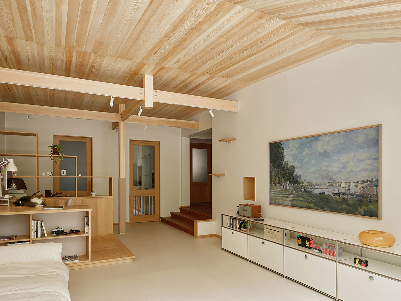 女主人漫画工作区的桌面和柜子是「猫踏板」,2.4米长的木横梁既能够布光也是横跨整个客厅的「猫跑道」,整个家如同一个巨大的猫爬架,适宠化的设计自然融入空间。