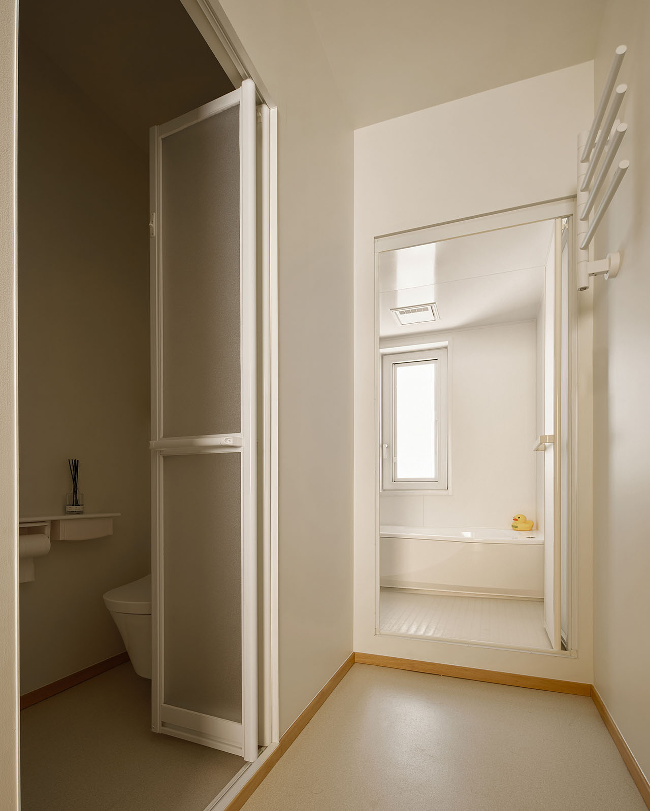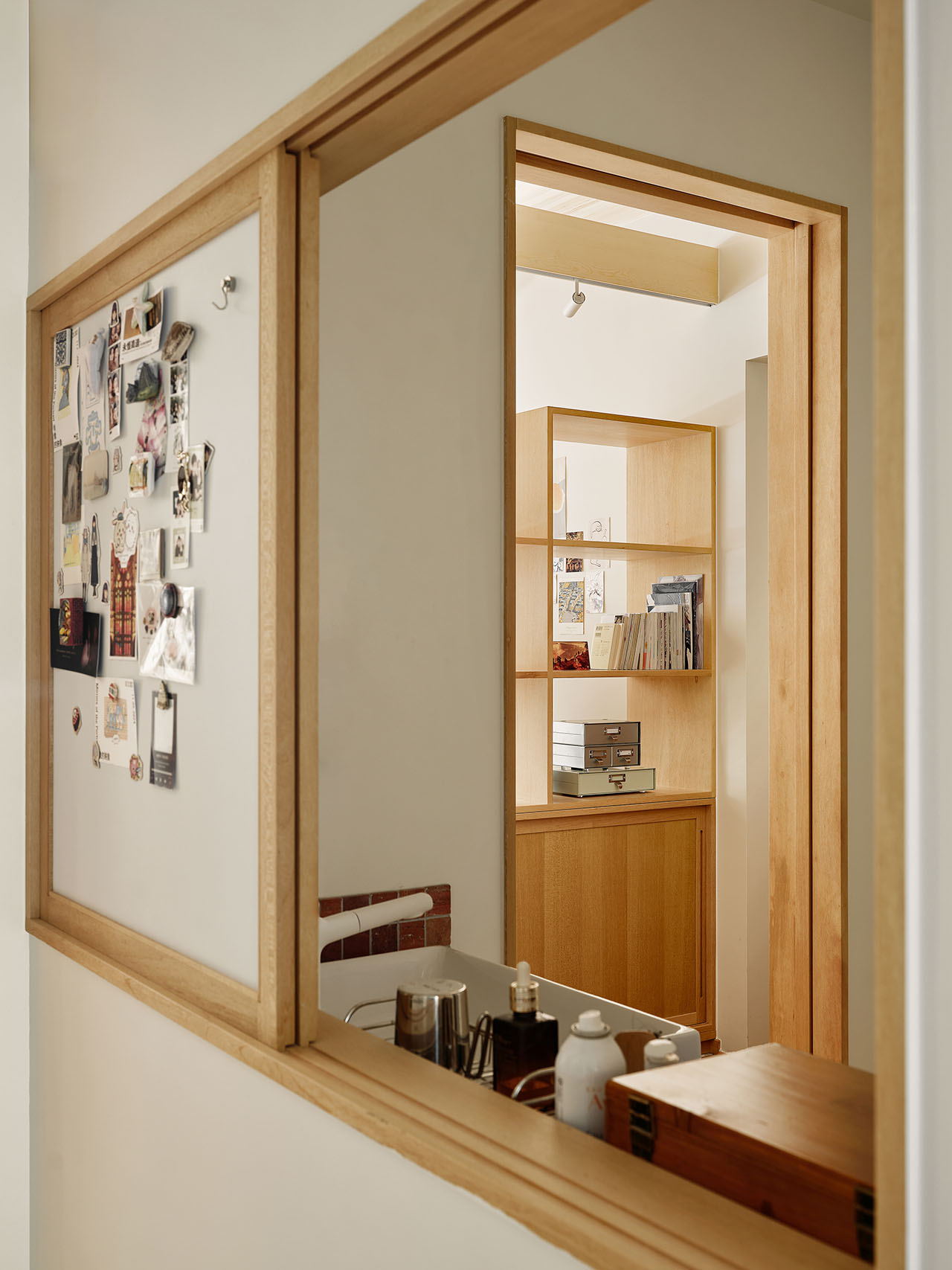 卫浴和厨房空间原本是完全独立的。改造之后,柚木洗手台上的「移窗镜子」连通了光线和视线,在厨房的人可以轻松观察到玄关的情况。