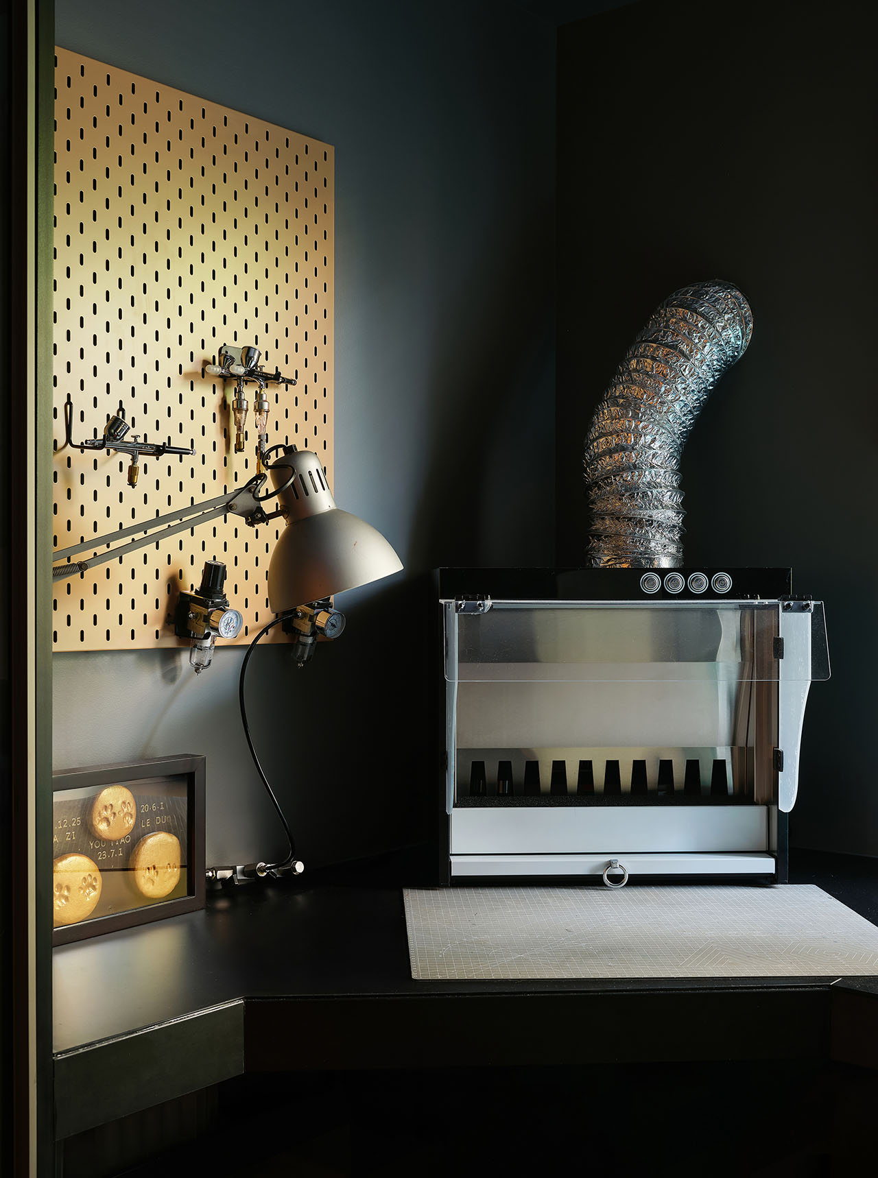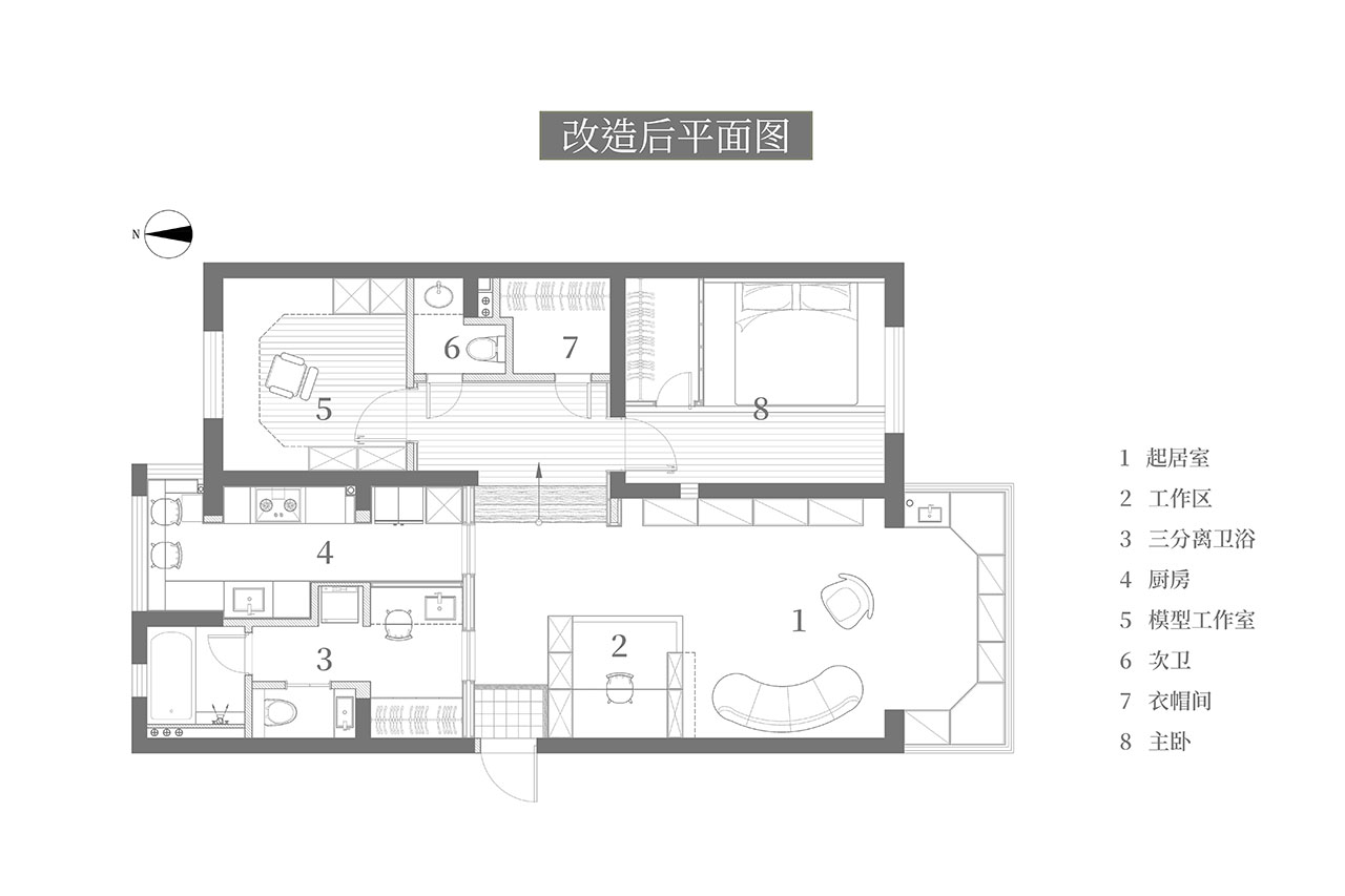 没有长辈房,没有儿童房,没有餐厅;但有女马桶间和男马桶间,有女衣帽间和男衣帽间。客厅有一半是女业主的工作舞台,仅有的一个次卧是男业主的模型喷漆房。