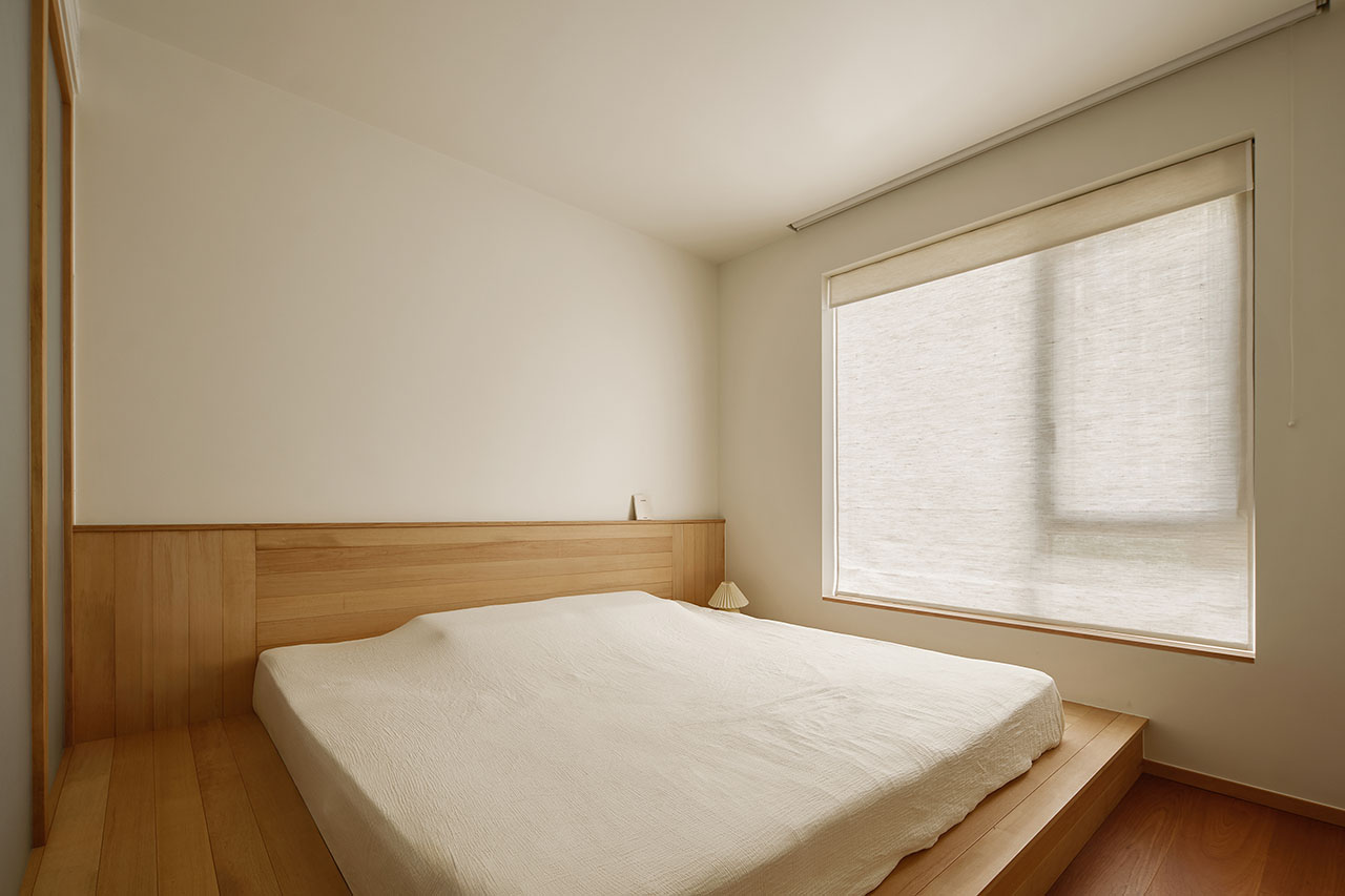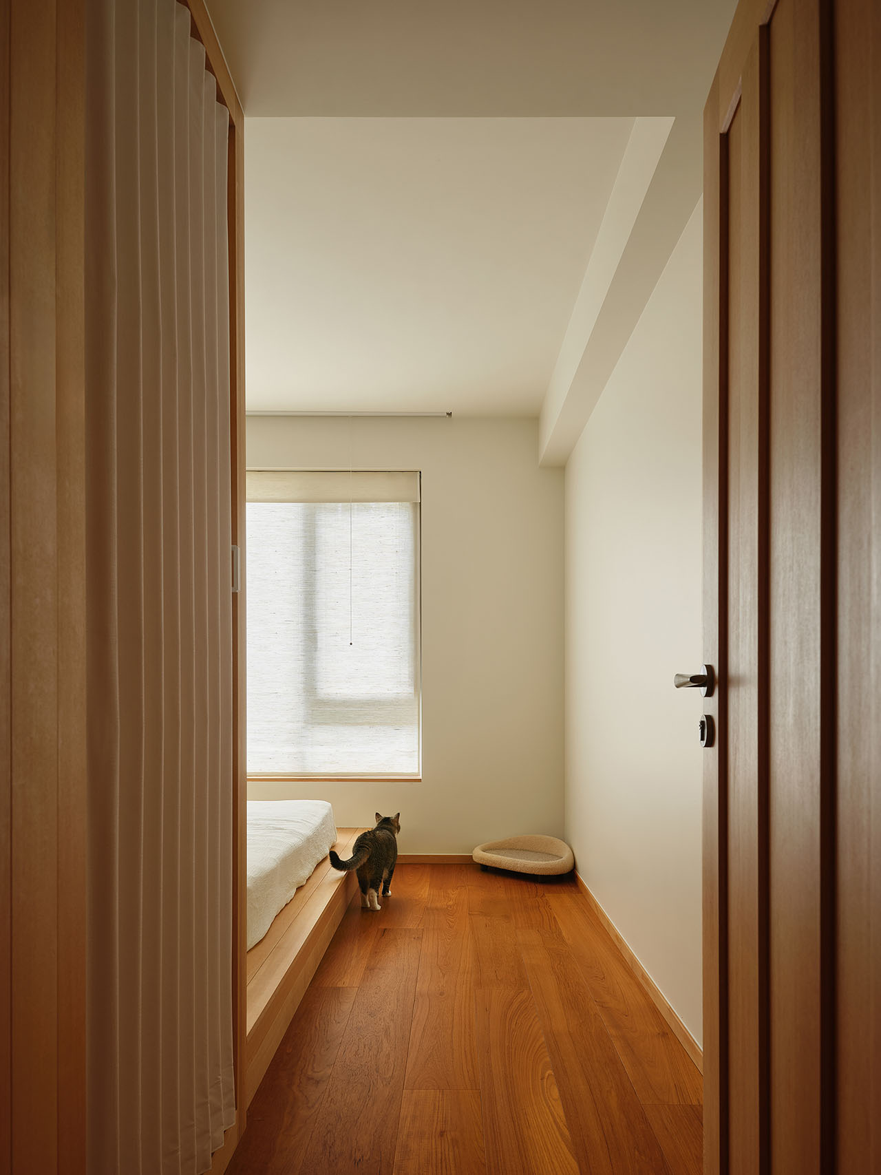电视墙上有一个「专属猫窗洞」,人走主卧门进,猫钻窗洞进房间。主卧3米宽的地台床是大型「猫咪停车场」,晚上人猫一起睡也不会打架。