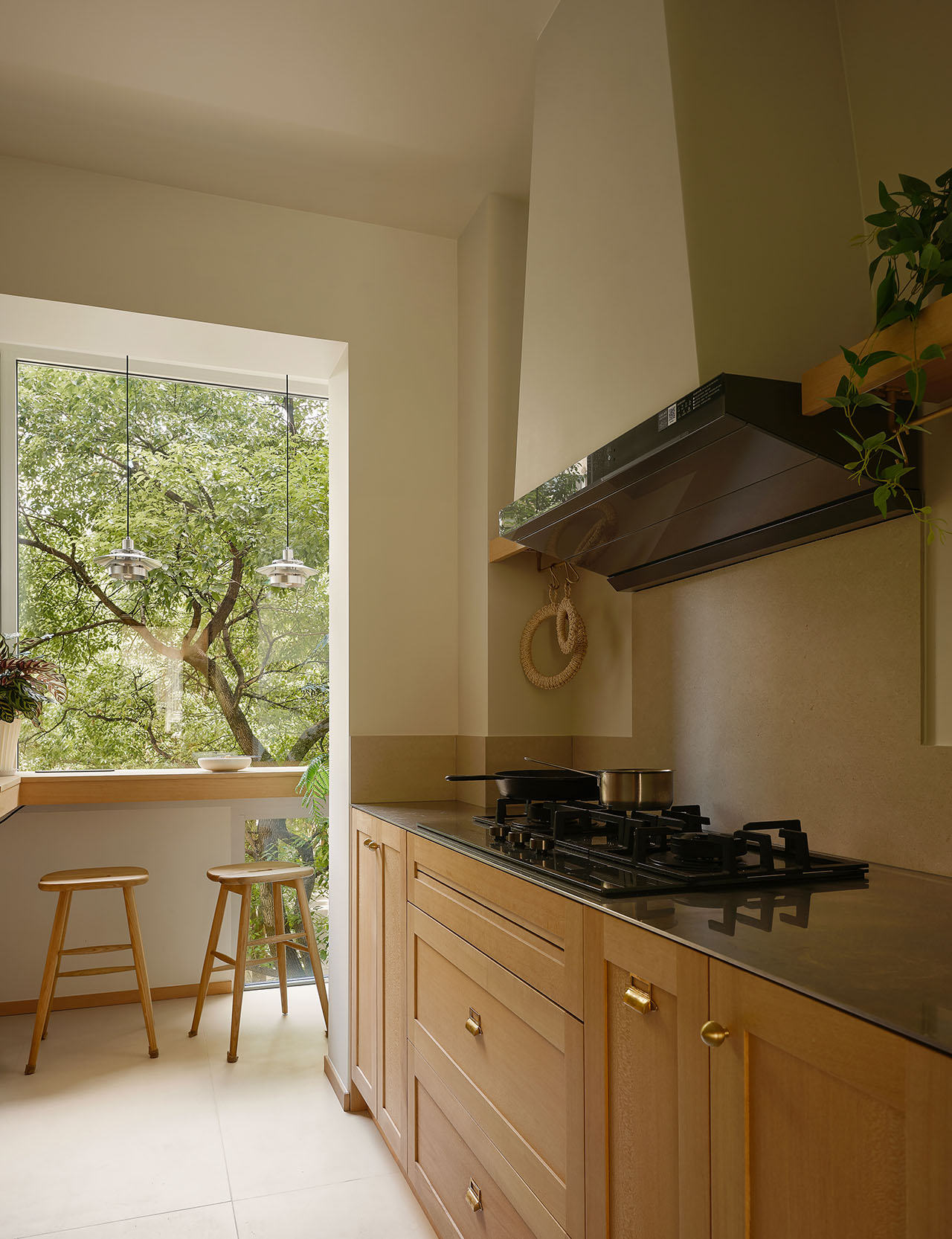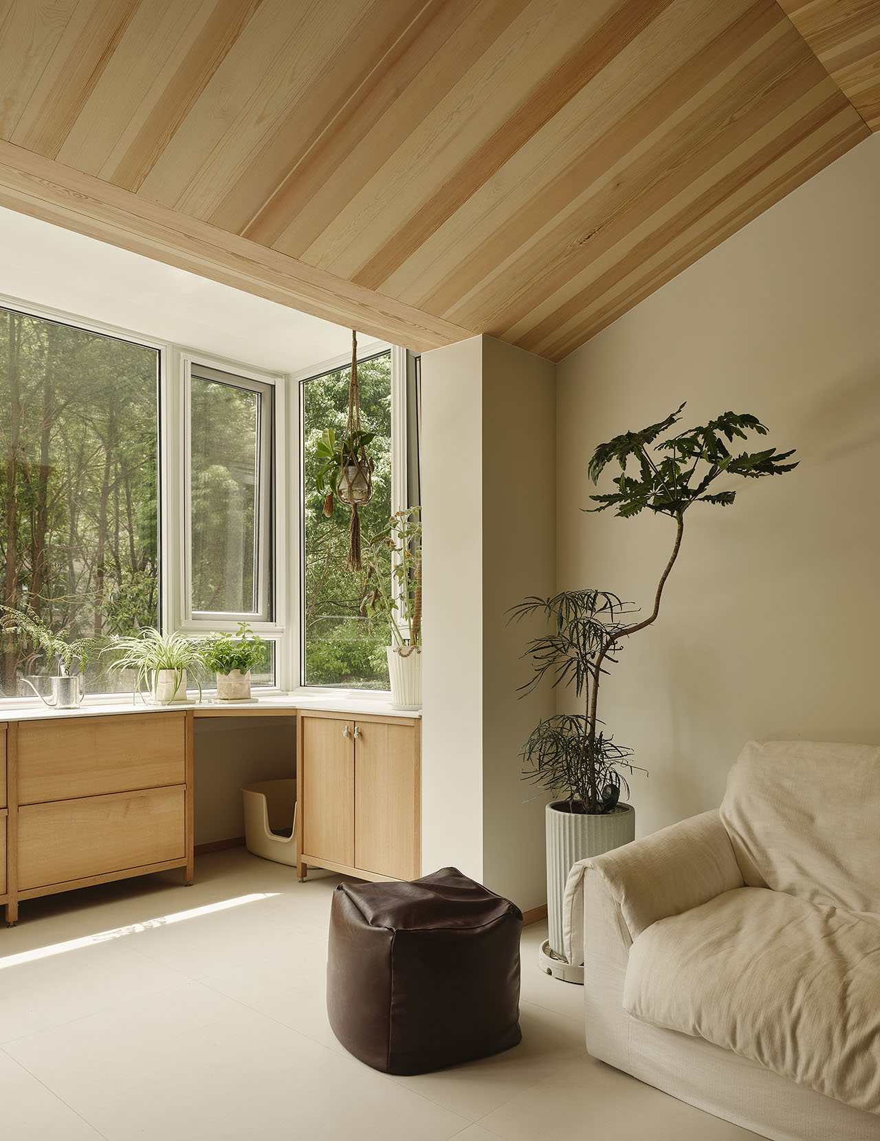 客厅和阳台之间的横梁高差达80cm,我们用「实木斜面吊顶」从客厅延伸至阳台,将原本压抑的阳台横梁柔化消隐,自然而然将人的视线引导至窗外,整个住宅如同藏在城市内的森林木屋。