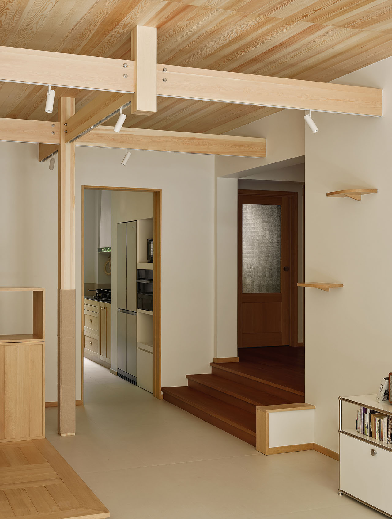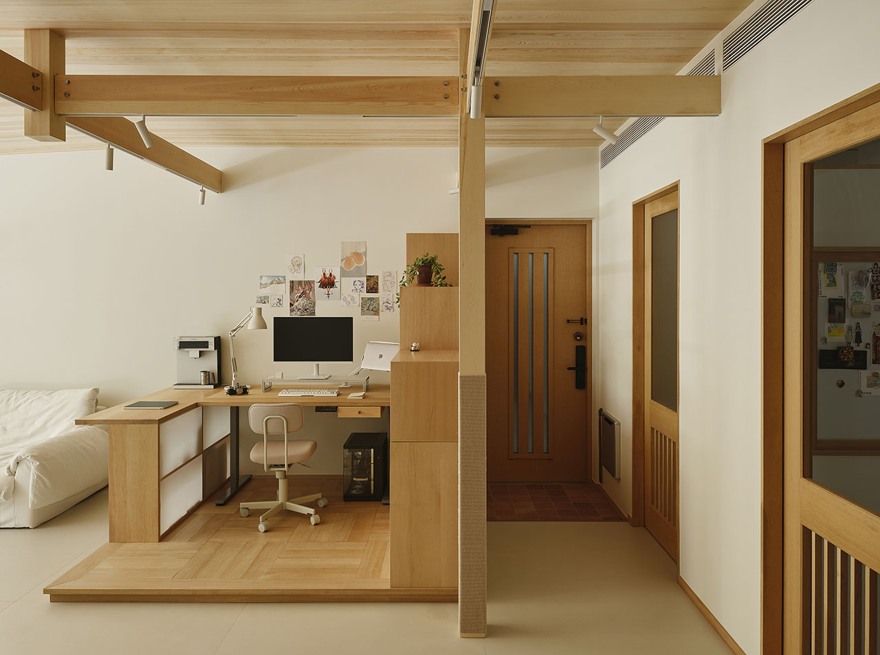 房子的硬装非常简单,许多设计功能都不依靠传统砌墙,而是用「木构模块」实现。