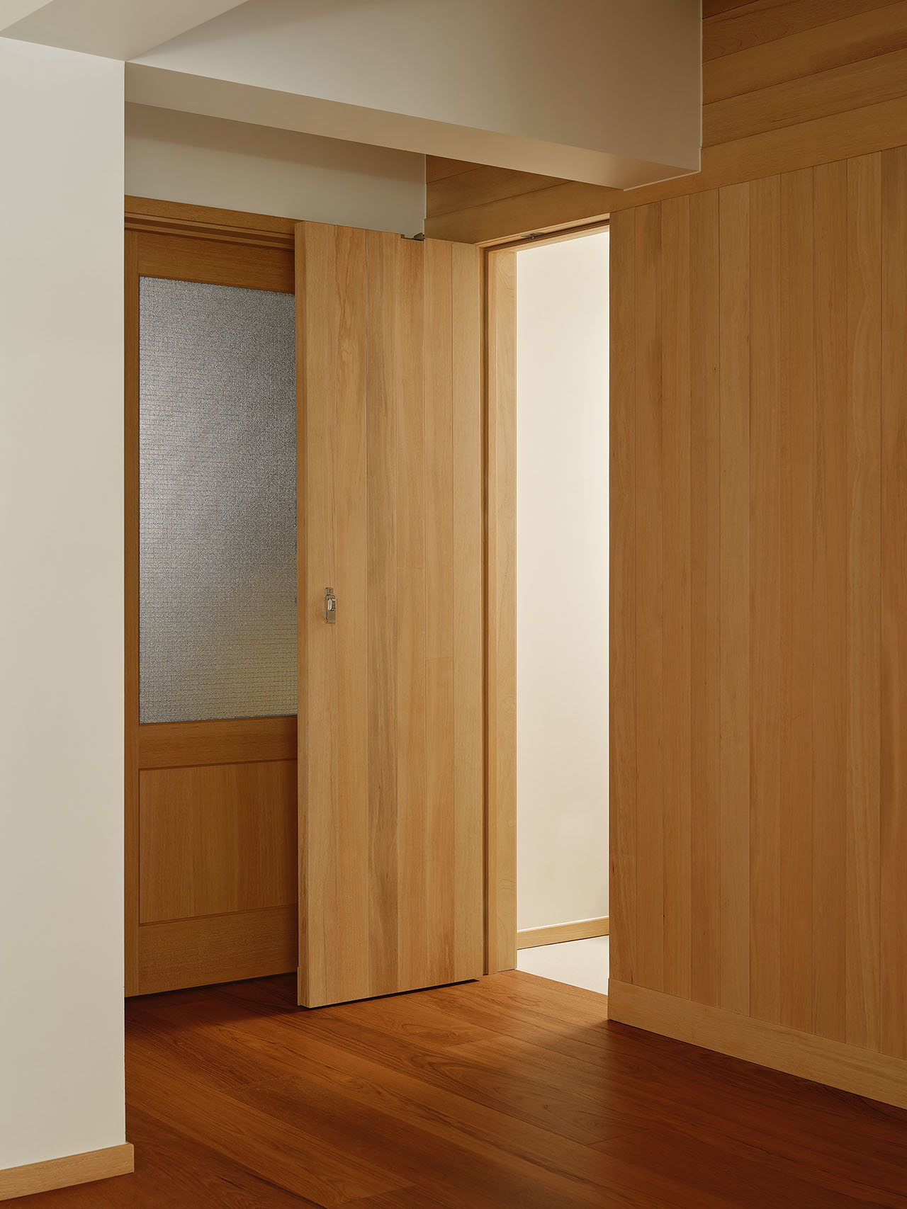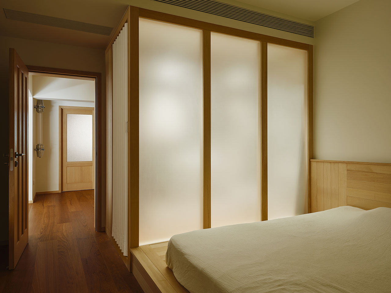 无中生有的玄关是由「实木双面柜+梁柱」分隔而来;主卧的衣帽间是「实木框架+玻璃」搭建的透光玻璃房。