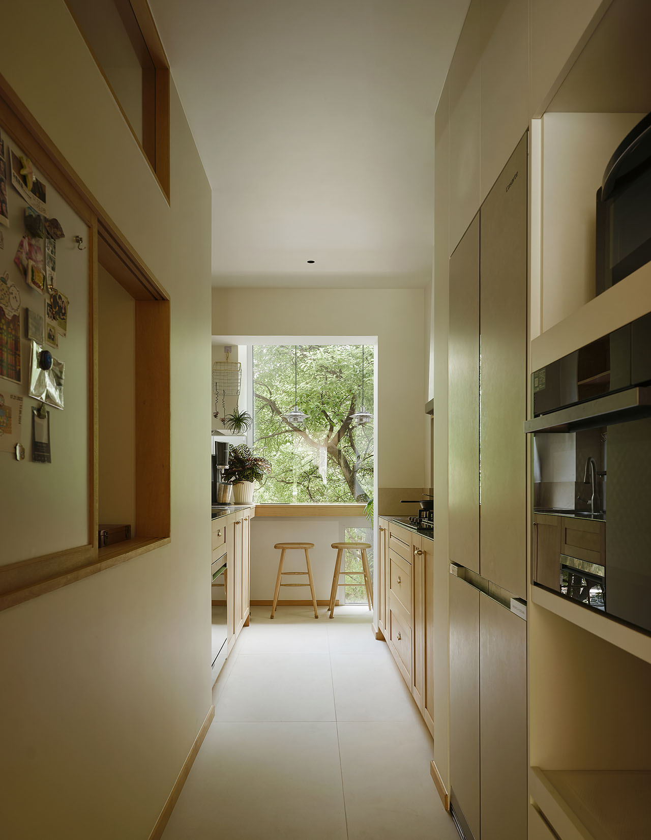 房子里的大块面积被留给了兴趣爱好和交流,餐厅则被缩小成了吧台,独占了厨房尽头落地窗外一整片绿茵。