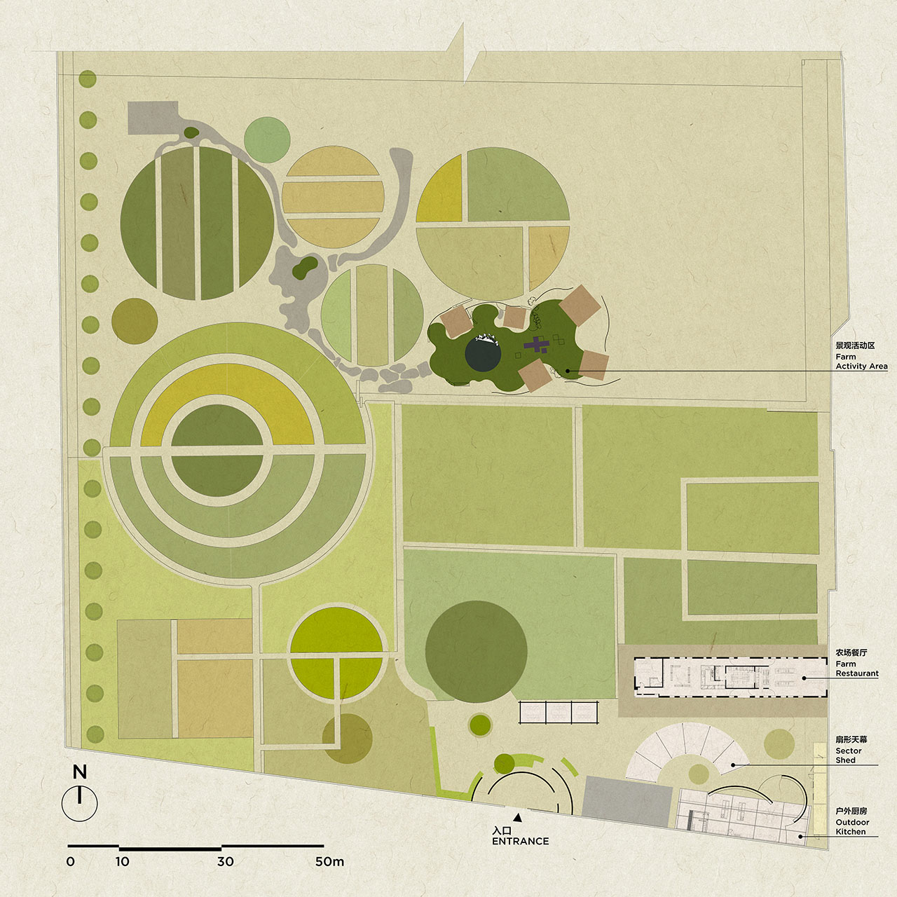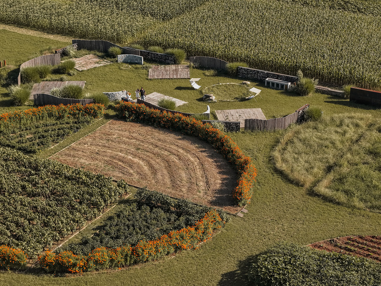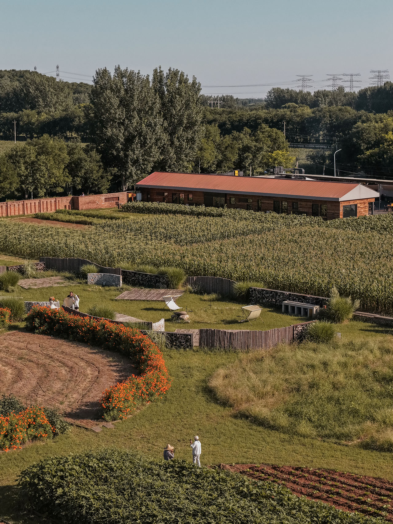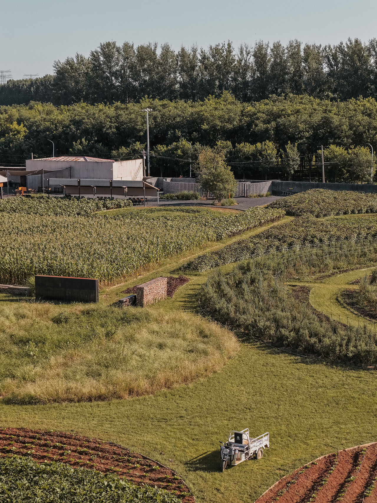 入口、种植区、户外餐区等场景,以不规则的“圆形构成”融入自然景观。随着季节变化,丰茂的植物将几何的边界变得柔软松快,一个现代主义的农田景观初见雏形。灌溉与交通系统的设计遵循“实用与野趣共生”,田埂用碎石土铺设,顺应自然,两侧保留马齿苋、狗尾巴草等原生杂草,还原乡野生态肌理。