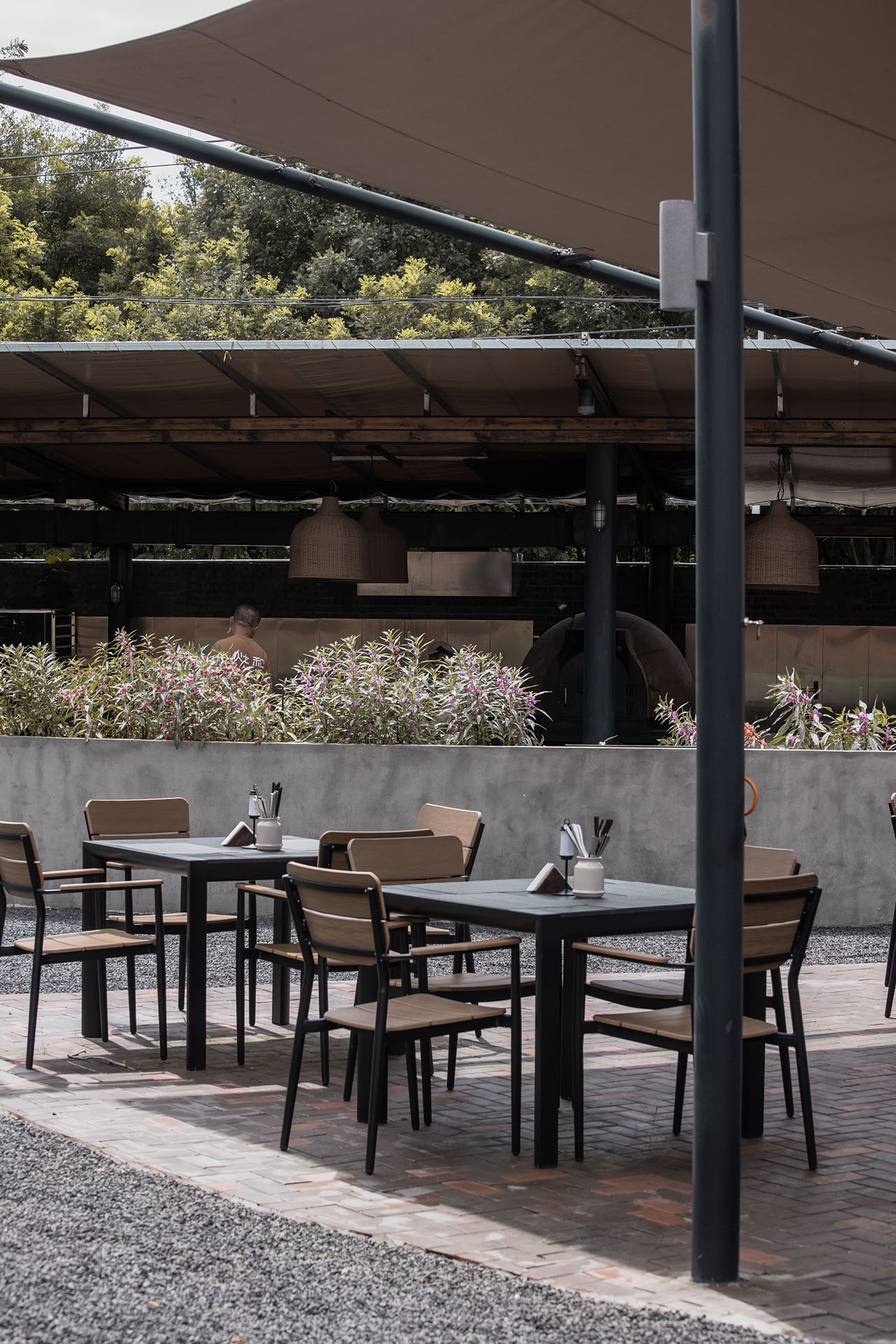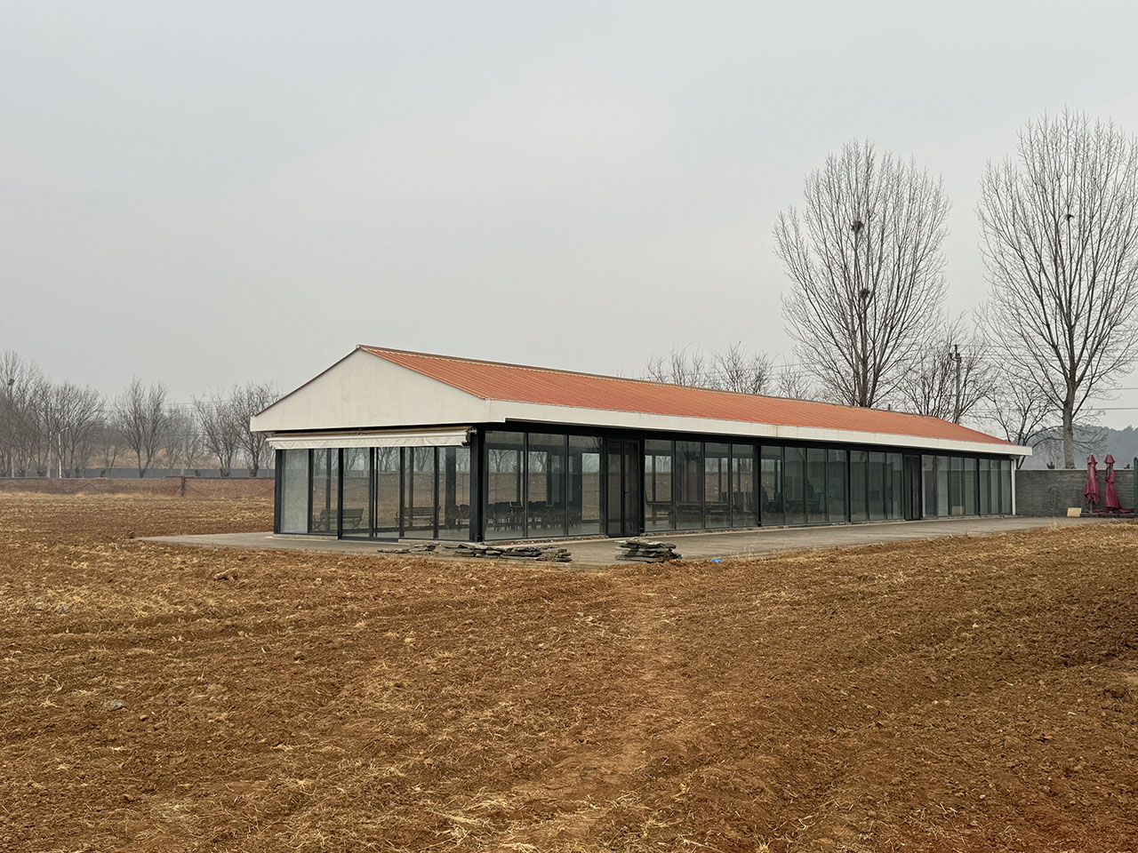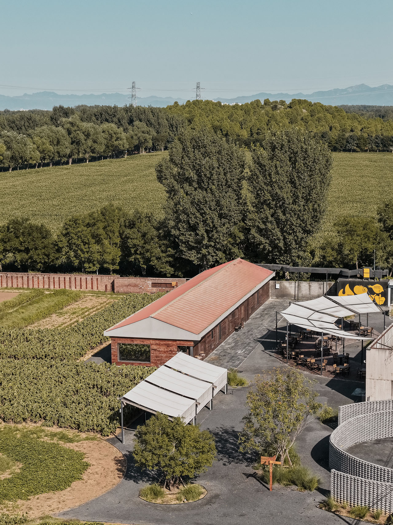 农场的外围墙体由朴素的灰砖构成,简洁的入口引导人们步入。在设计上,半透砖墙以中国传统园林构思,创造流动的视觉空间。阳光透过镂空砖块,洒下斑驳光影,引导游客步入农田。一组平行于建筑的坡顶天幕和扇形的天幕进入视野,形成和原有房屋相呼应的室外就餐区。建筑与周围景致融为一体,层次分明的农作物构成基底,果树、灌木自然点缀其间,呈现沉静而明快的现代乡野景观。