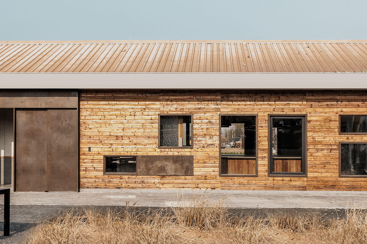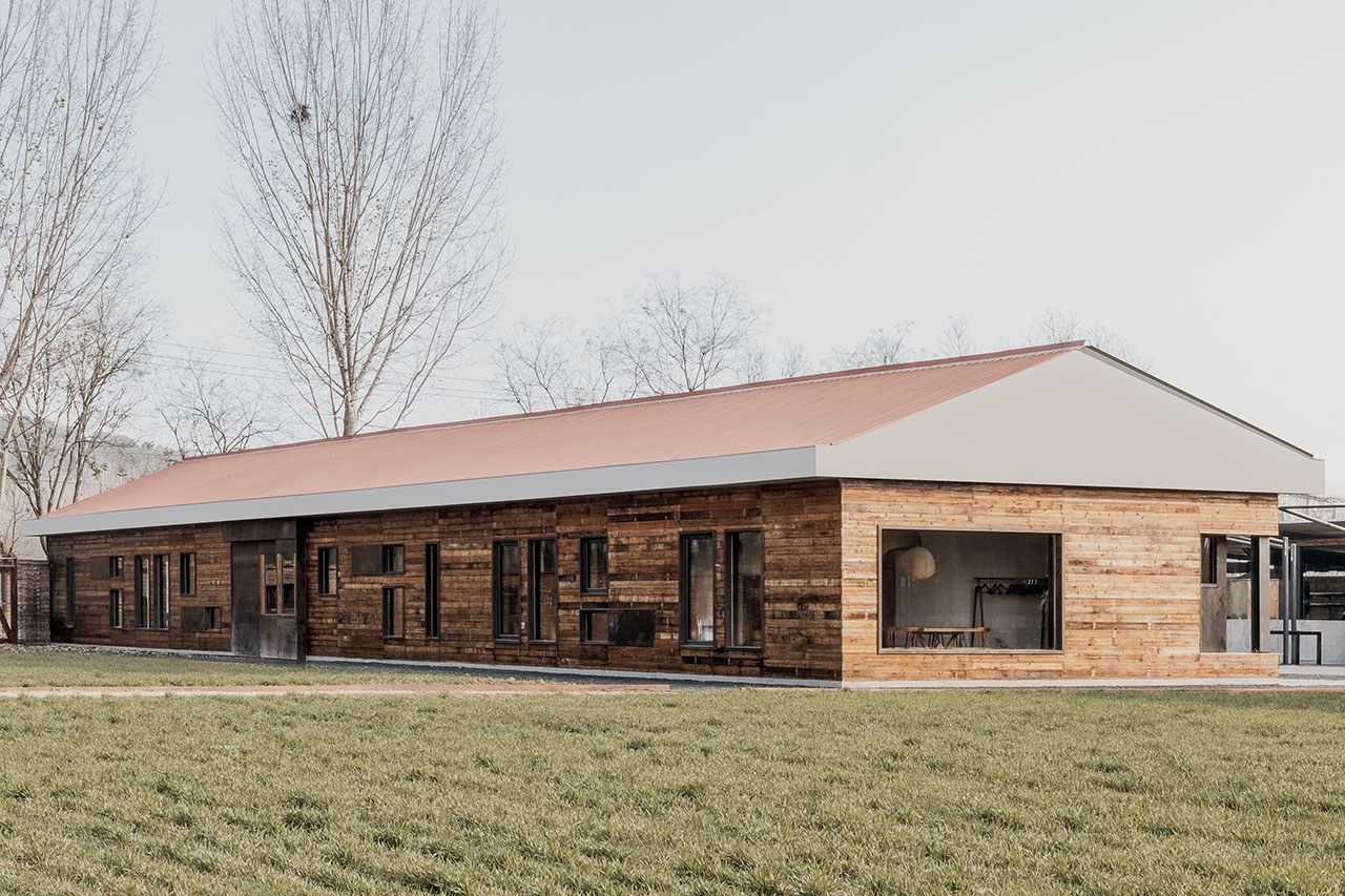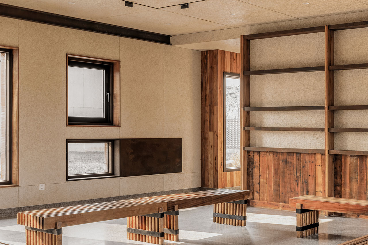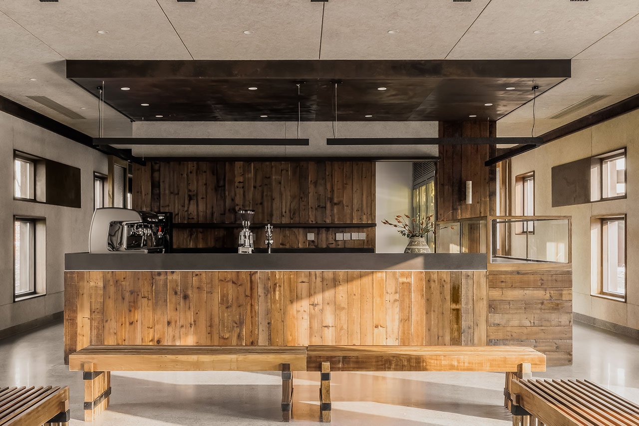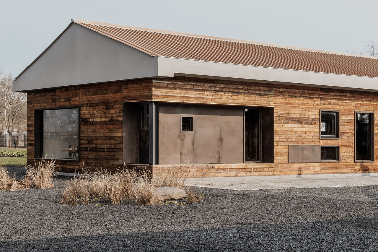 餐厅的改造保留原有钢结构与彩钢屋顶,墙体通过模数化设计,提供良好的冬夏舒适感。南北两侧间隔的横竖开窗,将农场景致引入室内。外立面使用老木头与锈蚀钢板,粗犷质感响应农场生机。室内采用木丝吸音板、旧木与水磨石,营造静谧氛围,与窗外农田相呼应。