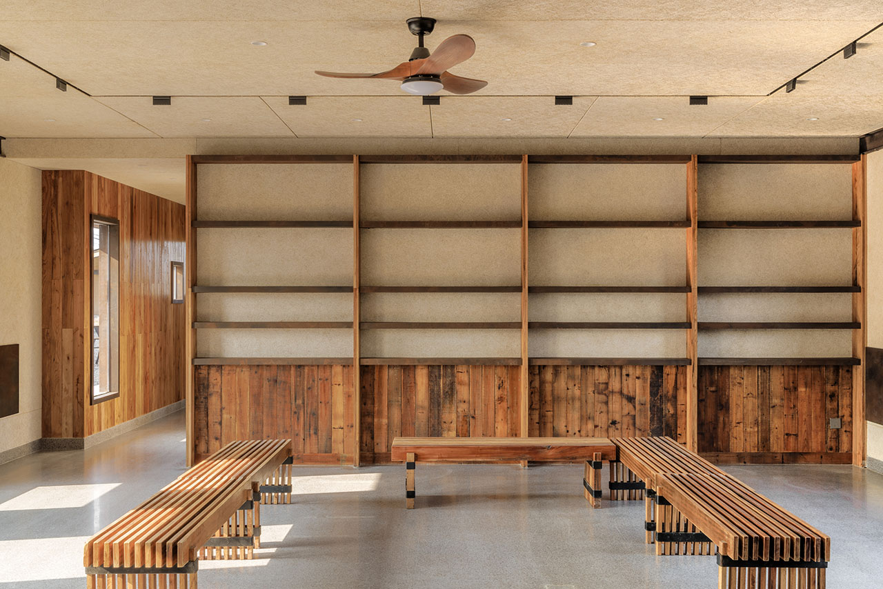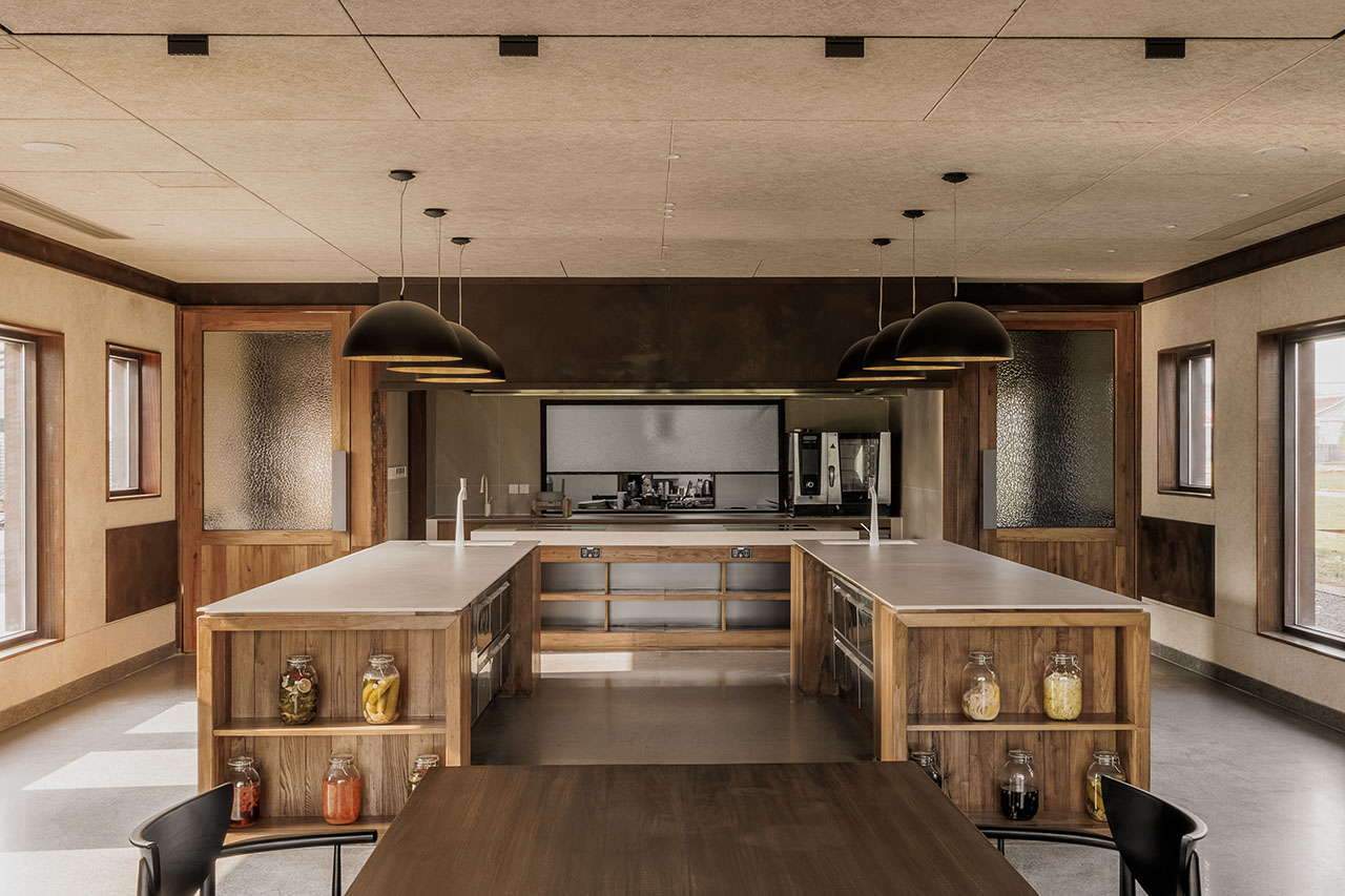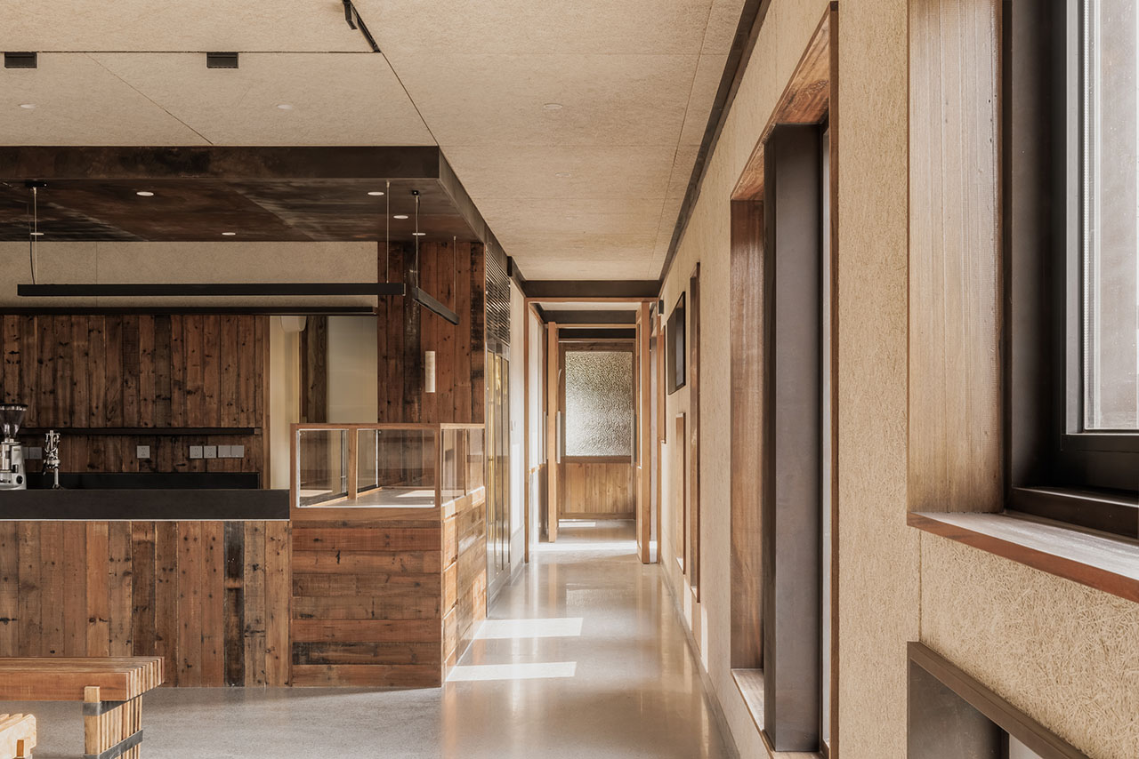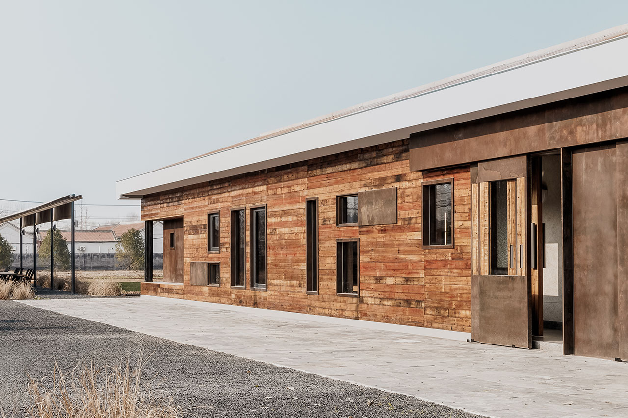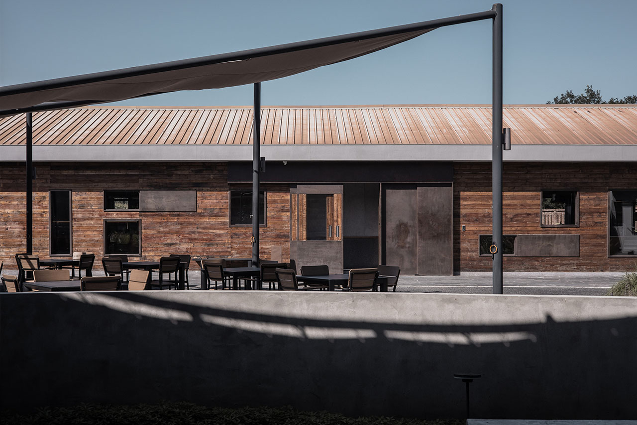 餐厅的改造保留原有钢结构与彩钢屋顶,墙体通过模数化设计,提供良好的冬夏舒适感。南北两侧间隔的横竖开窗,将农场景致引入室内。外立面使用老木头与锈蚀钢板,粗犷质感响应农场生机。室内采用木丝吸音板、旧木与水磨石,营造静谧氛围,与窗外农田相呼应。