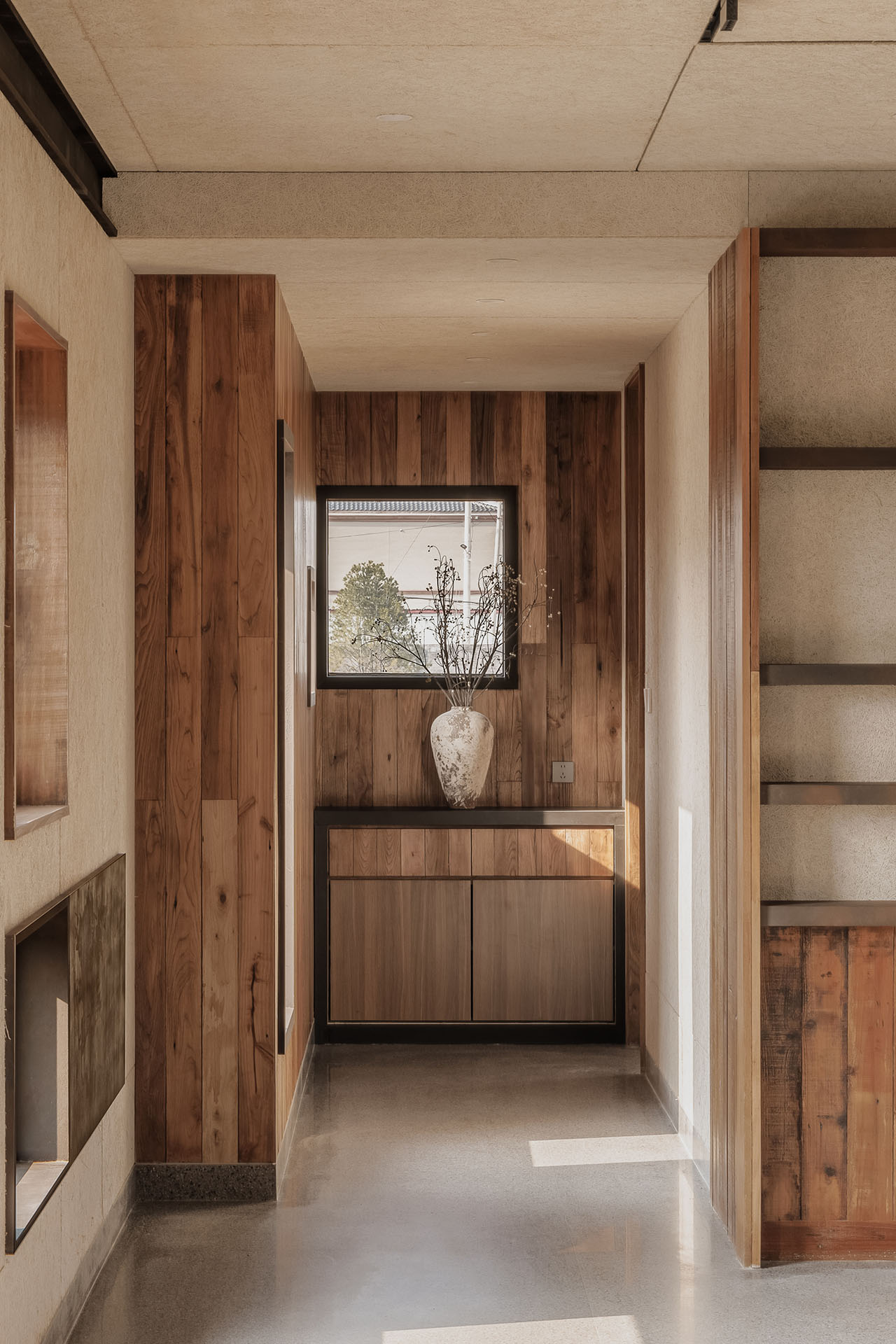 主要材料:木丝吸音板、水磨石、锈蚀钢板、老木头、石英石