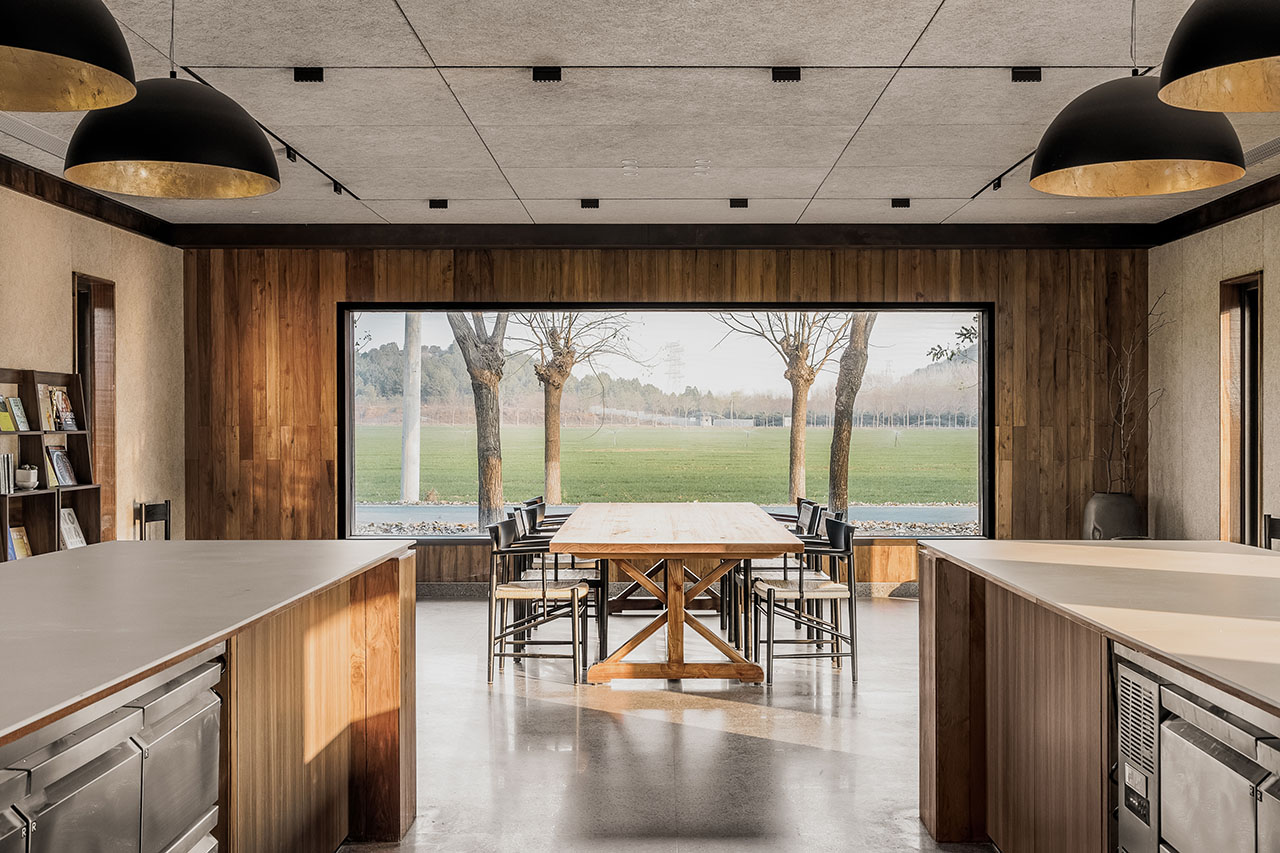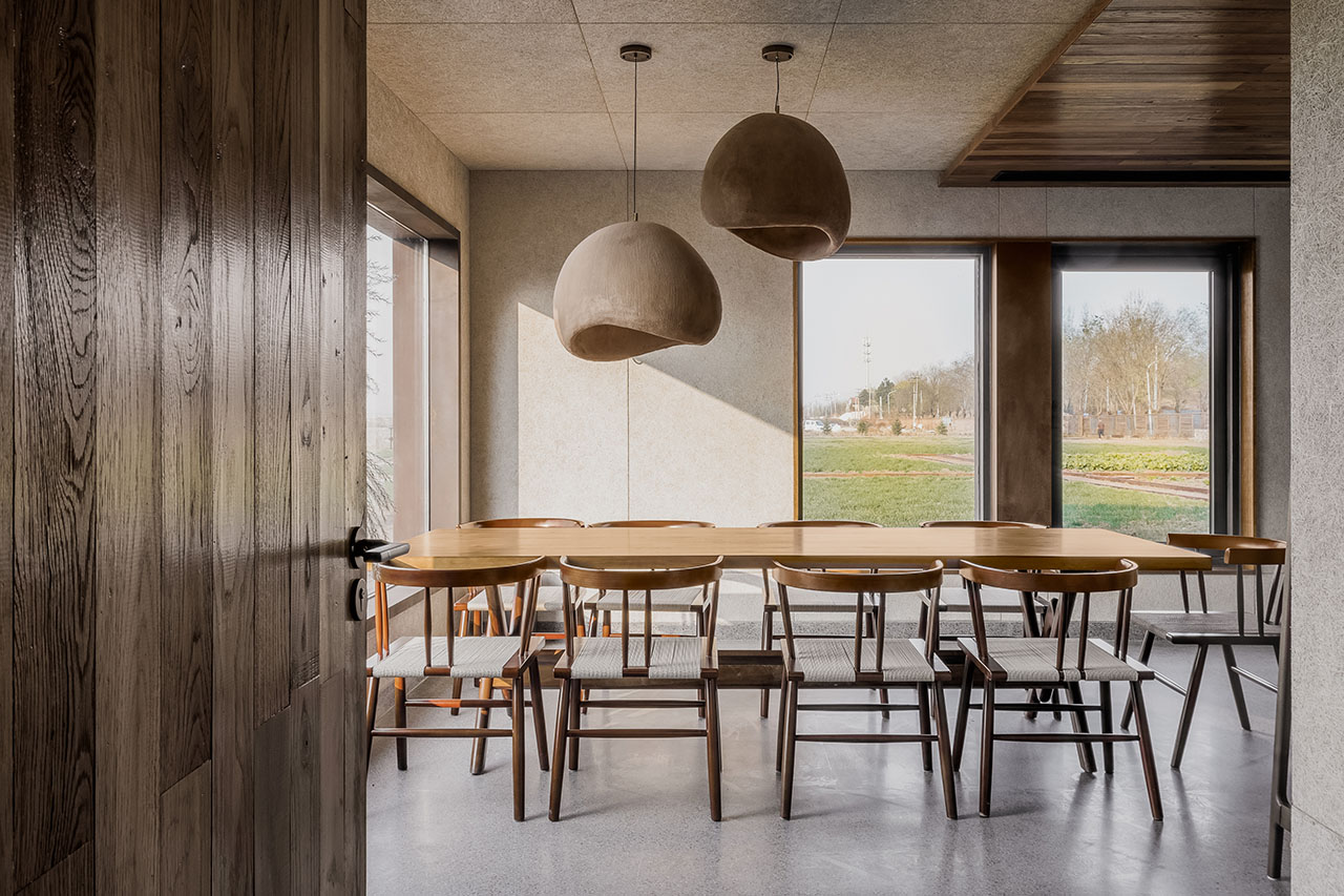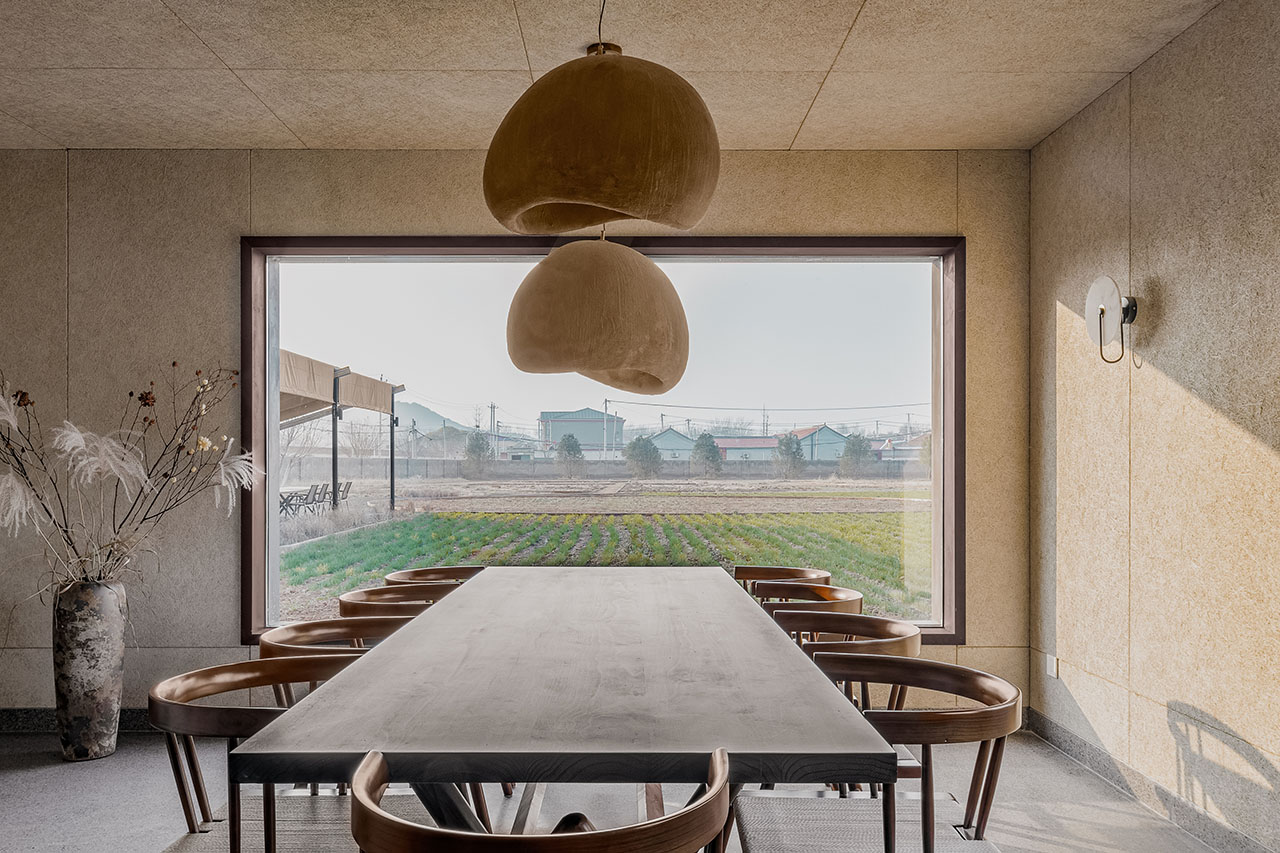 空间布局上,设计团队将交通核心设置在空间中部,南北两侧均可进入,通道门则依据使用需求开合,形成灵活分区。东侧的景观开窗作为视觉焦点,使长桌就餐区仿佛置于田野。西侧设置了咖啡与饮品吧台,朴素有序,而最西端的包厢则为社交、休憩提供了私密空间。
