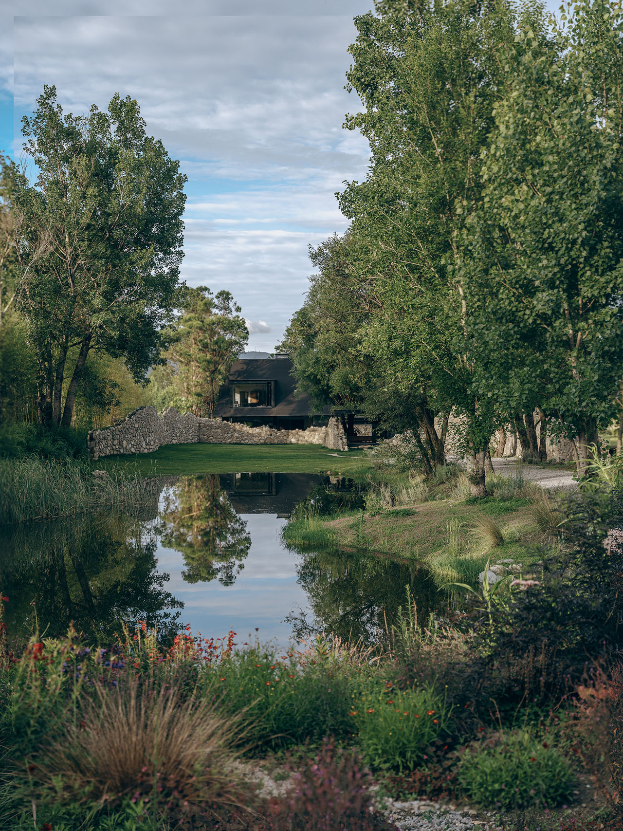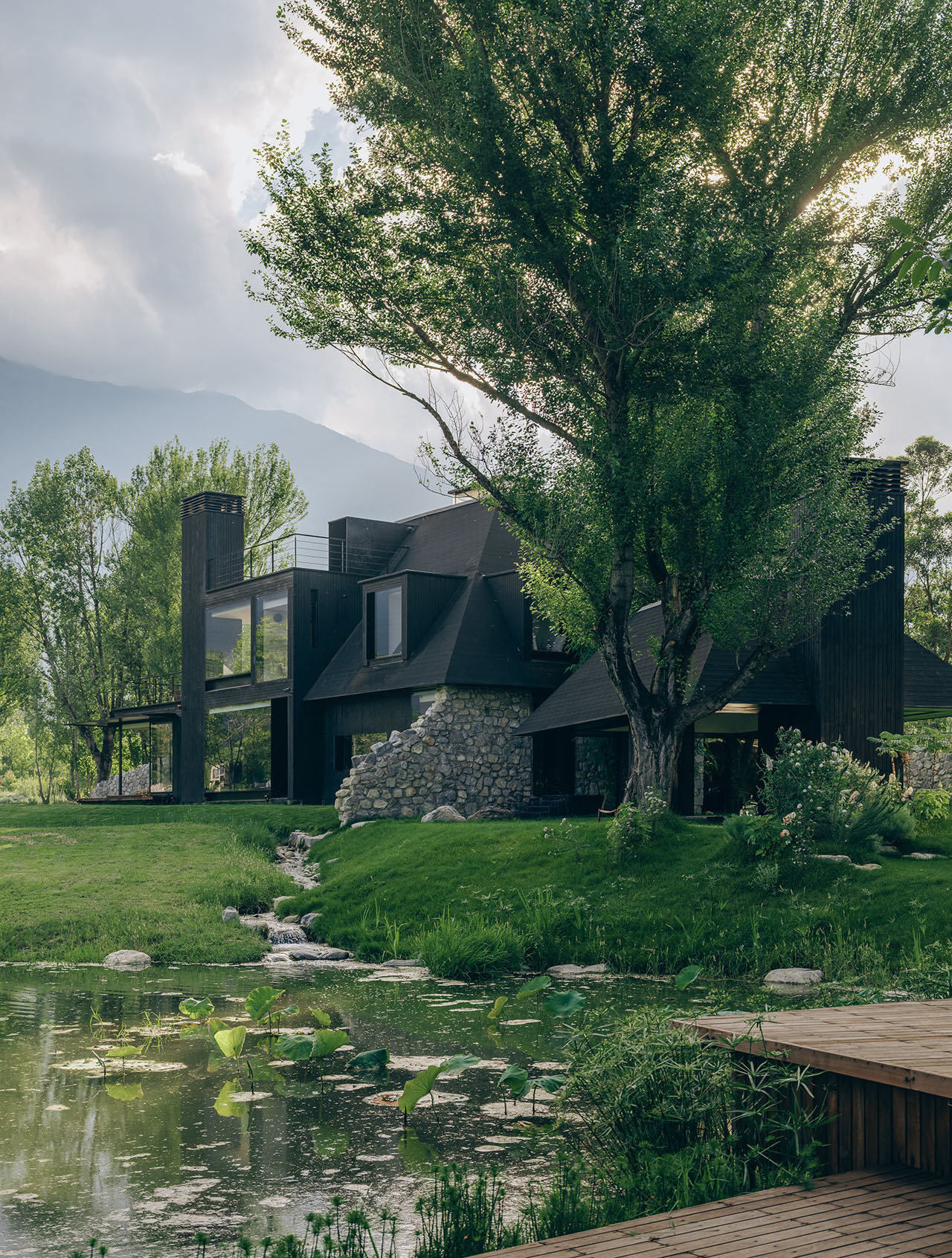 设计以“大地石墙”为骨架,在原建筑占地范围内重塑空间。石墙贯穿室内外,营造多层次院落,借南侧田野的平远之势与西侧水塘的高远之势,衍生两大体验序列:其一从内院经茶室、花园起居室延伸至核桃林,面向开阔苍山;其二从通高餐厅向西,透过草坪、石墙与水塘,框景苍山倒映的纵深景观。
