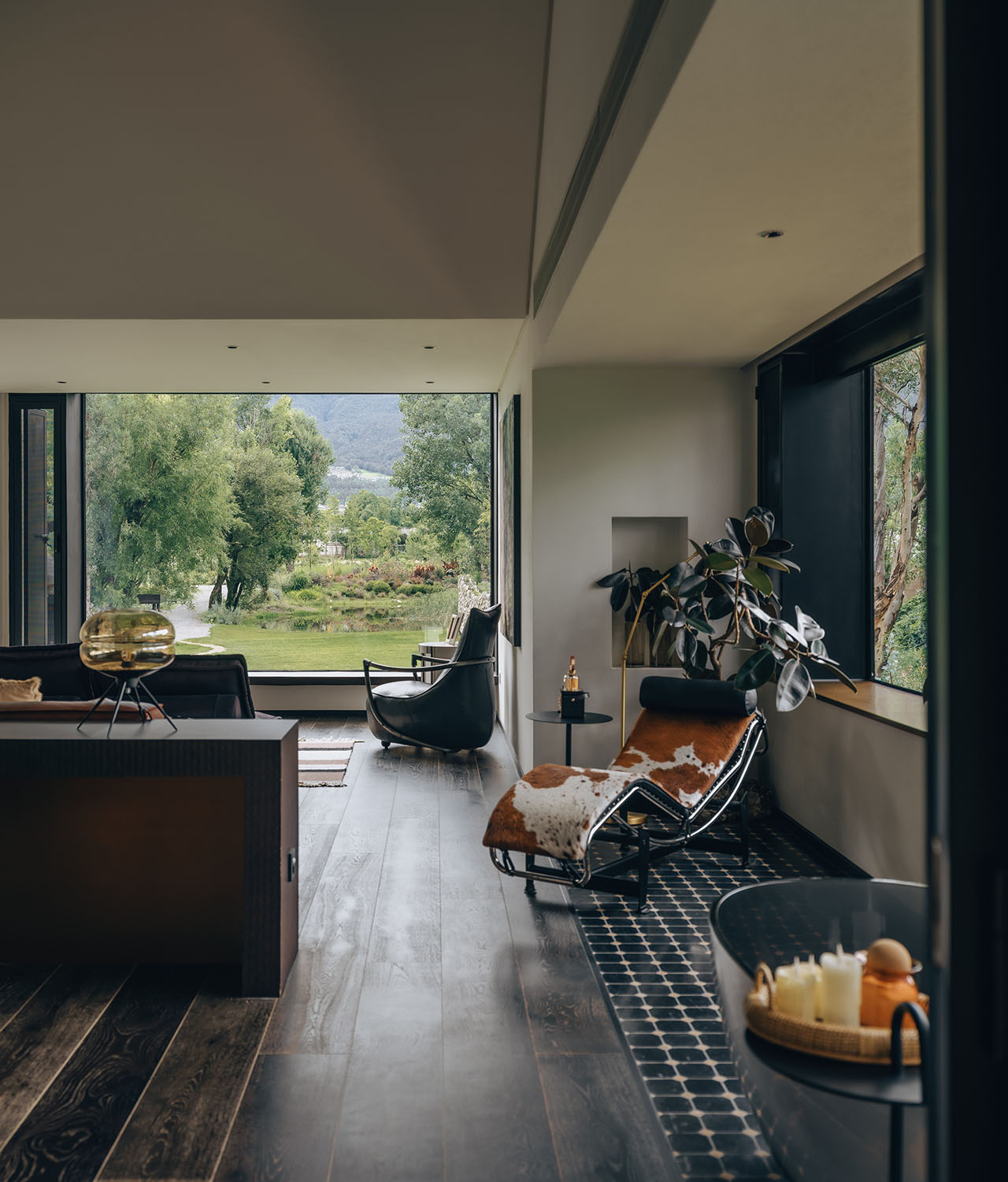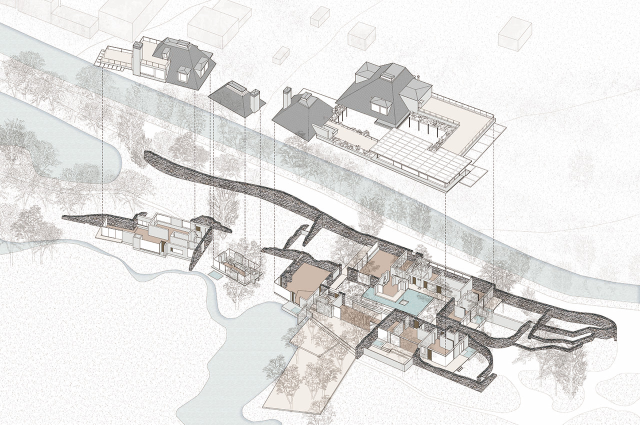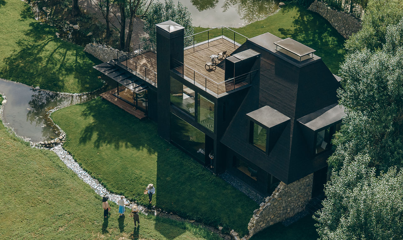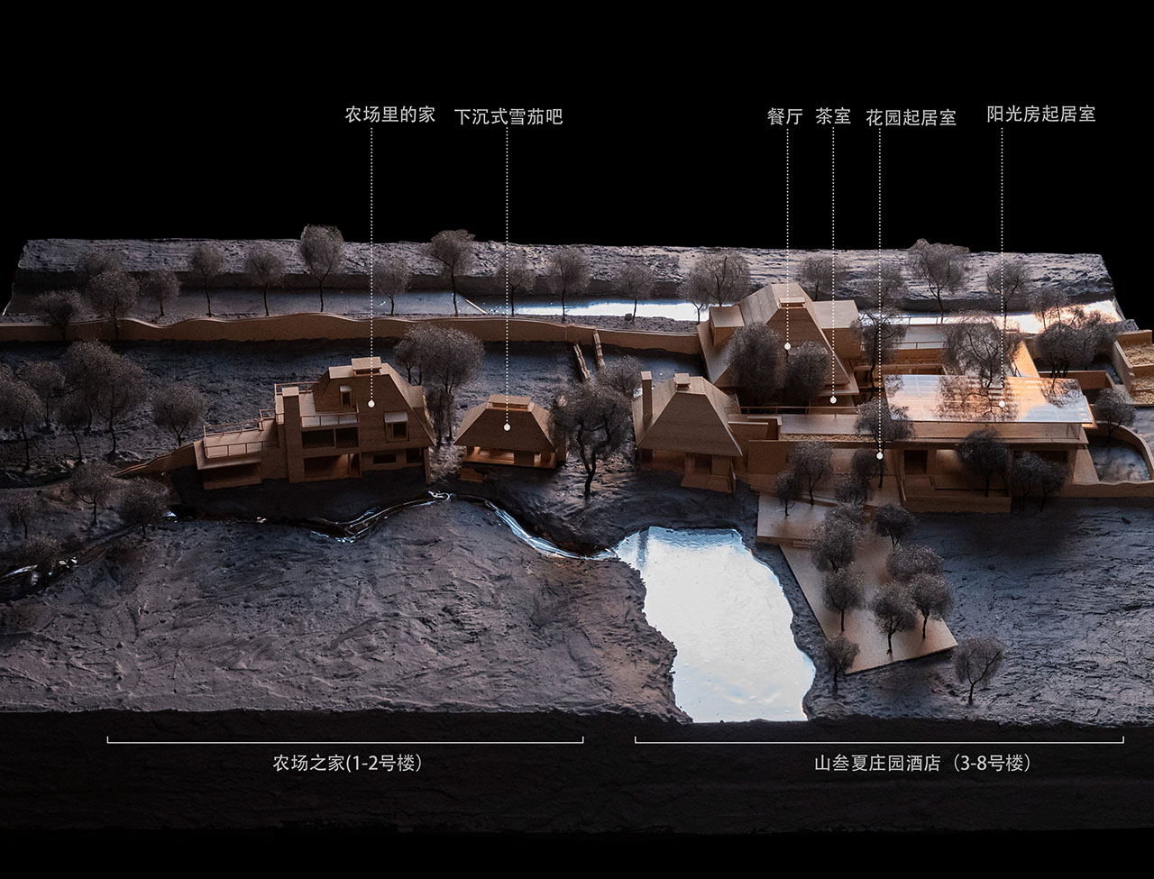建筑包括“农场之家”与“下沉式休闲吧”。前者以坡屋顶与退台平屋顶嵌套,融入天光山景;后者以悬挑坡屋顶打开转角,下沉围合,引山入室。庄园酒店则强调自然主导,建筑作为媒介,引导客人在桉树林入口、内院茶室、通透起居室及仪式感餐厅间游走,体验花园、溪流、农田与苍山的交响。仅设六间客房,各配私密花园,以植物与院落定义起居空间。