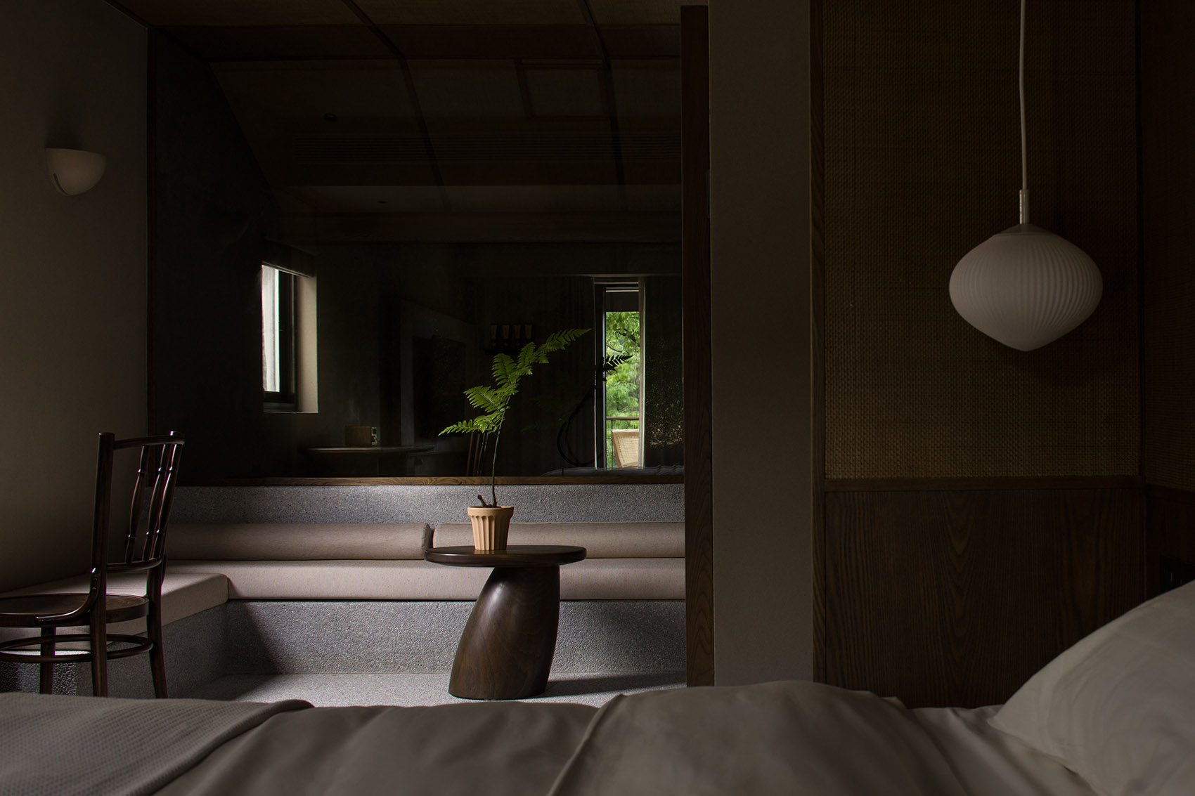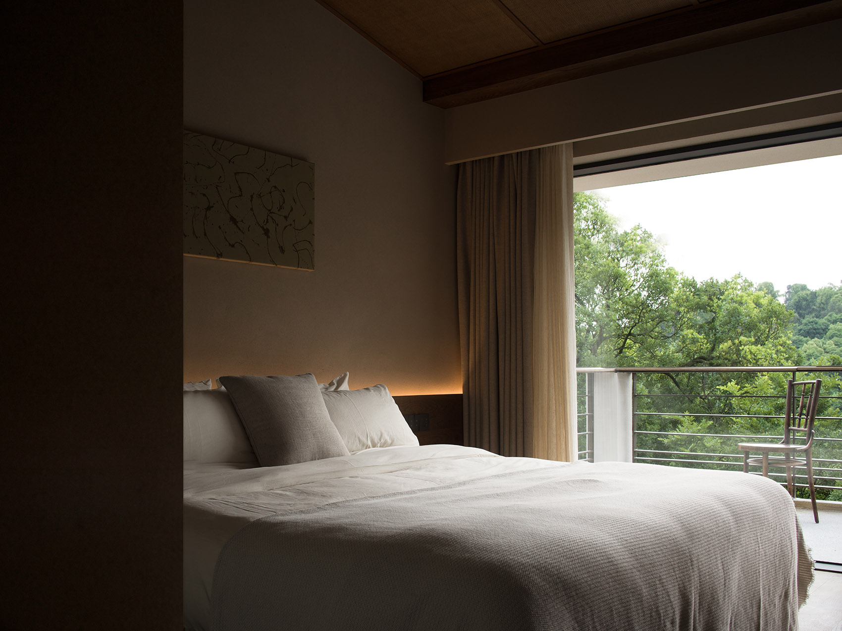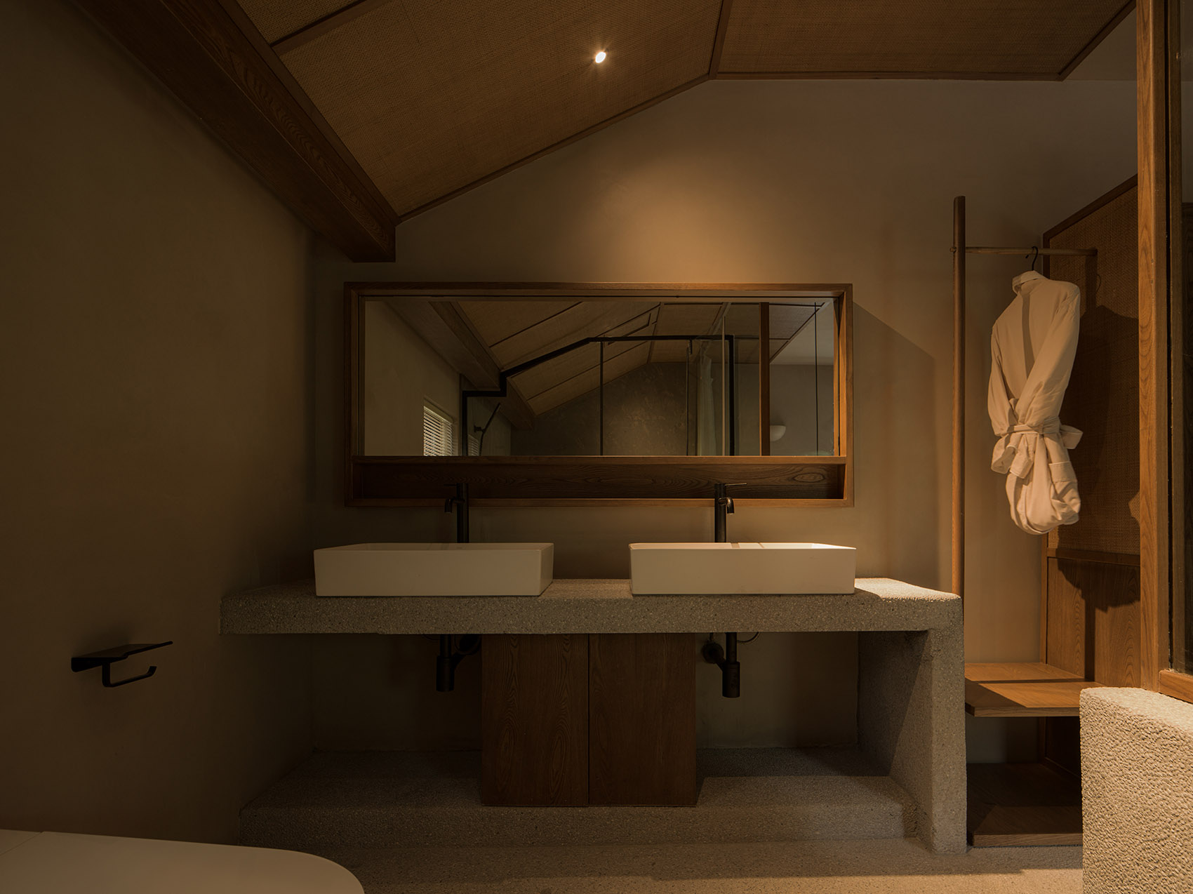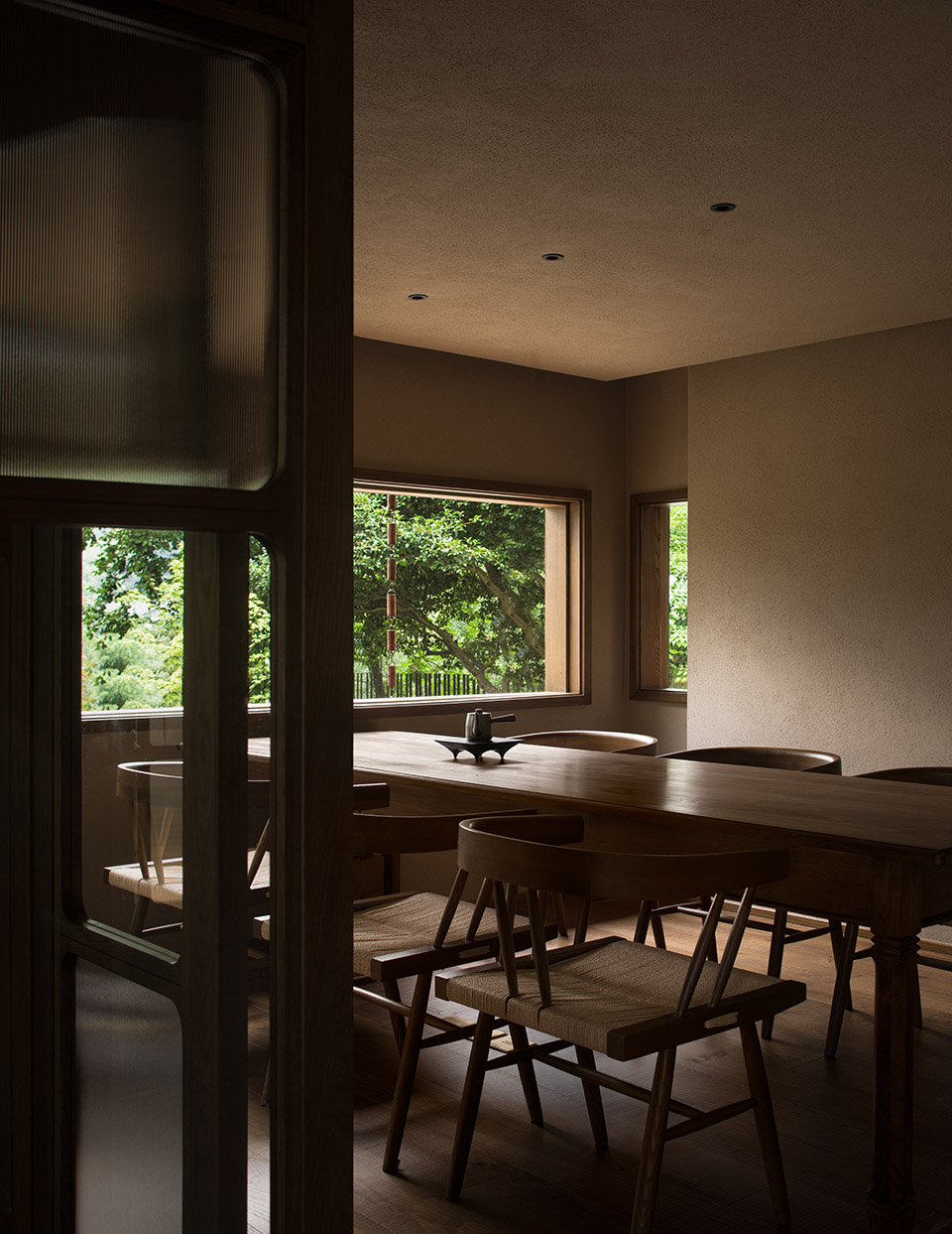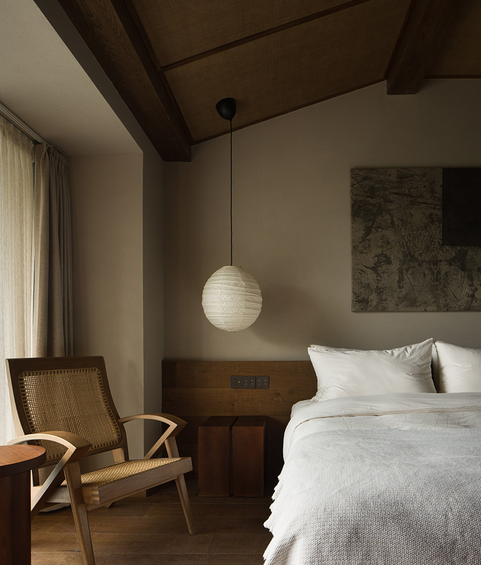公共区域以水洗石地面、砂质艺术漆墙面和木质元素构成宁静基调。散座区饰有本地自然标本,延续山野气息。九间客房秉持松弛温暖的氛围,运用纸艺材质柔化光线,并借窗景营造如山水画般的层次意境。客房在不同时段呈现各异景致:清晨光影轻盈,午后山岚渐起,夜晚则宁静伴随虫鸣水声。