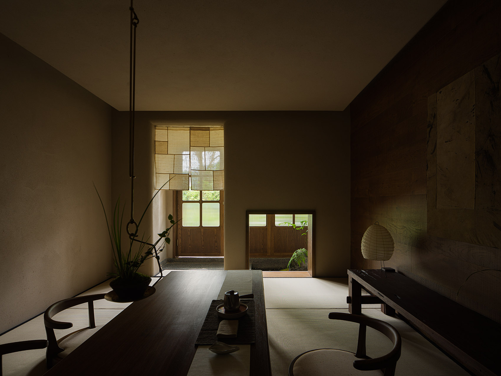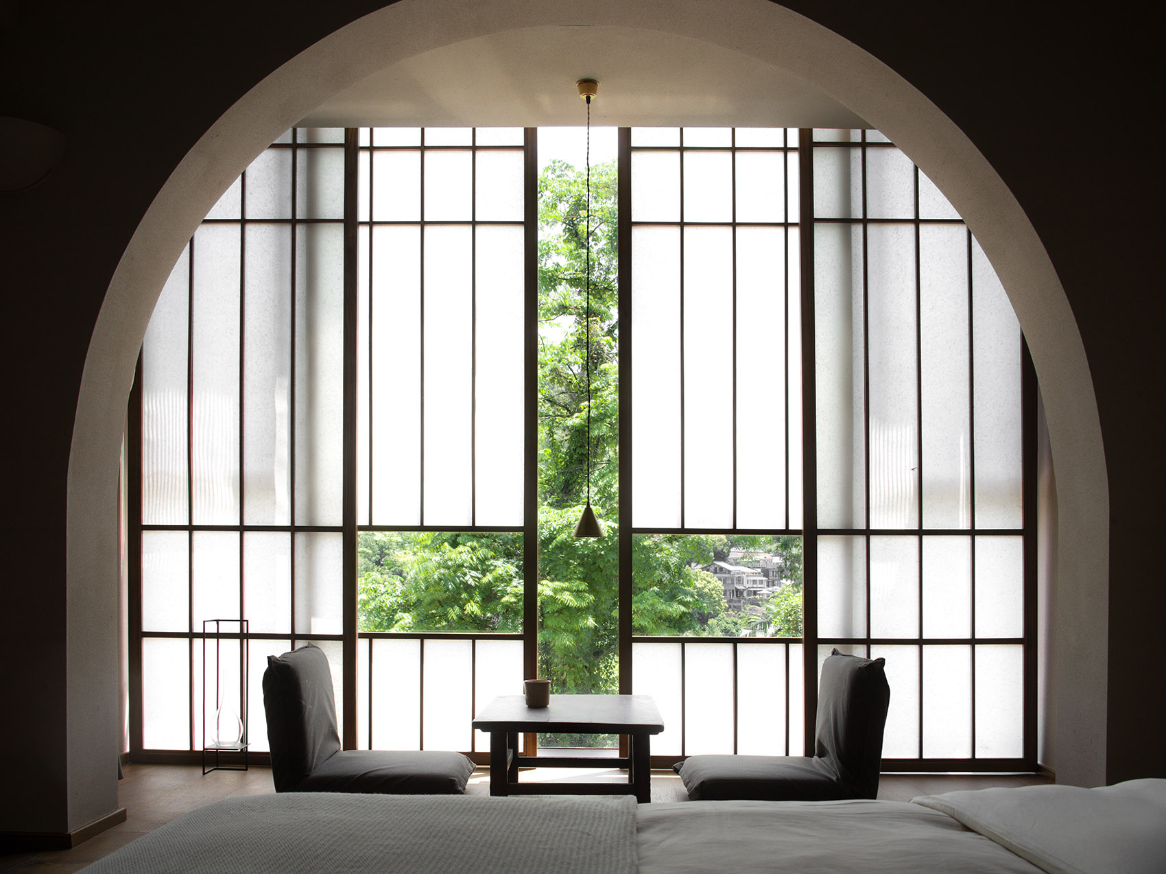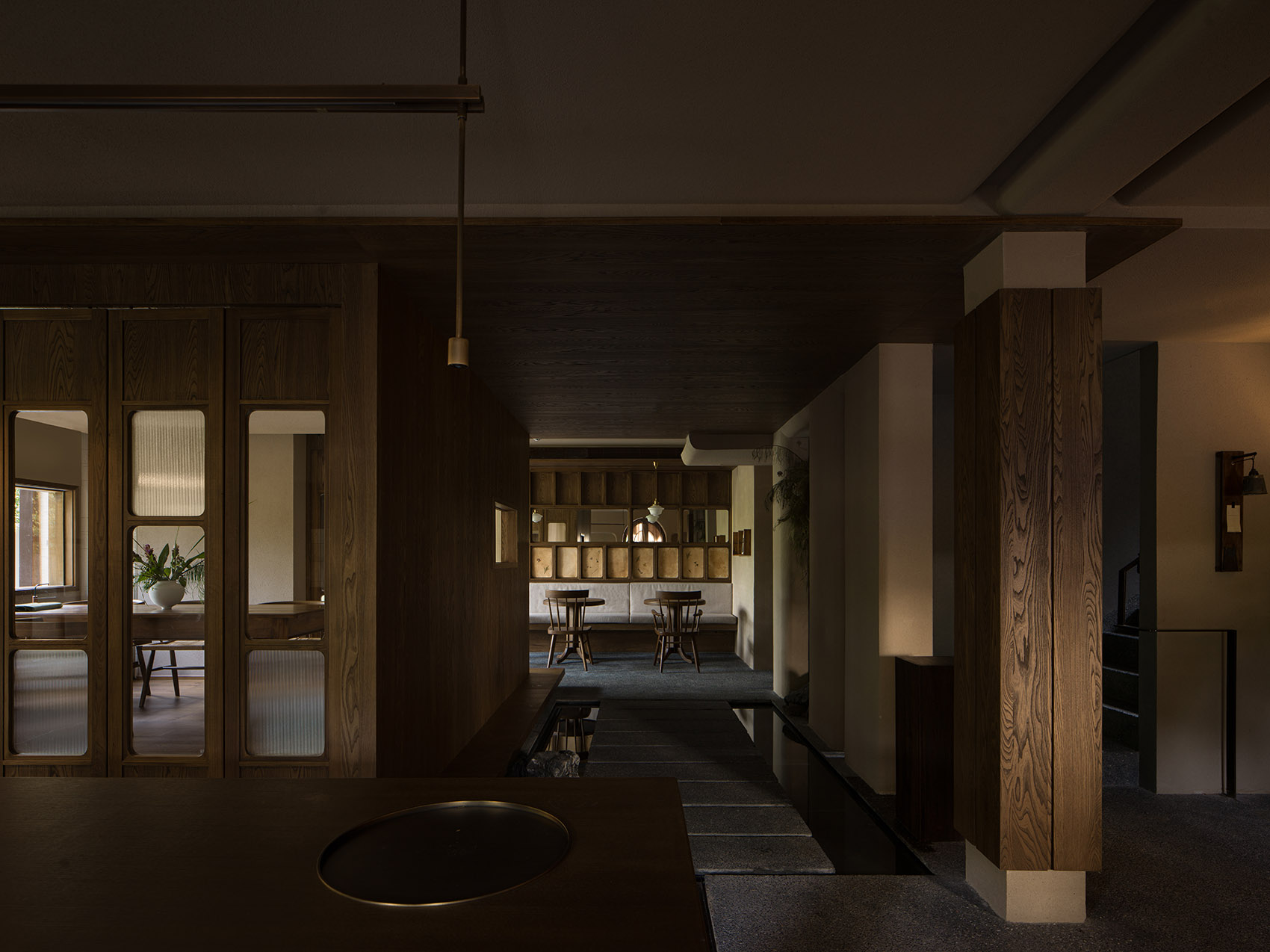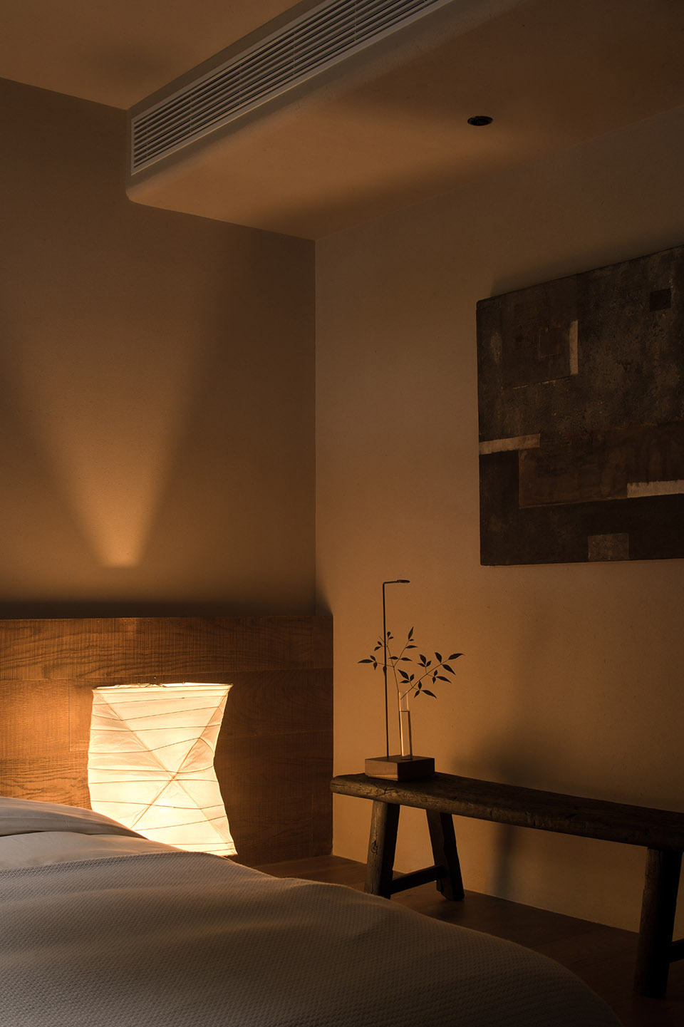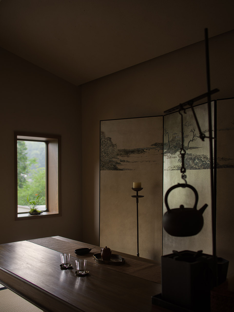 公共区域以水洗石地面、砂质艺术漆墙面和木质元素构成宁静基调。散座区饰有本地自然标本,延续山野气息。九间客房秉持松弛温暖的氛围,运用纸艺材质柔化光线,并借窗景营造如山水画般的层次意境。客房在不同时段呈现各异景致:清晨光影轻盈,午后山岚渐起,夜晚则宁静伴随虫鸣水声。