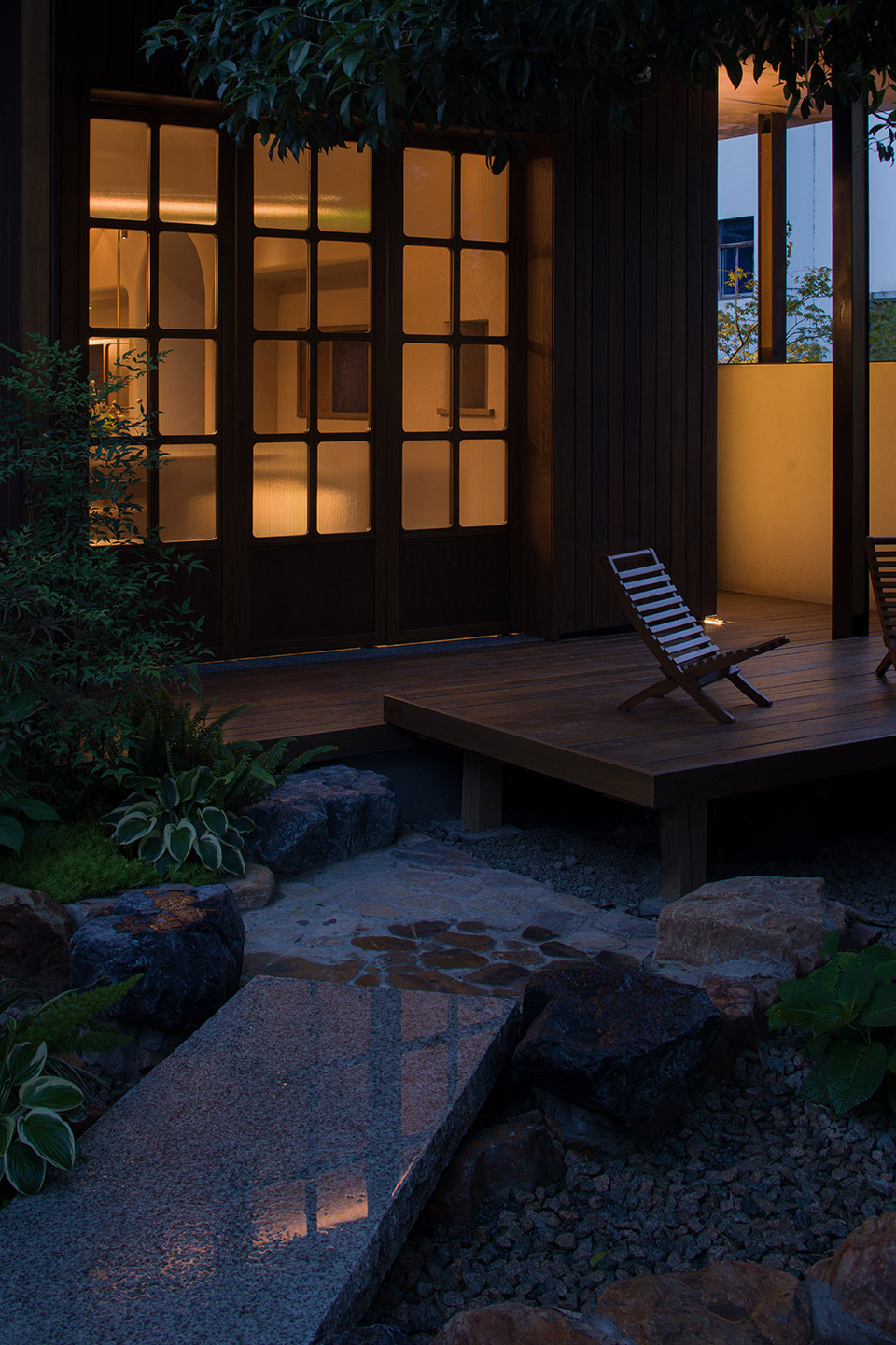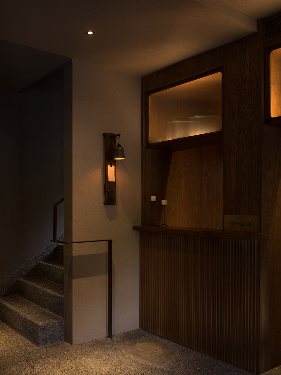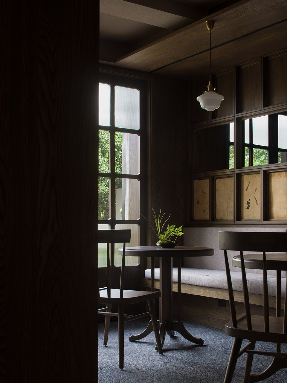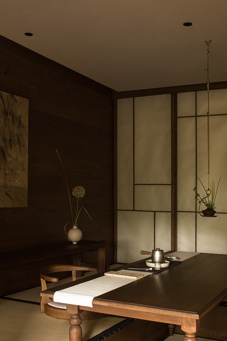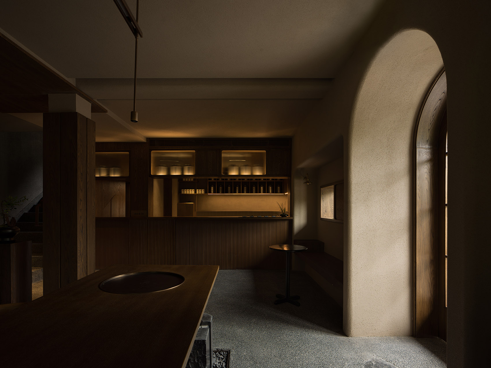 公共区域以水洗石地面、砂质艺术漆墙面和木质元素构成宁静基调。散座区饰有本地自然标本,延续山野气息。九间客房秉持松弛温暖的氛围,运用纸艺材质柔化光线,并借窗景营造如山水画般的层次意境。客房在不同时段呈现各异景致:清晨光影轻盈,午后山岚渐起,夜晚则宁静伴随虫鸣水声。