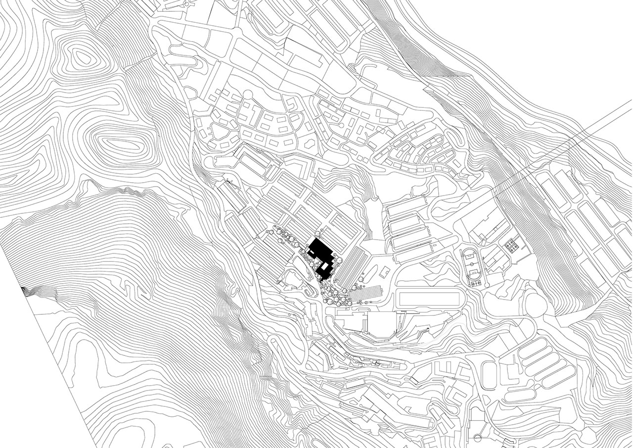 我们的基地位于公路转角,废旧的民房紧贴公路,形成逼仄的城市空间,然而民房的背后一侧是悬崖,有着三十米的高差,河谷景观一览无余。自然之力雄浑强大,然而人们劳作的力量更为持久,双方的对比仿佛锐利的黑白照片。