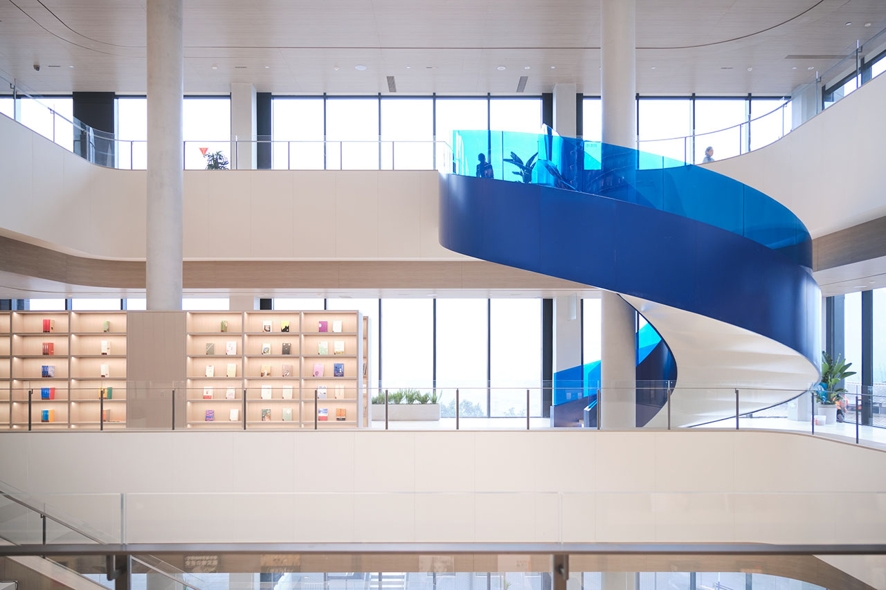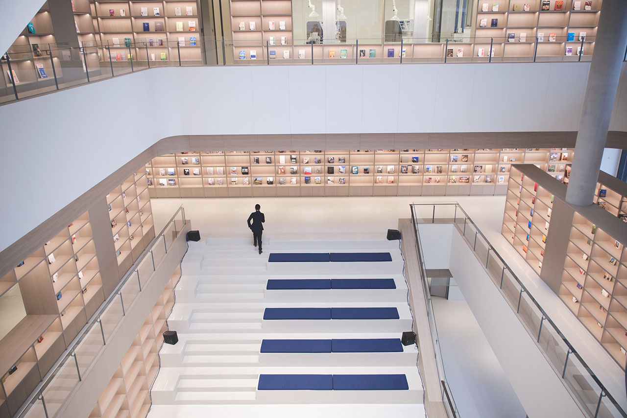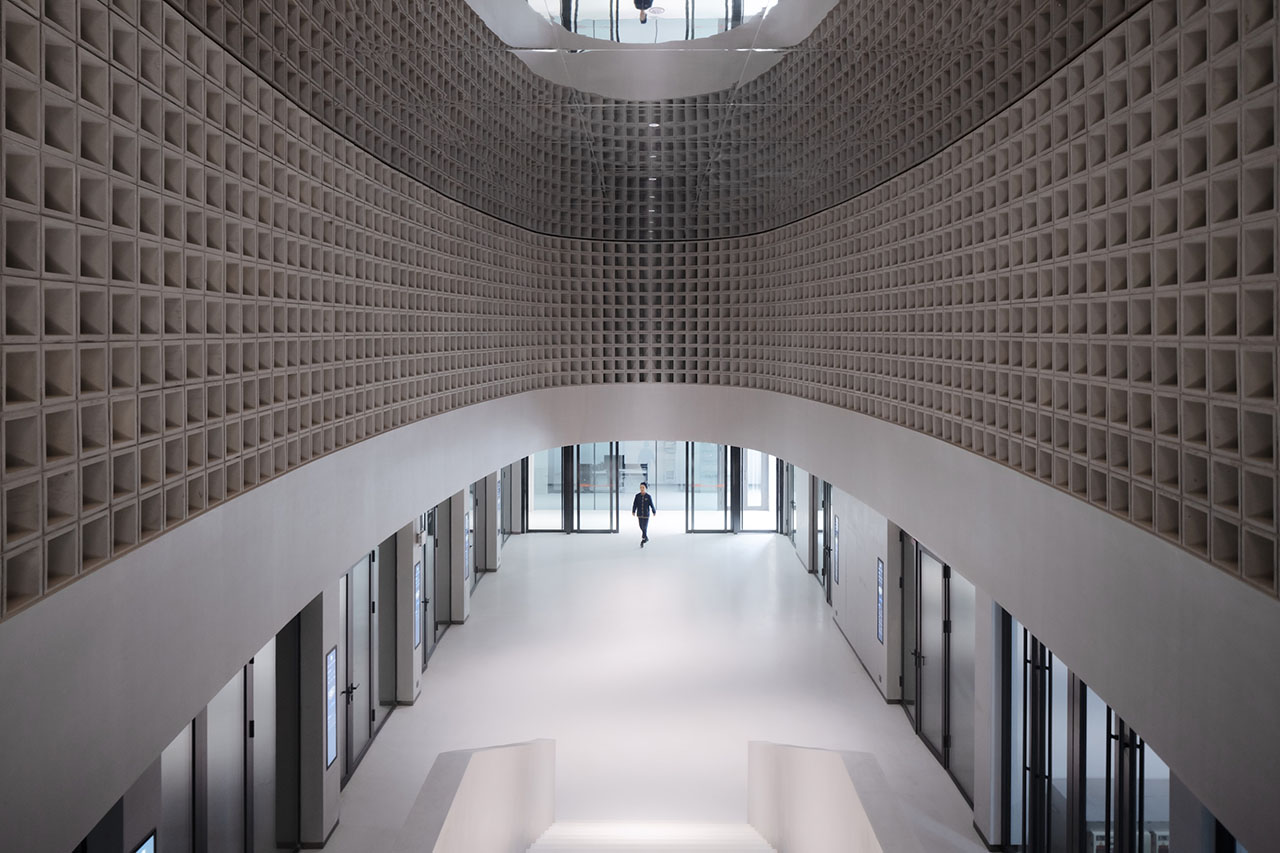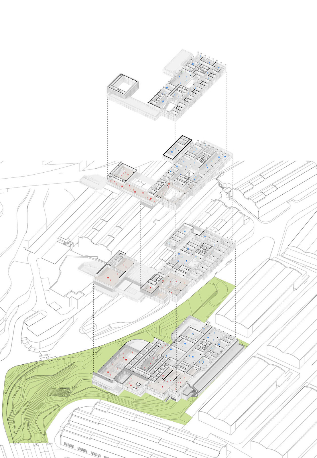 为了消解集中在一起的巨大体量,公园在尽头和层叠分台的建筑融为一体。高差可以让人从建筑的中间层进入,并引入九个大小不一的庭院来改善采光和通风。这些庭院还有独特的意图,其交替出现可以让使用者和参观者感受室内外的变化,进而感知到也许习以为常的自然的力量——空气、湿度、气味在空间中流动。