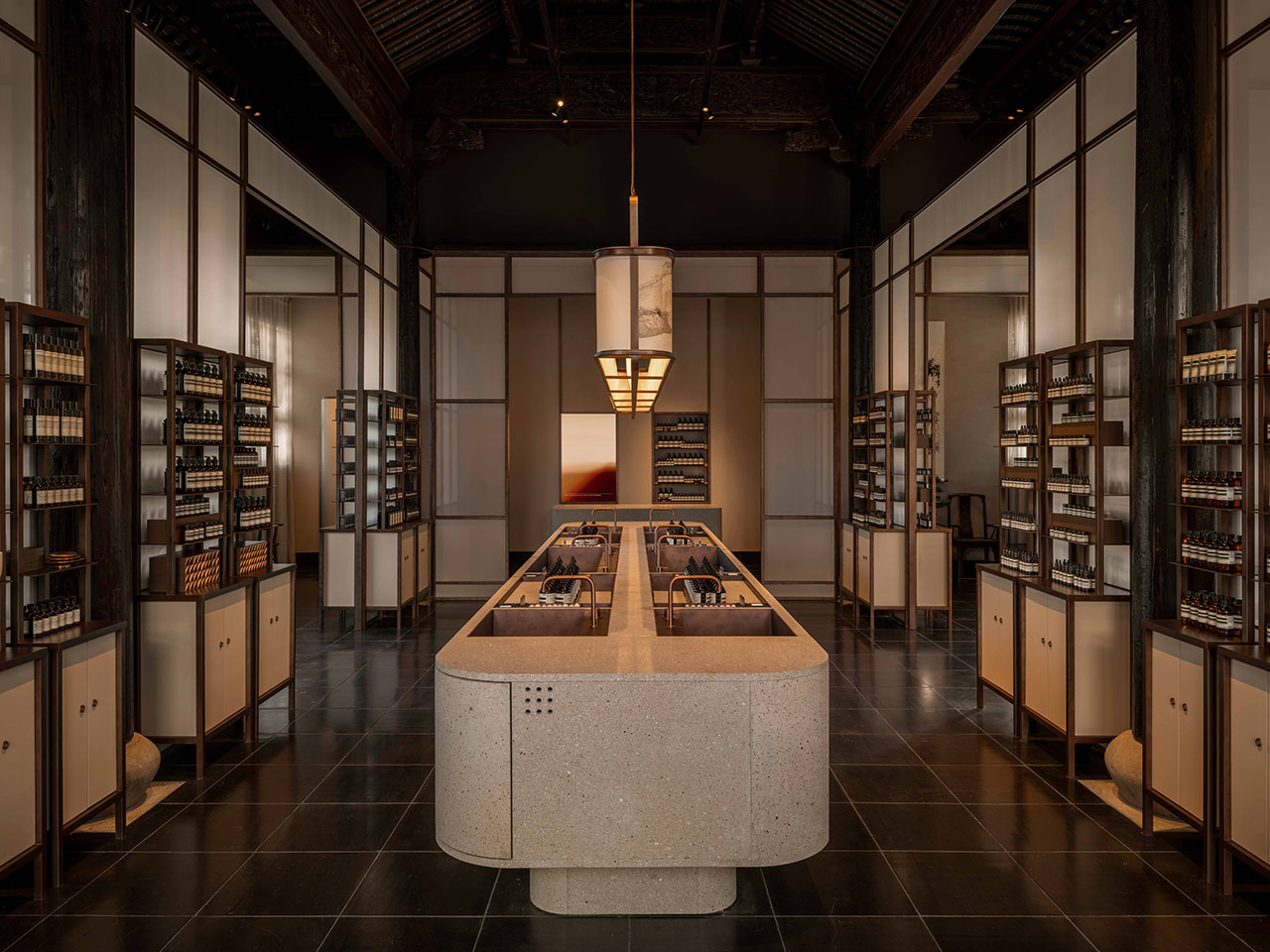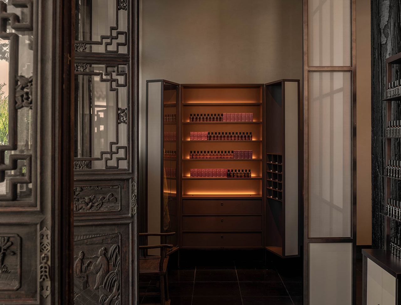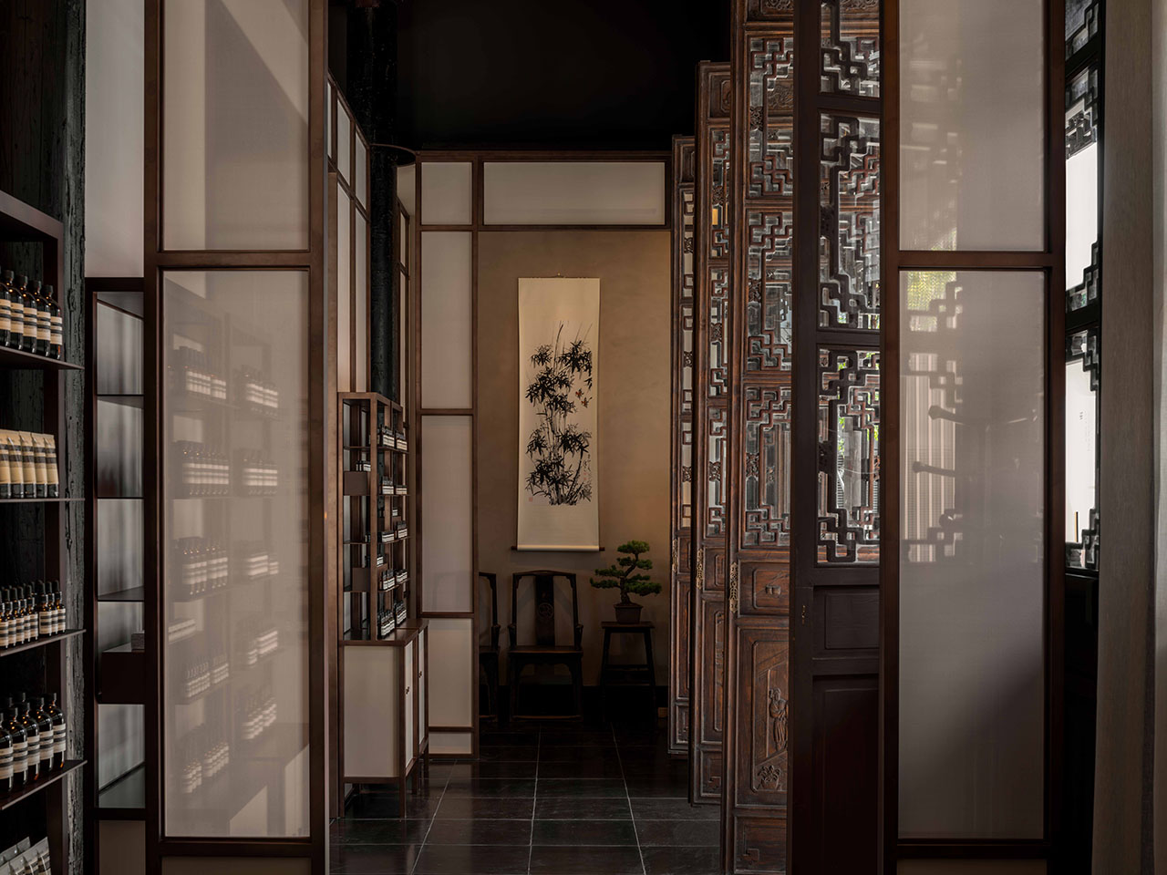 设计的核心在于,在传统建筑之下,重新定义空间,融入现代功能的同时为伊索营造一个具有独特品牌氛围的空间体验。受传统园林建筑的启发,空间分隔的形式灵感来源于“罩”,这一典型园林室内构件将空间划分为核心的“厅”与四周的“室”——“厅”是开放的,承载了社交属性,也兼具一定的仪式感;“室”则更多意味着包裹性的私密体验。这两种空间属性与伊索的空间需求不谋而合。
