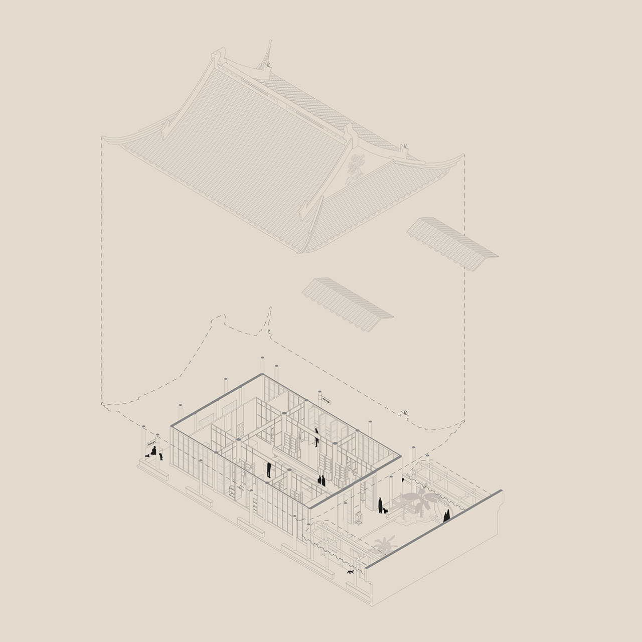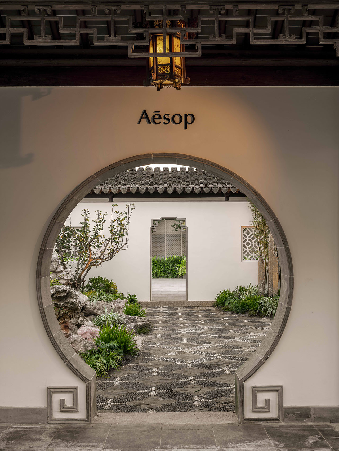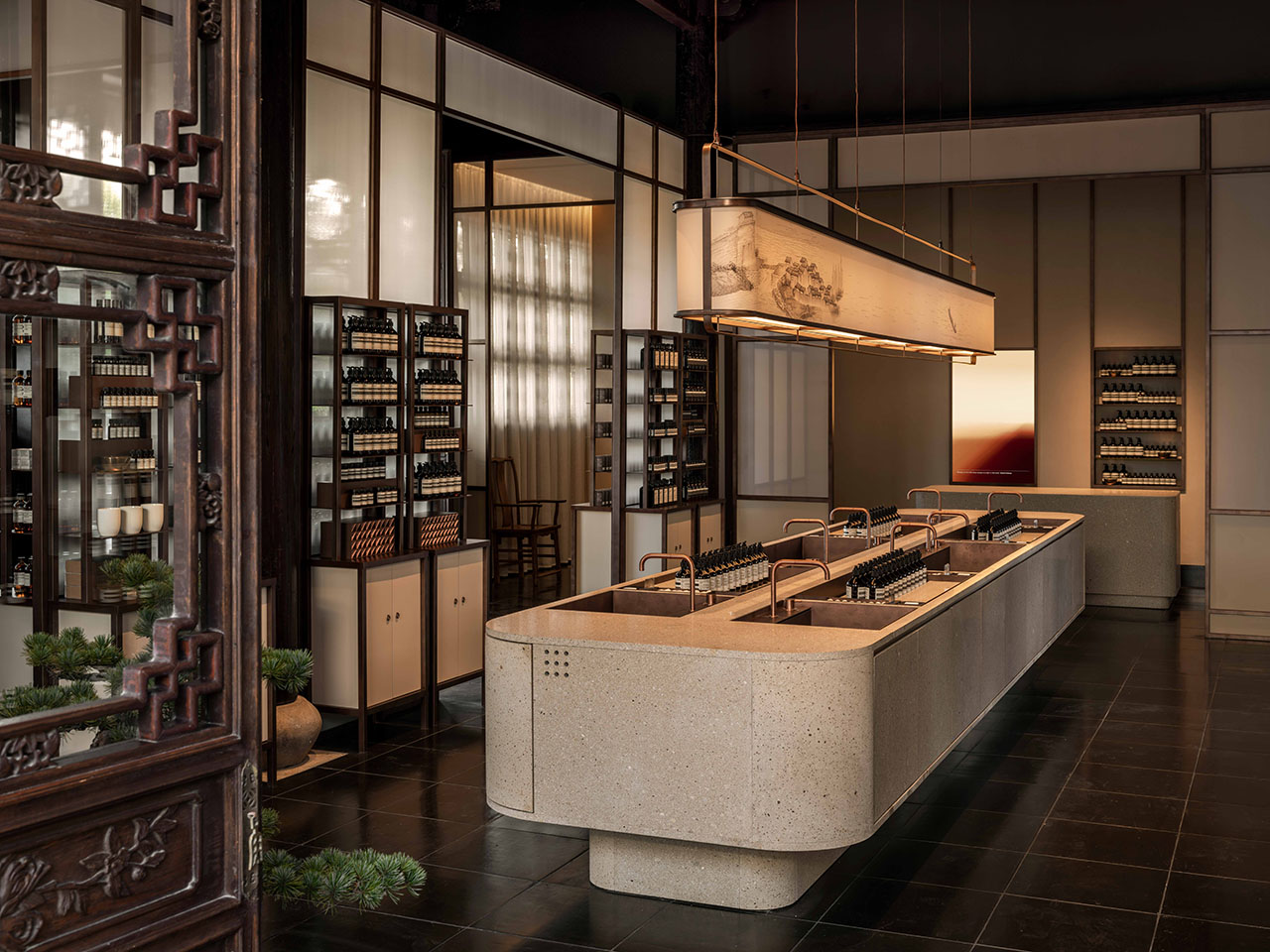 设计的核心在于,在传统建筑之下,重新定义空间,融入现代功能的同时为伊索营造一个具有独特品牌氛围的空间体验。受传统园林建筑的启发,空间分隔的形式灵感来源于“罩”,这一典型园林室内构件将空间划分为核心的“厅”与四周的“室”——“厅”是开放的,承载了社交属性,也兼具一定的仪式感;“室”则更多意味着包裹性的私密体验。这两种空间属性与伊索的空间需求不谋而合。