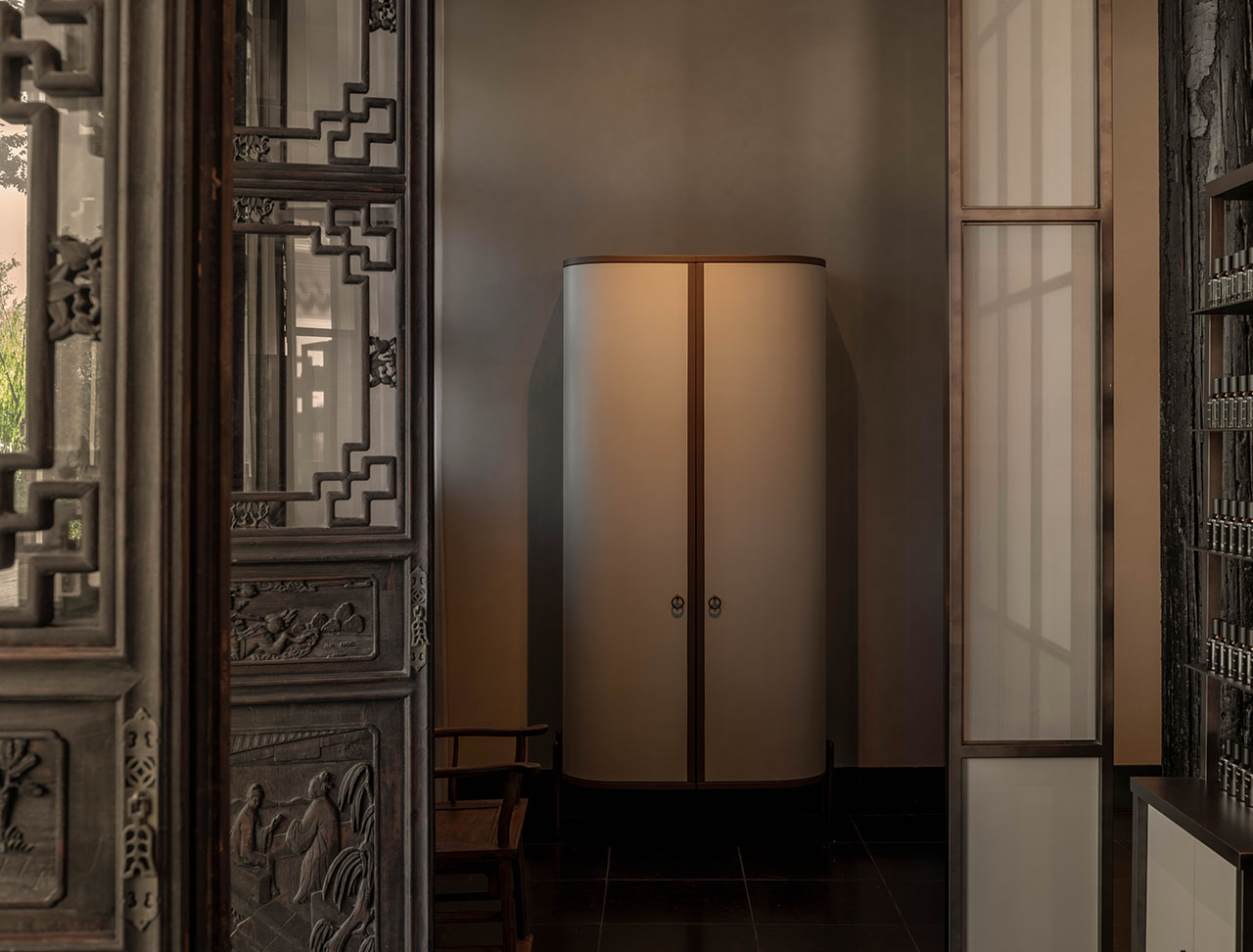 “室”的深处,一个简洁优雅的香氛衣柜如同神秘的宝匣,吸引人们上前一探究竟。柜身被纤细的支座轻巧地托起,柜门上点缀着小巧精致的铜环把手,是对传统明清家具的呼应。精心挑选的清代老家具在空间中随处可见,不仅减少了对新资源的索取,也让这些旧物件焕发出新的生命。