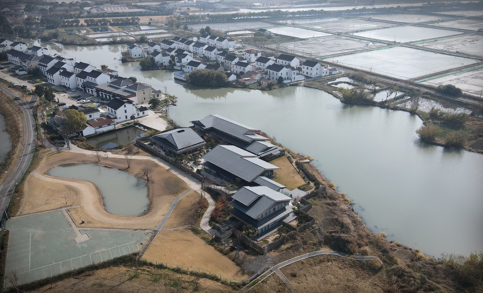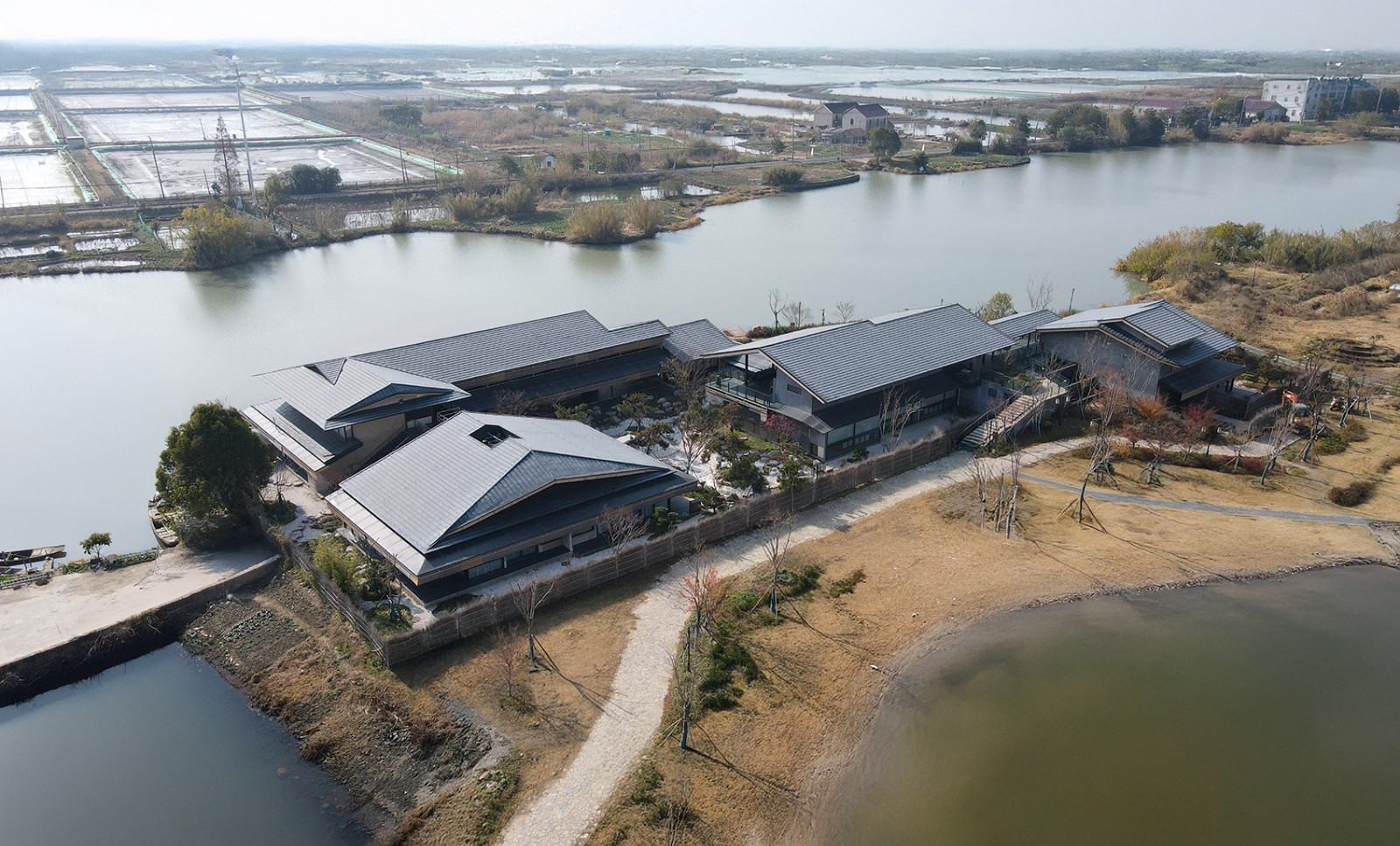 阳澄湖北岸,消泾村静卧于蟹池环绕的洼地。建筑沿河平行展开,平缓屋顶与深檐引导湖风穿堂入室,水面波光经檐下折射,在室内泛起粼粼光影。