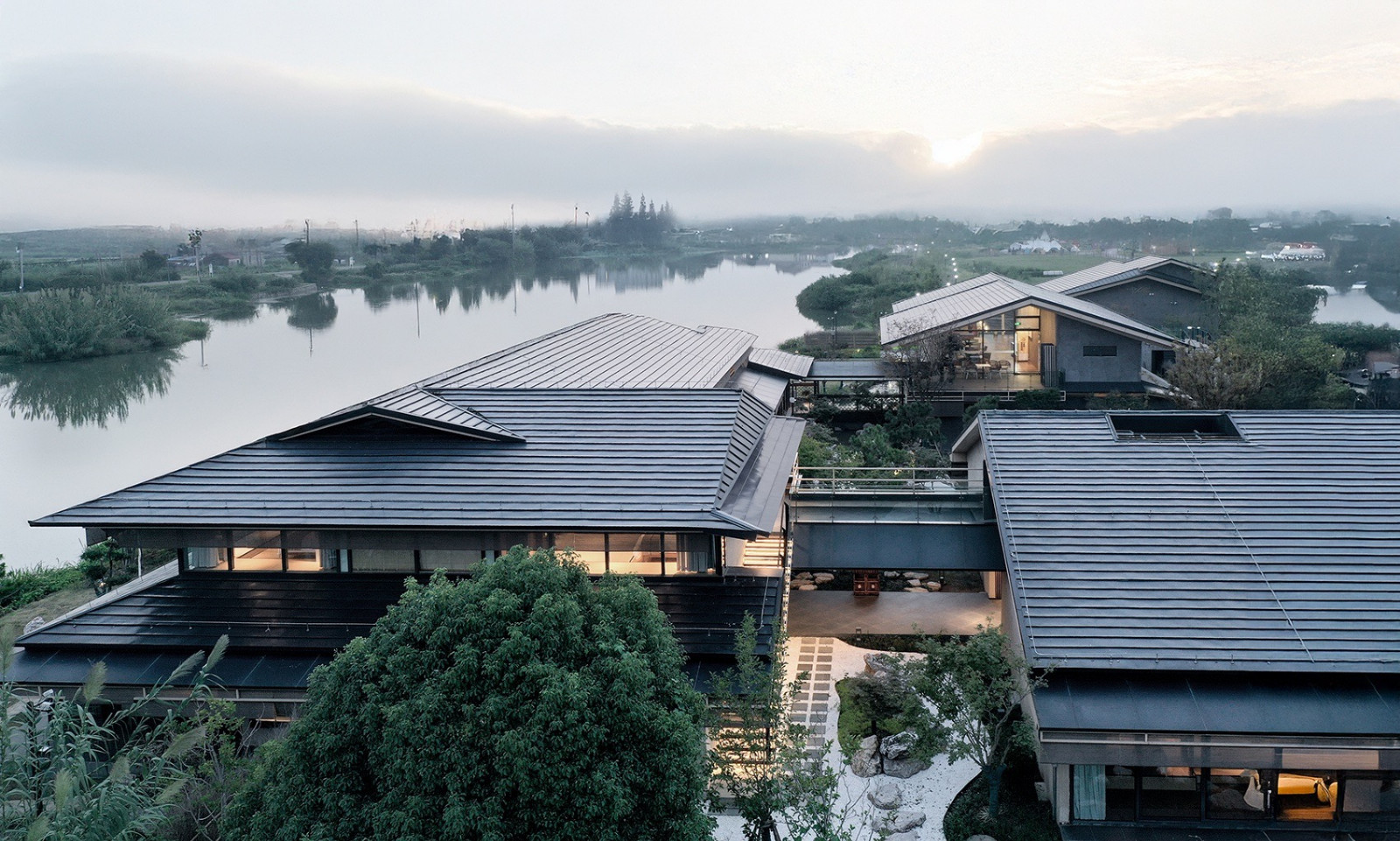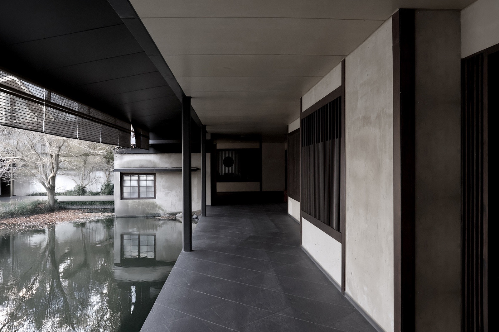 外墙以当地土壤烧制硅藻泥,随岁月沉淀色泽,默默调节着湖畔的湿度。18间客房通过雁行式回廊相连,如一座座独立小院错落布局。回廊环绕两座水池庭院,每走一步,视线都在变化——借景、框景,将南侧小河与自然风貌纳入其中。